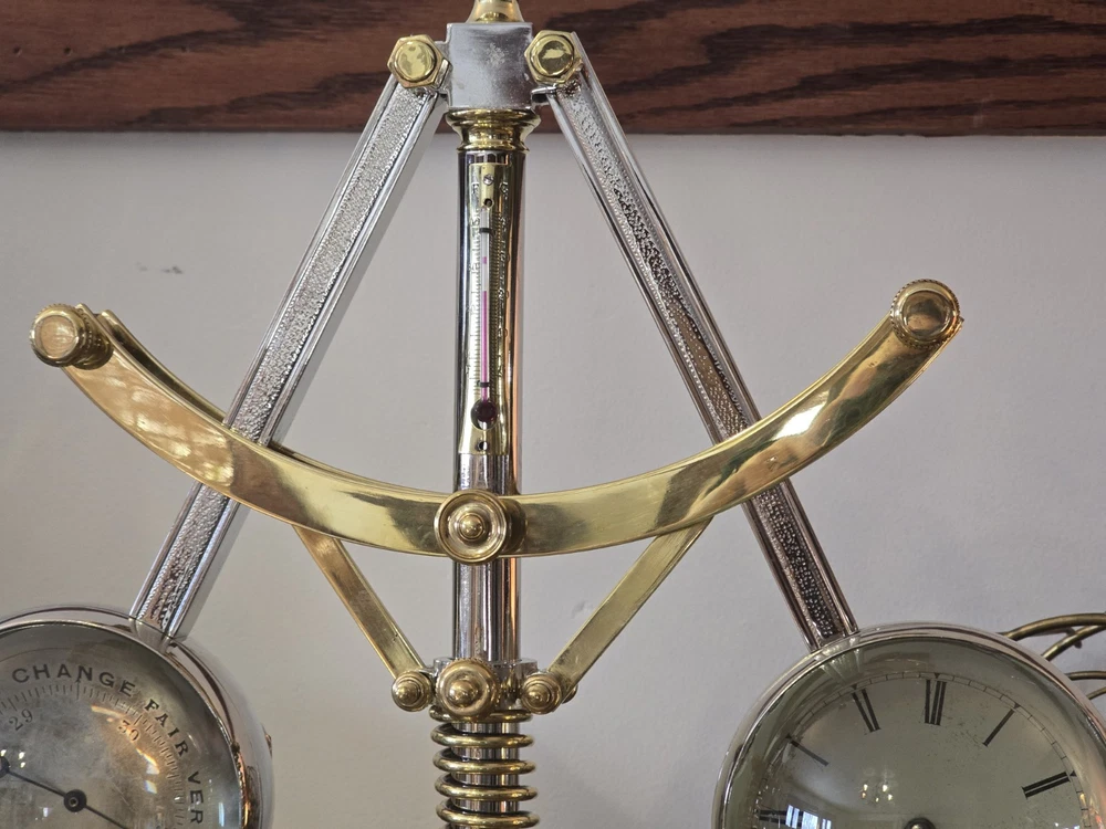Antique French Industrial Clock – Late Victorian Era – Professionally Restored This lot features a rare late Victorian-era industrial clock, crafted in France with exceptional quality. The clock’s functional governor balls move up and down, controlled by a central spring retainer. The large glass globes over each dial magnify the silvered faces, enhancing its striking visual appeal. The case has undergone a full professional restoration. The brass has been carefully polished and waxed, while the nickel plating was expertly redone by a piano restoration specialist to ensure authentic, period-correct craftsmanship. The original dents and dings were intentionally preserved to maintain the clock’s historical integrity. The movement is an 8-day, time-only, lever-action mechanism. However, the barometer movement is missing, and while we have attempted to source a period-appropriate replacement, we have not yet found one. There are some chips to the edges of the glass, but they do not detract from the overall presentation. A rare and exceptional find, especially in this condition. Condition & Sale Terms: This clock is being sold for decorative purposes only. Mechanical functionality is not guaranteed, and it is sold As-Is, with no warranties or guarantees. Clock Measurements: "L x "W x "T Feel free to reach out with any questions before purchasing INTERNATIONAL SHIPPING NOTE: eBay requires signature confirmation on all purchases over $750, unfortunately due to USPS regulations signature cannot be done on international orders. Any international buyers will need to confirm in writing there approval to send without signature confirmation via ebay messages