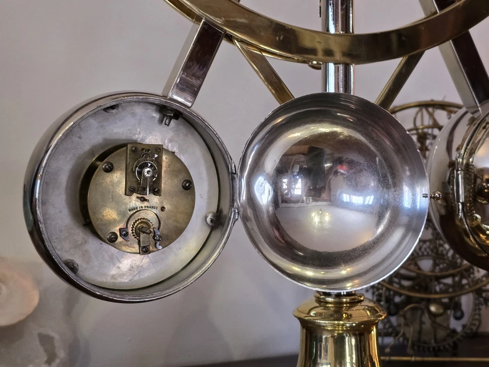 Antique French Industrial Clock – Late Victorian Era – Professionally Restored This lot features a rare late Victorian-era industrial clock, crafted in France with exceptional quality. The clock’s functional governor balls move up and down, controlled by a central spring retainer. The large glass globes over each dial magnify the silvered faces, enhancing its striking visual appeal. The case has undergone a full professional restoration. The brass has been carefully polished and waxed, while the nickel plating was expertly redone by a piano restoration specialist to ensure authentic, period-correct craftsmanship. The original dents and dings were intentionally preserved to maintain the clock’s historical integrity. The movement is an 8-day, time-only, lever-action mechanism. However, the barometer movement is missing, and while we have attempted to source a period-appropriate replacement, we have not yet found one. There are some chips to the edges of the glass, but they do not detract from the overall presentation. A rare and exceptional find, especially in this condition. Condition & Sale Terms: This clock is being sold for decorative purposes only. Mechanical functionality is not guaranteed, and it is sold As-Is, with no warranties or guarantees. Clock Measurements: "L x "W x "T Feel free to reach out with any questions before purchasing INTERNATIONAL SHIPPING NOTE: eBay requires signature confirmation on all purchases over $750, unfortunately due to USPS regulations signature cannot be done on international orders. Any international buyers will need to confirm in writing there approval to send without signature confirmation via ebay messages