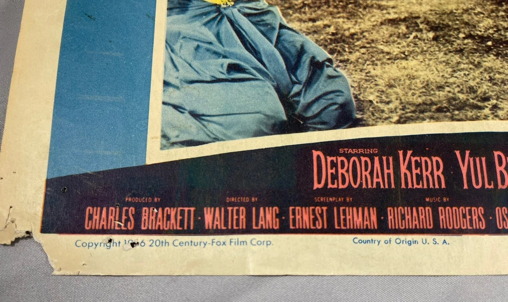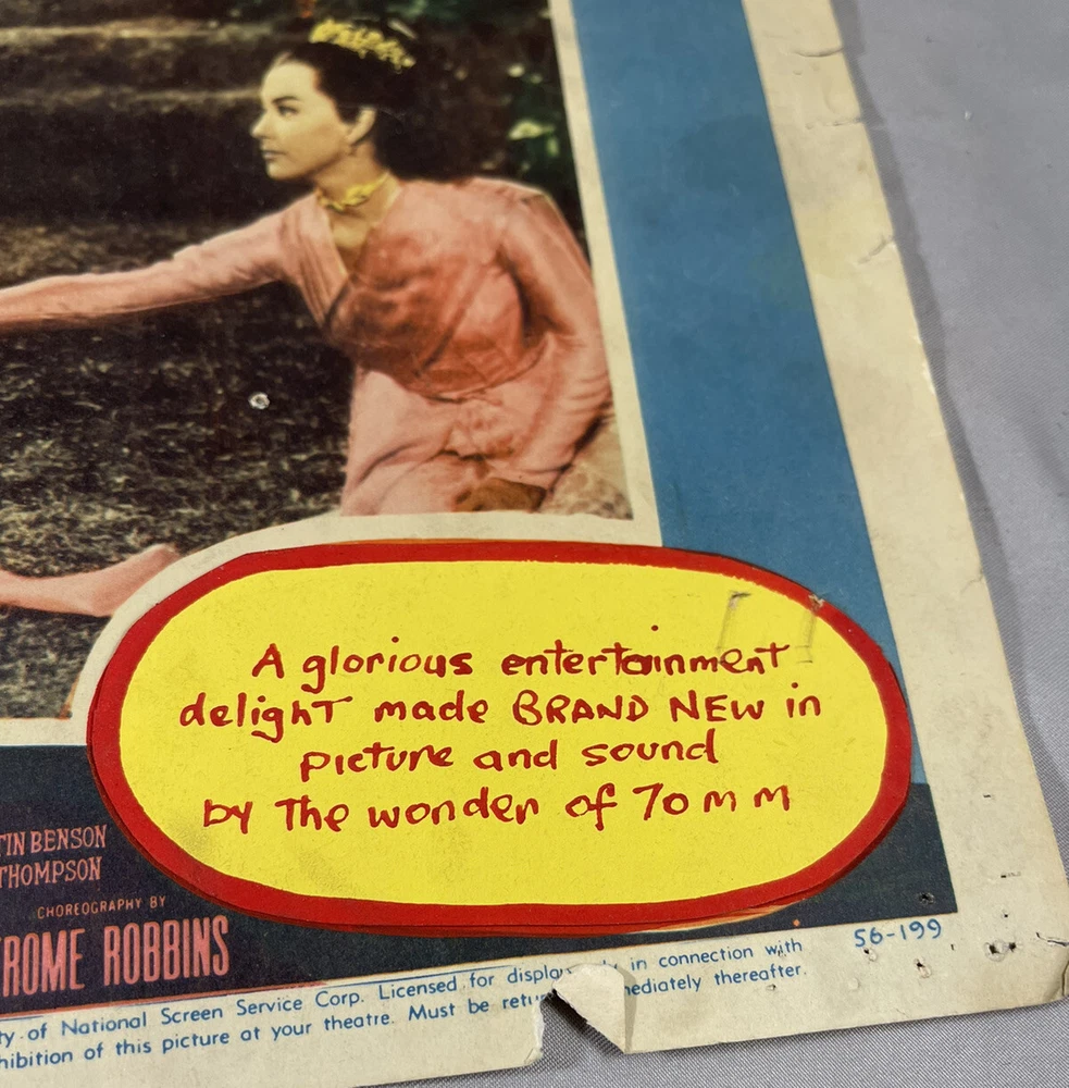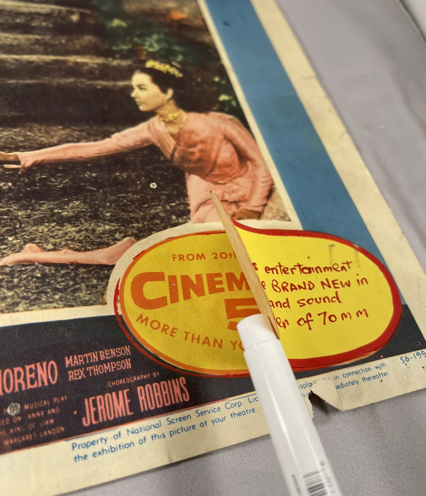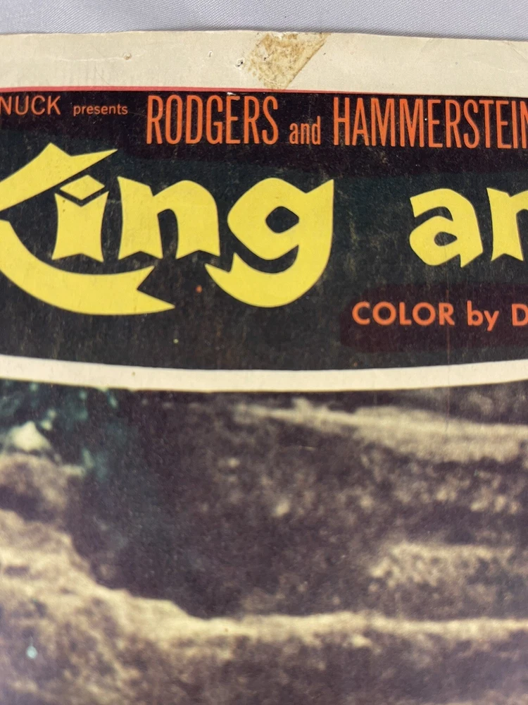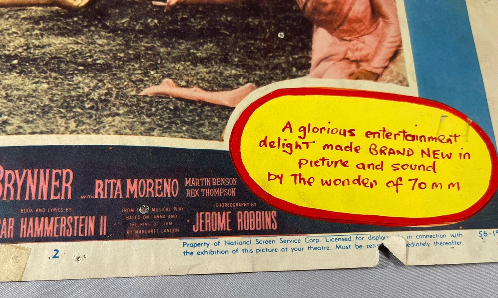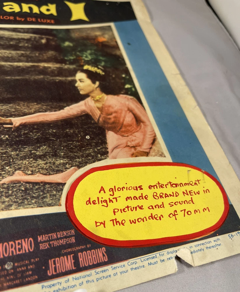 RARE Original 1956 70 mm Introduction: The King and I Half Sheet Poster 11 x 14 Theater Cover Sticker over CinemaScope 55 label. Introducing 70 mm picture and sound for 1st time Corners are bent and or missing with some creasing on edges. Tape residue along the top and bottom No folds on main image Rare Imagery Advertisement Non- Yul Brynner