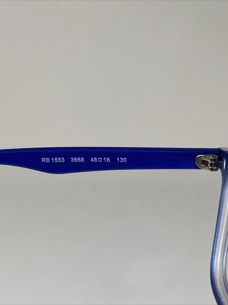 Style: Full Rim Brand: Ray-Ban Model: RB1553 3668 Vintage: No Frame Color: Blue Country/Region of Manufacture: China Frame Material: Acetate Bridge Width: 16 mm Theme: Modern Temple Length: 130 mm Department: Unisex Kids Lens Socket Width: 48 mm Type: Eyeglasses Features: Full Rim Pattern: Solid MPN: Does Not Apply