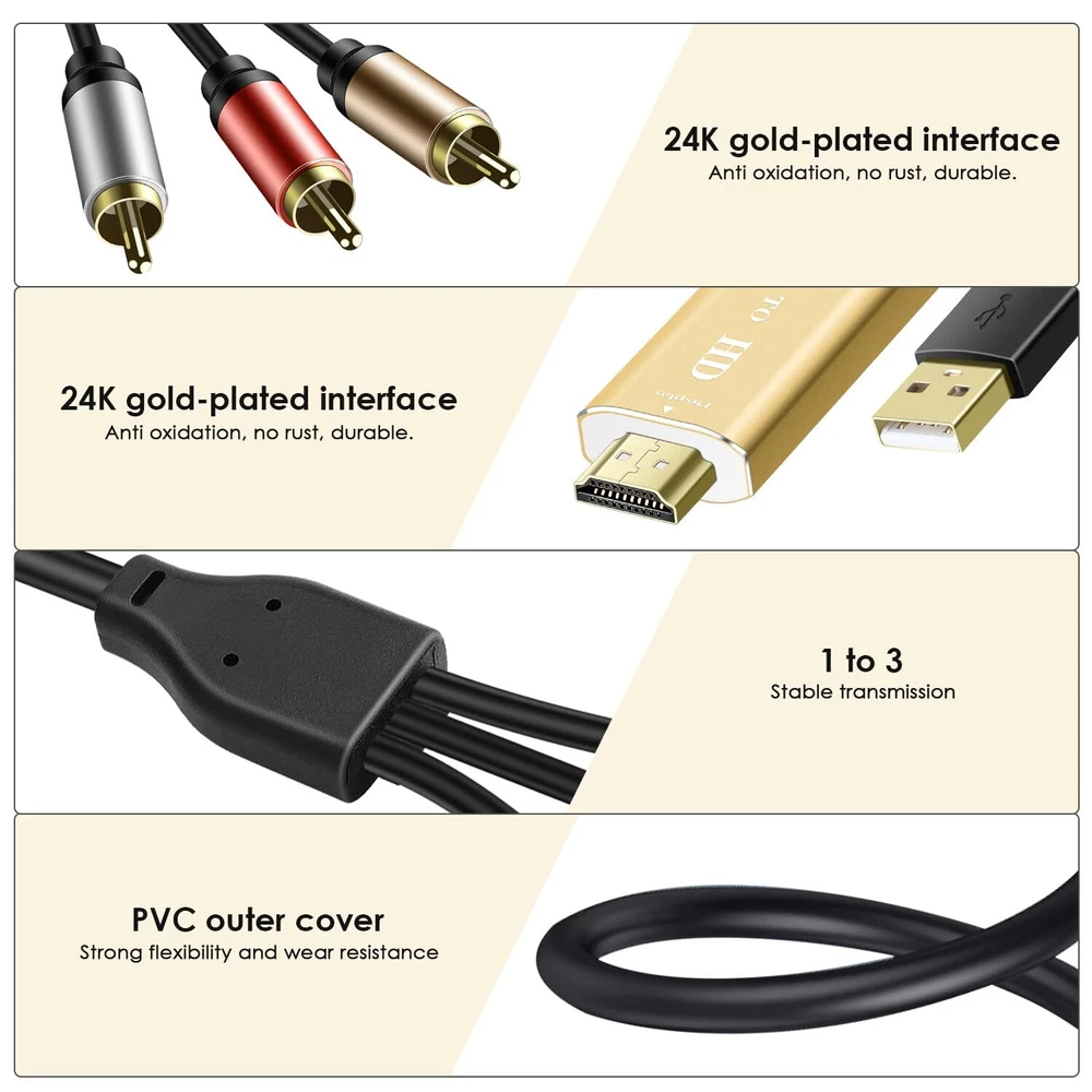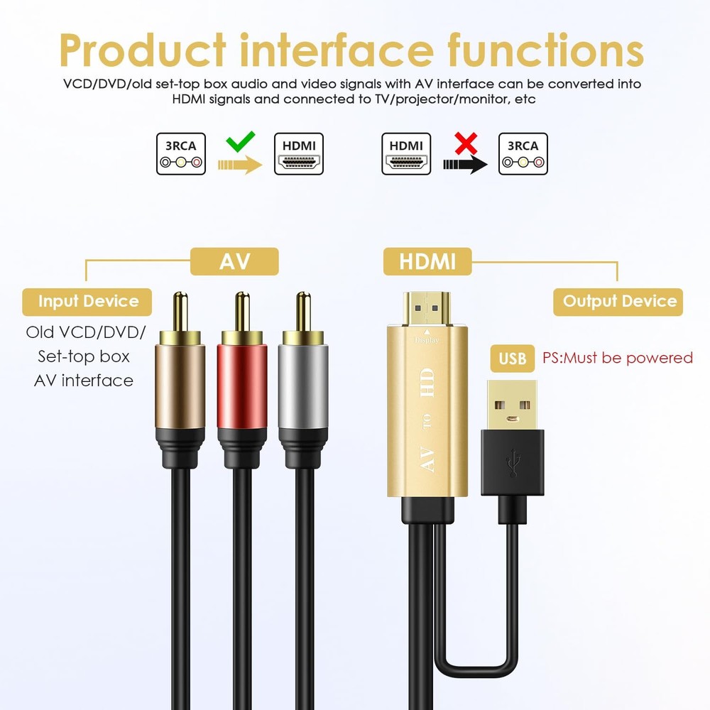RCA to HDMI Converter for Smart TV - Composite AV to HDMI 1080P Aluminum Alloy Video Audio Adapter for VCR/DVD/VHS Player/Roku/PS2 Game Console - 6 Feet (Golden) Connect old AV devices to modern HDMI-equipped TV: This RCA to HDMI converter can convert analog RCA composite input to HDMI up to1080P output. Great for using older video players with smart TV, easily connected old-school VHS/DVD/VCR player to smart TV, you can watch old equipment sources and use old game systems on new TV that may not have RCA, which can bring back your childhood memories. Perfect for making old video peripherals useful again. All in one AV to HDMI Cable Adapter: Supplied with RCA male cable, HDMI cable, and USB power cable, features a built in RCA to HDMI converter chipset, no need to buy extra cable, Hassle Free and Save you money by eliminating the need for extra components. Great For Viewing VHS and DVDs from old analog Player to New Digital TV. Easy HDMI hook up for older AV devices: Easy to use, no need any drivers, just plug to play, Please remember to hook up the USB power cable to 5V power source to make it work, you can get it to work within minutes. Note: the Audio Video cable to HDMI Converter only support converts AV to HDMI, can't converts HDMI to AV. 1080P HDMI Quality Supported: The av to hdmi converter has an built in authentic HD chip that supports advanced signal processing with great precision, colors, resolutions scale up to 1080P HDMI. Wide Compatibility: This composite to hdmi adapter is widely applied to use your old DVD, VCR, VHS, Android TV box, PS2, PS3 or game system with RCA input to connect to your new HDTV or HDMI only monitor, this RCA to HDMI converter is the right choice. If you want to use your DVD, VCR, VHS, Android TV box, or game system with RCA output to connect to your new HDTV or HDMI, this RCA to HDMI converter is what you need. RCA to HDMI Converter Kit: Contain all necessary cables you need, such as Male RCA cable, HDMI cable, micro USB Power cable and built-in intelligent chip, no need to buy extra cable, more convenient to use. Features: Converter RCA signals into HDMI signals so you can watch your video on your HD Smart TV. No need to buy extra RCA cable and HDMI cable. No driver need,just plug and play. Helped to play your video consoles with your newer TV,then you got back to live your memories again. Allows you to view your favorite VHS tapes and preserve memories. It can bring back your family memories, relive your childhood in seconds, and it’s also a ideal choice for those who still love playing older game systems. Makes it easy to get old tech to work with new tech without a whole lot of fuss and costs. Note: This converter is not bidirectional. Just a one-way connector only, convert signal from RCA to HDMI. It can not convert HDMI to RCA. Shipping We offer FREE shipping on all orders! We ship within Three business days of payment, usually sooner. We use a selection of shipping services such as UPS, FedEx, USPS etc. We only ship to the lower 48 states, no APO/FPO addresses or PO Boxes allowed. Local pickups and combined shipping options are not provided at this time. Return You can return a product for up to 30 days from the date you purchased it. Any product you return must be in the same condition you received it and in the original packaging. Please keep the receipt. Feedback Customer satisfaction is very important to us. If you have any problem with your order, please contact us and we will do our best to make you satisfied. Contact Us If you have any queries, please contact us via ebay. We usually respond within 24 hours on weekdays. Please visit our eBay store to check out other items for sale! Thank you for shopping at our store.