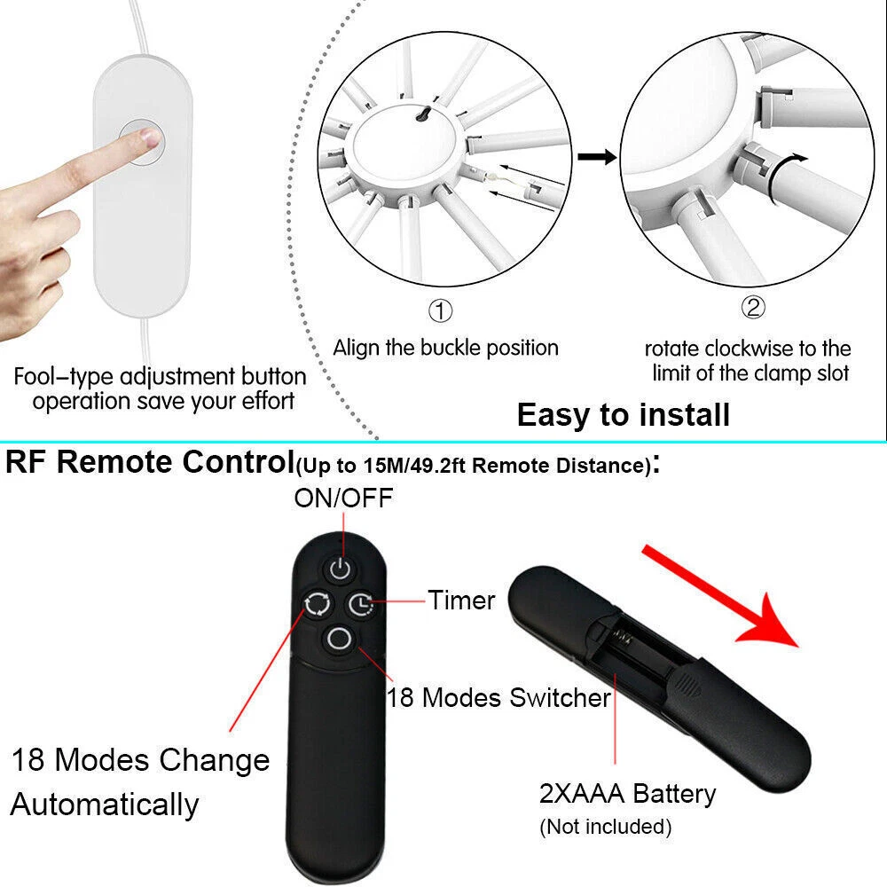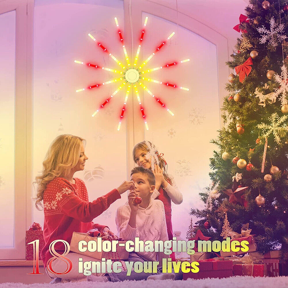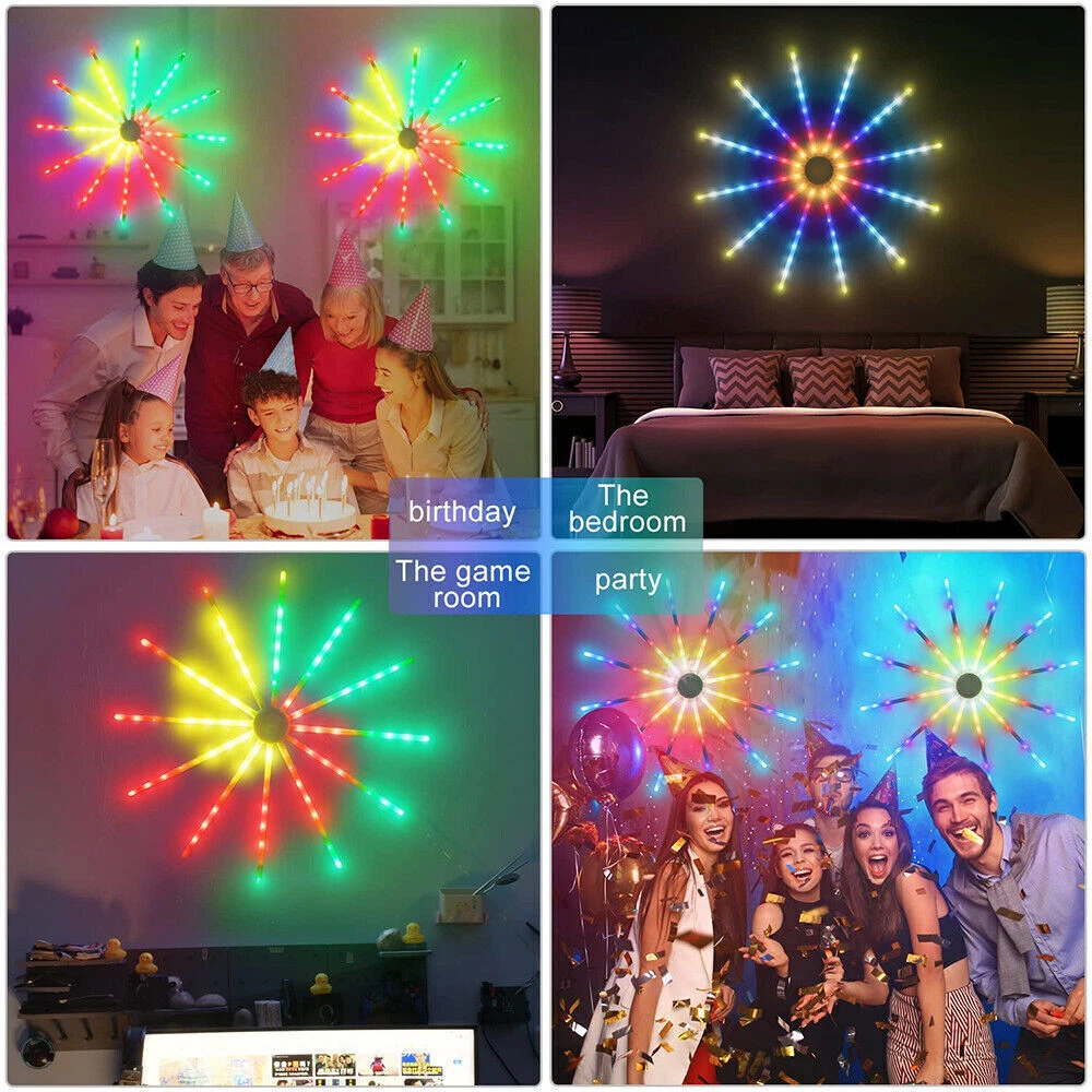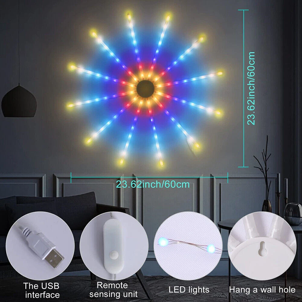 Product Description RGB Dreamcolor LED Firework Light Remote Control 18 Modes String Lights Wall Hanging Lights for Home Party Patio Garden Christmas Valentines Wedding Decorative Description: Features: *【New Design RGB Dreamcolor Firework Lighting Effect in a Plane】With 12 branches copper wire fairy lights which can be built-in 12pcs PC tubes, built-in smart IC, this firework light creates 18 dynamic modes of RGB dreamcolor change lighting effects. USB operated with a modes adjustment button and remote control. *【Wireless RF Remote Control】Support for up to 15 meters / 49.2ft effective receiving range to control On/Off, Timer and 18 different modes (Color Slow-Glow, Color Fast changing, Flash, Slow-moving, Meteor-flash, Fan rotation Effect, Windmill rotation effect, Lineup forward, Chasing forward, Chasing backward, heap up, etc), operated by 2XAAA battery(not included). *【USB Powered LED Fairy Lights with Switch Button】5V/1A USB powered, very easy to use. You can use the remote or USB with a switch button to control the 18 dynamic lighting modes which can create a warm and surprisingly suitable atmosphere for any occasion. *【RGB Dreamcolor LED Firework Lights *【Timing Schedule String Lights】You can press the timer button to set up a personalized time, press first time it will be 4 hours on and 20 hours off, press second time it will be 6 hours on and 18 hours off. with a hanging hole, can be a perfect hanging light for bedroom, Xmas, bar, window, room, wall decor. *【IP65 Waterproof Indoor & Outdoor Lights】Withstand all kinds of weather, including heavy rain and heavy snow, outdoor decoration and high-quality LED fireworks lights sparkling and colorful, but the USB port is not, please keep the USB port away from water. *【Perfect Decoration】With low-energy consumption, the twinkle lights can be widely used for bedroom, birthday, parties, Christmas, Halloween, garden, patio, tent, etc. Specifications: Materials: Copper, Plastic Copper Wire Color: Silver LED Light Color: RGB Dreamcolor Working Voltage: 5V Battery Model of Remote Control: 2X AAA Battery(Not included) LED Qty.: 96LEDs(12 wires, 8LEDs each wire) Size: 60x60CM(WxH)/23.62*23.62inch(WxH) Lead Wire Length: 4M/13.12ft Modes: 18 Lighting Modes Waterproof Grade: IP65(USB Port is not waterproof) Package includes: 1X LED RGB Dreamcolor Fireworks Light 1X Remote Control(Battery Not included) 12X PC Tubes Payment Shipping Returns Contact Us Paypal. We only ship to confirmed paypal address. Items are generally dispatched within 1~3 business days after payment is cleared. Please make sure your address in Paypal is matched with your shipping address before you pay. We offer a 30 days return guarantee. If you are not satisfied with the item, you can return it within 30 days after item received. If items have any problem due to quality, please contact us for refund, exchange or a replacement. Please contact us first before item returned. Customer Service from 9:00 am - 6:00 pm on Business Days. Payment Paypal. We only ship to confirmed paypal address. Shipping Items are generally dispatched within 1~3 business days after payment is cleared. Please make sure your address in Paypal is matched with your shipping address before you pay. Returns We offer a 30 days return guarantee. If you are not satisfied with the item, you can return it within 30 days after item received. If items have any problem due to quality, please contact us for refund, exchange or a replacement. Please contact us first before item returned. Contact Us Customer Service from 9:00 am - 6:00 pm on Business Days. powered by