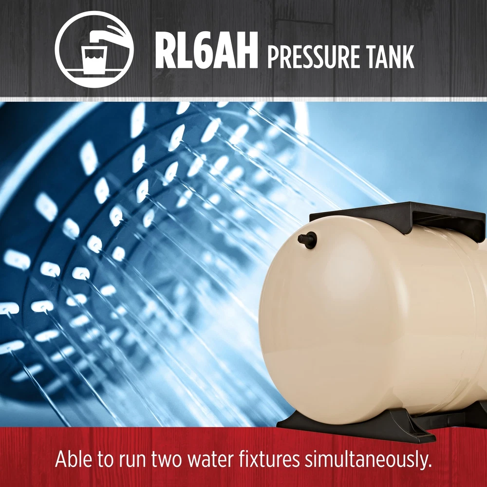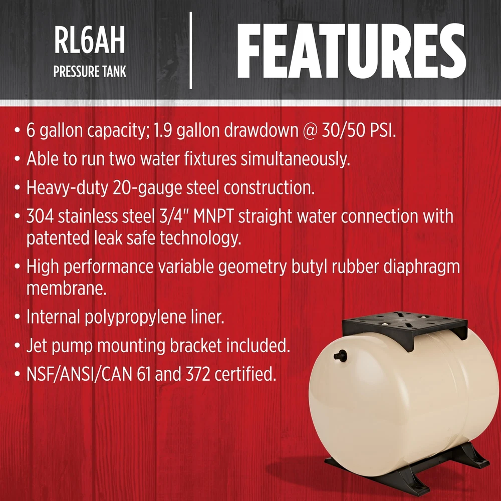 A pressure tank is an essential part of a pressurized water system that provides water pressure. The tank stores water between the diaphragm and the liner. The pressure tank reduces the number of times the pump needs to start significantly increasing the lifespan of your well pump. The tension of the diaphragm maintains the water pressure within the system ensuring proper operation of all water appliances such as a dishwasher and washing machine and provides a robust flow of water for showering. No maintenance is needed. A properly set-up pump and tank will work as a team to deliver water pressure to your home and provide many years of dependable service. The RL6AH tank is a 6-gallon horizontal tank with a drawdown of 1.9 gallons at 30/50 PSI. It is designed to handle 1 water fixture at a time. The RL6AH is equipped with a 3/4-inch MNPT threaded straight system connection. The RL6AH is made of heavy-duty 20-gauge cold rolled carbon steel with a 304 stainless steel connector. It has a triple grade almond paint finish. The liner material is FDA grade polypropylene. The unit is rated at a maximum working temperature of 194 degrees F and a maximum working pressure of 150 PSI. Initial set-up: The tank is pre-charged to 20 PSI in order to transport this pump safely and must be filled with air to 2 PSI below the cut-in setting of the pressure switch. For example, a 30/50 system needs 28 PSI of air in the tank. A 40/60 system needs 38 PSI. To fill the pump with air, use a standard bicycle pump and monitor the pressure using a pressure gauge (not included). This unit is equipped with a space saving thermoplastic universal pump mounting plate that allows a jet pump to be attached directly to the tank. This system is NSF/ANSI/CAN 61/CAN 372 tested and certified by WQA. APPLICATION: Designed to work with a well pump system to maintain water pressure when the pump is not running; certified for safe, clean, drinking water NSF/ANSI/CAN 61 and NSF/ANSI/CAN 372 approved BUILT TO LAST: Heavy-duty 20-gauge steel tank; 304 stainless steel water connection with patented leak safe technology; high performance variable geometry butyl rubber diaphragm; propylene liner SET-UP: Tank is pre-charged to 20 PSI for transportation; air pressure in the tank must be topped off with a bicycle pump to 2 PSI below the pressure switch cut-in setting PUMP MOUNTING BRACKET AND STAND INCLUDED: mounting bracket allows pump to be installed onto tank; stand lifts tank off of the floor preventing condensation from forming and staining of the floor SPECIFICATIONS: 6 gallon horizontal tank; 1.9 gallon drawdown @ 30/50 PSI; handles 2 water fixtures running simultaneously; 3/4" MNPT straight system connection, NSF/ANSI tested/certified by WQA