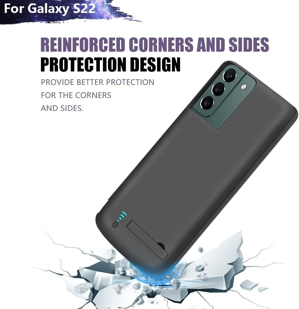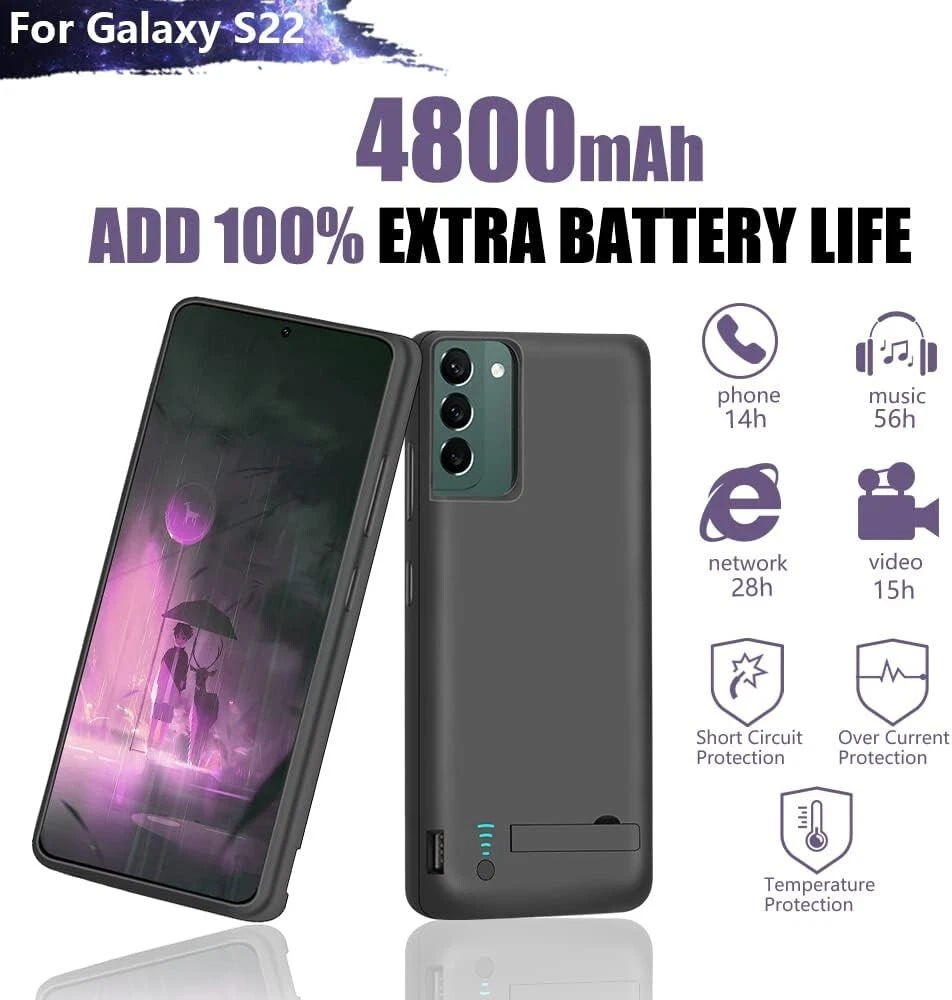 2-in-1 Charging & Protection : Simultaneously charges and protects your Galaxy S22. Includes built-in short-circuit and overcharge protection for added safety. Convenient Power Management : Integrated power switch lets you quickly turn charging on/off. LED indicators display battery status, with each light representing 25% power. Slim & Travel-Friendly Design : Compact and lightweight, perfect for travel or outdoor activities. Provides easy access to phone buttons and ports without removing the case. Durable & Protective : Made of high-quality materials for a comfortable grip and 360º protection against bumps, scratches, and dust. Note: Screen protector not included. Extended Battery Life : Equipped with a powerful 4800mAh lithium-ion battery to provide up to 100% extra juice for long trips or busy days. Compatibility : Exclusively designed for Galaxy S22 (6.1"). Not compatible with Galaxy S22+ or Galaxy S22 Ultra. Type-C wired headphones, Android Auto, quick charging, wireless charging, and Samsung Pay are not supported while using the case