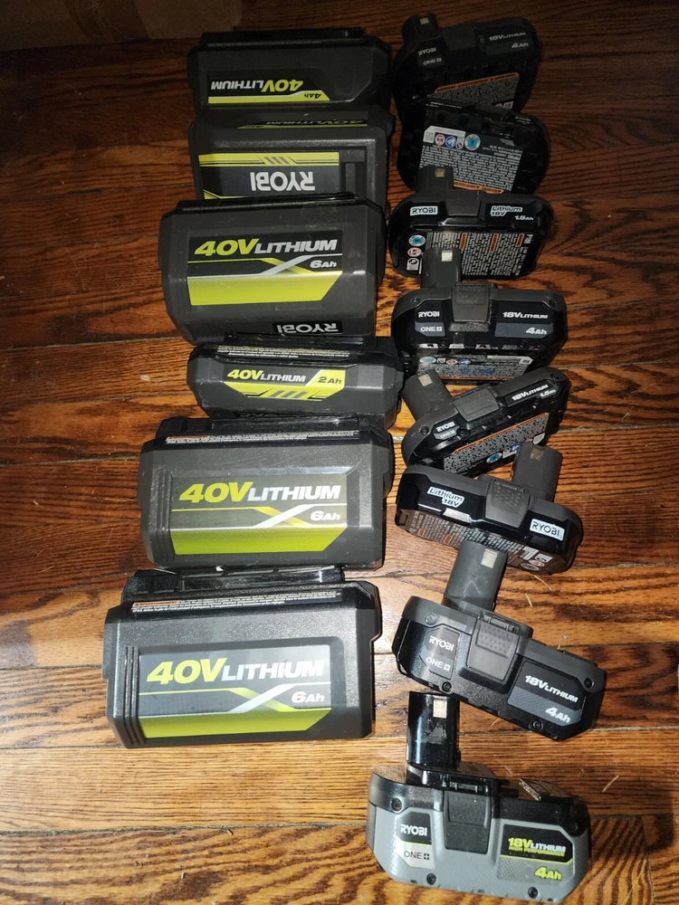 Ryobi lot for parts or repair or maybe working, these are completely untested. Included in the lot 4ah x 4 1.5 x 4 40v 4ah x2 40v 6ah x3 40v 2ah Thanks for looking