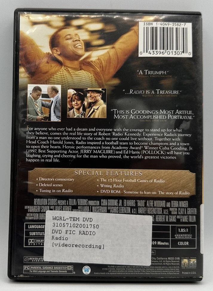 This inspiring movie tells the story of a young man named Radio, based on a true story. With a talented cast including Cuba Gooding Jr. and Ed Harris, this film is a must-see for sports fans and anyone who loves heartfelt storytelling. The DVD comes in widescreen format and features a runtime of 109 minutes. With a PG rating, this film is suitable for all ages and features American football as its sub-genre. The director, Mike Tolin, uses abstract cinematic movement to create a unique viewing experience. The DVD is housed in a tall/DVD case and is formatted for NTSC video players. It also includes special features. Bring home this inspiring tale today!