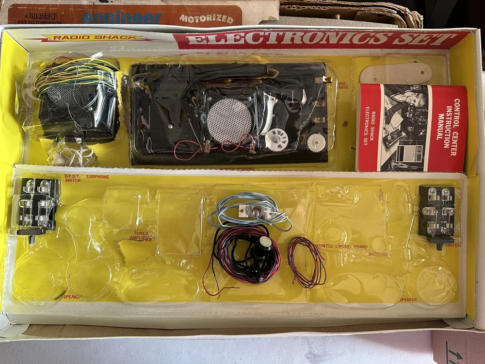 We found this set when cleaning out my folk’s home after they passed. This set was given to me in the early 60s. It worked back then but hasn’t been touched since then. It appears all the parts are there. Some things were left assembled in the control center itself. Box is not in the best of shape but is complete.