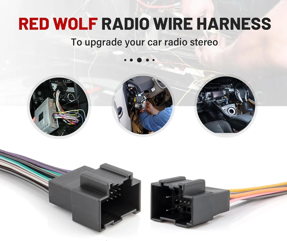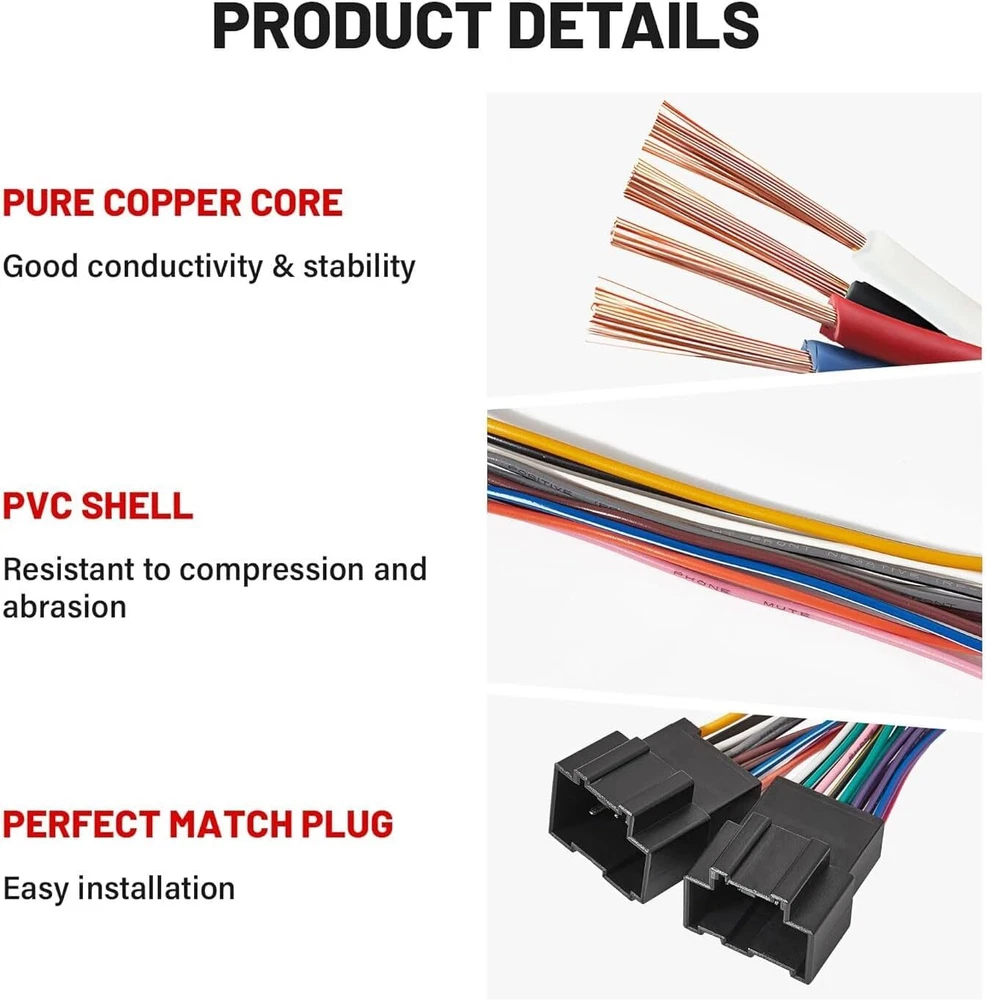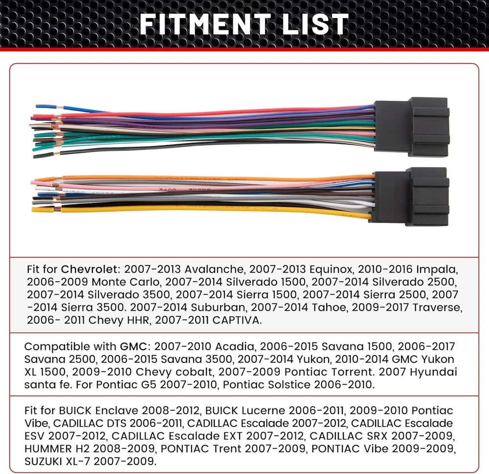 Radio wiring harness is used to replace the factory oem radio with your aftermaket new radio; Not compatible with amp systems lik, On-Star etc.; This harness can be used to connects an aftermarket stereo to the factory amplified system; Factory radio Navi system w/o Ext amp is available Red ignition wire: Not for all vehicle models, but if OEM radio harness of your vehicle has no ignition wire, aftermarket stereo can not be turned off/on through OEM radio harness; To solve this issue, need to get 12 V power from the ignition by running the red cable separately from the OEM radio harness; Simply attach one end to the ACC wire of the harness that comes with aftermarket radio, and connect the other end to the ACC wiring position located Product Description