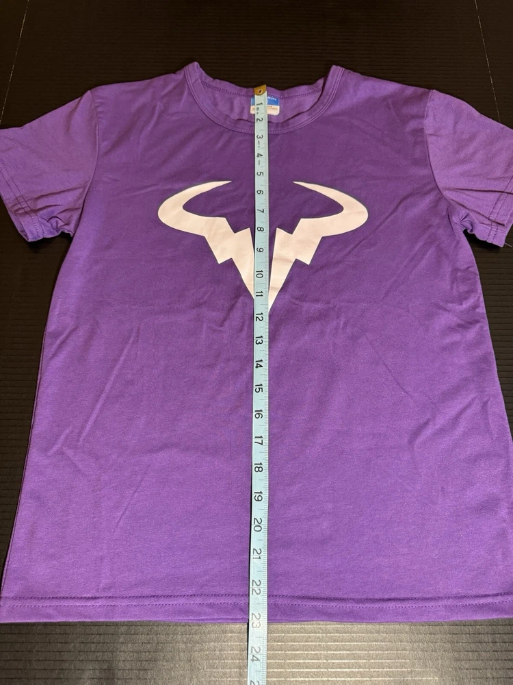 This shirt is brand new never worn but it has been washed. Comes from a smoke and pet free home. This Rafael Nadal women's t-shirt is perfect for any active woman looking for a comfortable and breathable piece of clothing. With a crew neck and short sleeves, this pullover t-shirt comes in a beautiful shade of purple and is made from dark wash fabric that is easy to care for. It is suitable for all seasons and occasions, whether you're going to the gym, playing tennis, walking, or just running errands. The shirt is designed with an athletic fit and is available in size small. It is collarless and has no vintage elements. The t-shirt is perfect for cross-training, CrossFit, and school activities.