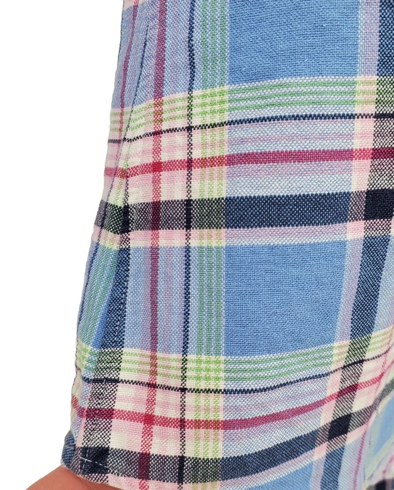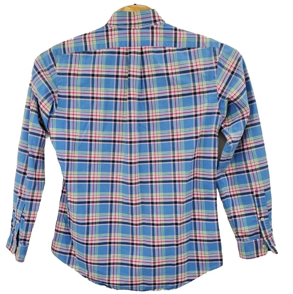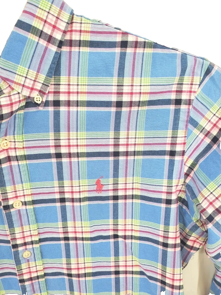 Ralph Lauren Custom Fit Blue Pink Plaid Button Down Shirt Men's Size Large Nice. It's a blue and pink plaid with a pink embroidered pony on the left side of the chest and it's made of 100% cotton. Please check measurements as preowned item measurements may vary. The measurement across the chest laying flat is 24 1/2 inches and the length from the shoulder to the bottom is 30 inches.