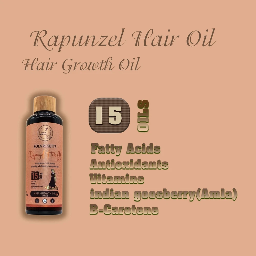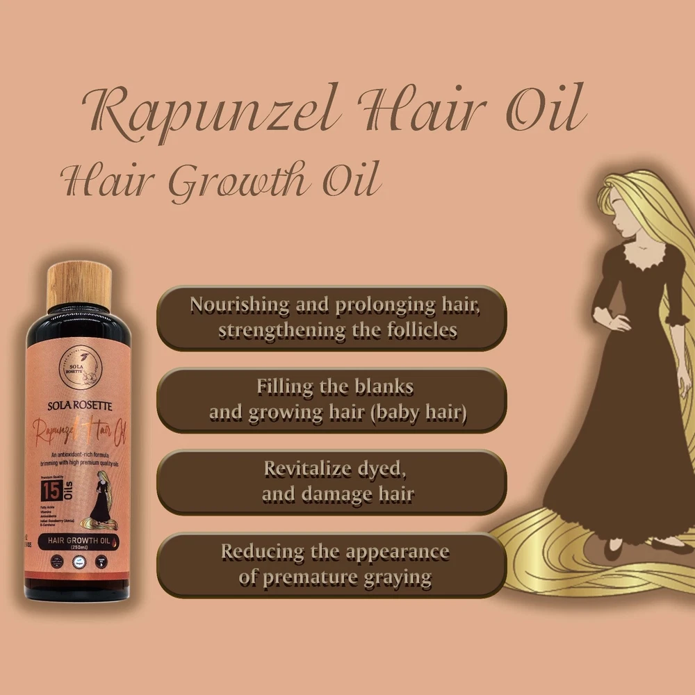 Behold “Rapunzel’s Hair Oil,” A luxurious blend of 15 precious oils and potent extracts , brimming with antioxidants and amino acids to lavish your locks with care and nourishment. Fight Hair Loss, Embrace Luscious Growth : Witness the enchanting power of hair thickening and regrowth, as it banishes hair loss. Welcome Baby Hairs with Open Arms: Say hello to those adorable baby hairs filling in the gaps. Nourish, Lengthen, and Strengthen : This elixir acts as your hair’s guardian angel, nurturing, elongating, and strengthening each strand while repairing damaged locks with essential proteins. Restore Shine and Vitality : Observe your hair’s magnificent transformation from lackluster to radiant, reinvigorating even dyed and damaged hair. Conquer Dandruff Effortlessly : Bid farewell to persistent dandruff as your scalp receives soothing care and relief. Banish Premature Grays : Harness the magic of beta-carotene and Indian gooseberry extracts, leaving premature graying behind. Lock in Moisture and Shield from Harm : Let this elixir serve as your hair’s protector, defending against damage and split ends Tame Frizz, Revel in Silkiness : Transform unruly frizz into sleek, manageable strands that exude elegance. Effortless Detangling : Experience hair that glides through your fingers effortlessly, free from knots and tangles. Gentlemen, Embrace the Beard Growth Spell: Men, rejoice! Our elixir works its magic on beard growth, filling in those patchy areas. Suitable for All : This enchanting elixir is suitable for all ages and genders, making it a perfect addition to every member of your family’s beauty routine. Key Ingredients : 15 Precious Oils: Our blend includes a carefully selected assortment of oils renowned for their hair-enhancing properties,These oils collectively provide deep nourishment and protection to your hair. Beta Carotene Extract: it is a potent antioxidant known for its role in promoting hair health. It supports hair growth, enhances the vibrancy of natural hair color, and guards against damage caused by environmental stressors. Indian Gooseberry Extracts (Amla) : Indian Gooseberry, or Amla, is a rich source of vitamin C, which aids in collagen production crucial for hair strength. It also contains essential fatty acids that help nourish the hair follicles, promoting healthy growth and reducing hair loss. Vitamin E : Vitamin E is a powerful antioxidant that supports a healthy scalp by reducing oxidative stress. It also improves blood circulation to the scalp, aiding in hair growth and overall hair health. Product Purity: – Free from any synthetic or mineral oils or substances. – Free from silicones, parabens, or any harmful ingredients. – FDA Approved. – All raw materials are approved by global organizations such as Cosmos and Ecocert.