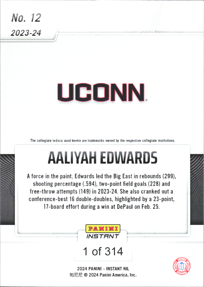 Capture a piece of basketball history with the Aaliyah Edwards 2023/24 Panini Instant NCAA Basketball card. This limited-edition collectible, part of the base set, highlights the athleticism and skill of the UConn Huskies' standout player. With a print run of just 314, this card is a unique treasure for fans and collectors alike. Featuring sharp, high-quality imagery and Edwards' dynamic presence on the court, this card is a must-have for enthusiasts of the sport. As an original issue from the 2023/24 Panini Instant series, it's a contemporary addition to any collection, celebrating the National Collegiate Athletic Association's vibrant basketball season.