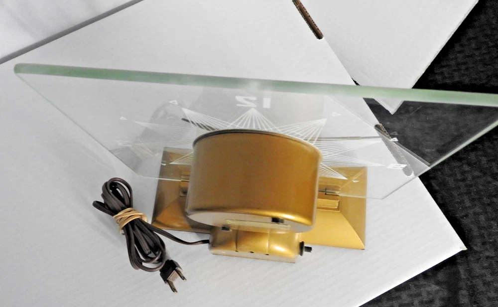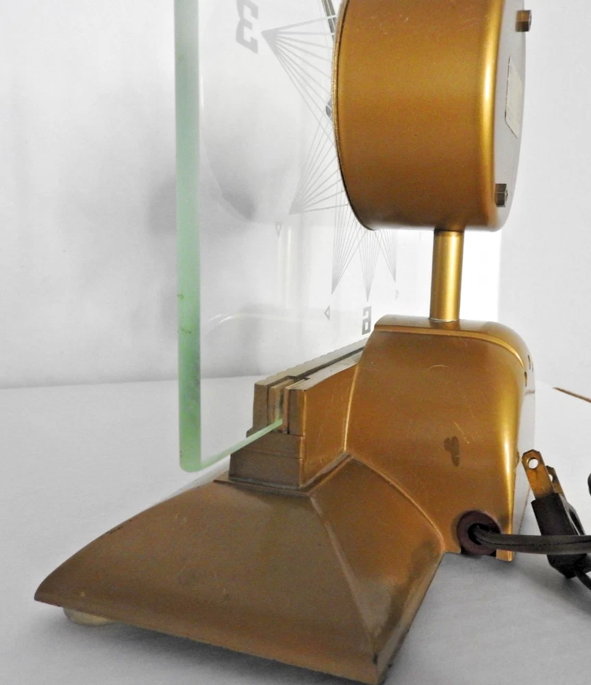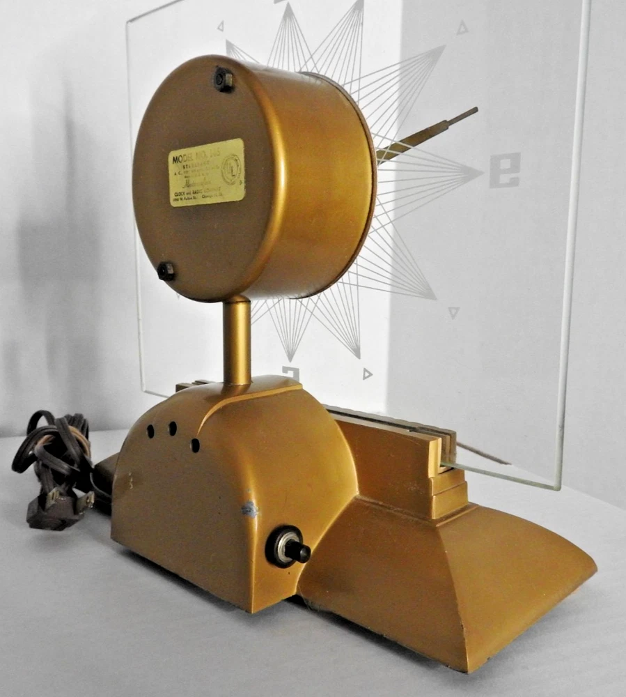 Here we have up for sale an ORIGINAL 1950's MasterCrafters Atomic Eternalight Desk Clock. Clock runs well with its original cord. Light switch works as it should also. Looks really cool when lit. Measures 8 1/2" x 8 1/2". Glass is perfect. Base is nice too but does have a couple of minor paint chips. Clock is in VERY GOOD+ overall condition and ships for FREE. Thanks for viewing.....Triple K