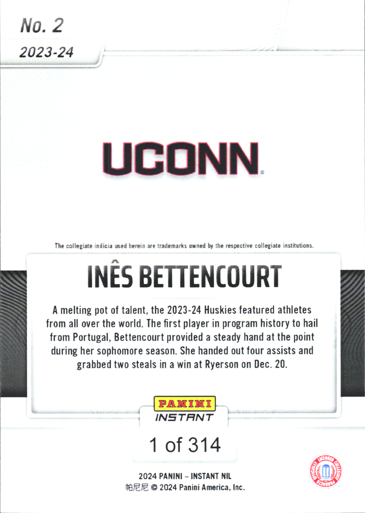 Capture a piece of basketball history with the 2023/24 Panini Instant NCAA Basketball card featuring Gonzaga rising star, Ines Bettencourt, in her original college UConn Huskies gear. This limited print run card, numbered to just 314, is a must-have for collectors and fans alike, celebrating a new season of collegiate athleticism and talent. As part of the base set and rookie series, this card is a tangible way to show support for your favorite player and the Huskies team. It's a unique keepsake that embodies the spirit of the game and the dedication of those who play it. Add this exclusive collectible to your collection today!