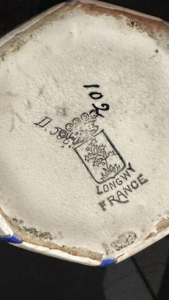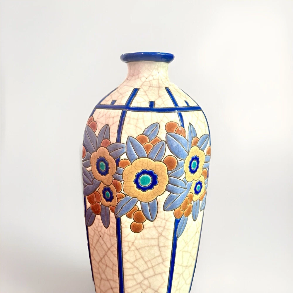 Rare, French Art Deco (c. 1920s-30s vintage) vase from Emaux de Longwy is in excellent condition with no chips, cracks hairlines or repairs. Crafted in France between 1920-1930, this large (11.5” high X 5.25” wide. 2” opening) vase features a glazed finish. The raised, relief design with dusty blue and rust leaves and ochre, deep blue and turquoise flowers set against white crackled background with blue vertical stripes make it a unique piece that will surely catch the eye of collectors.
