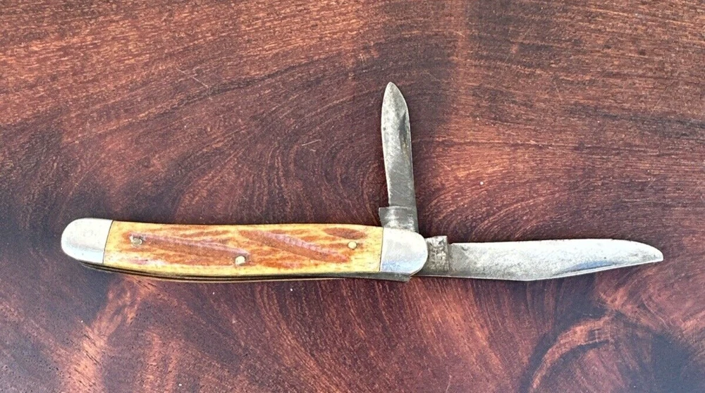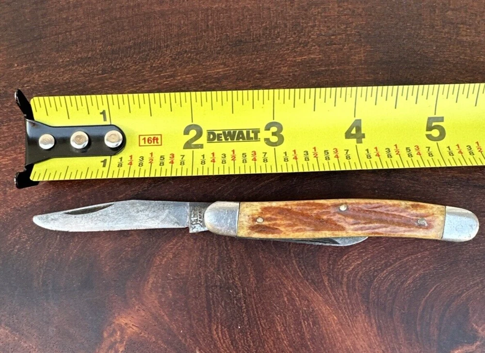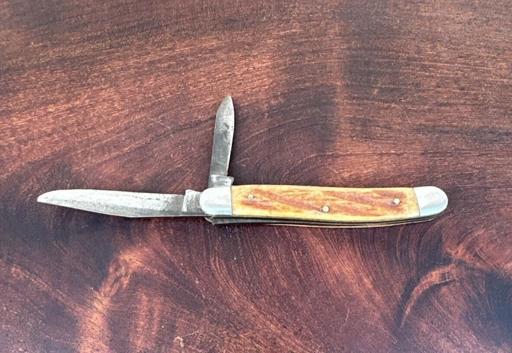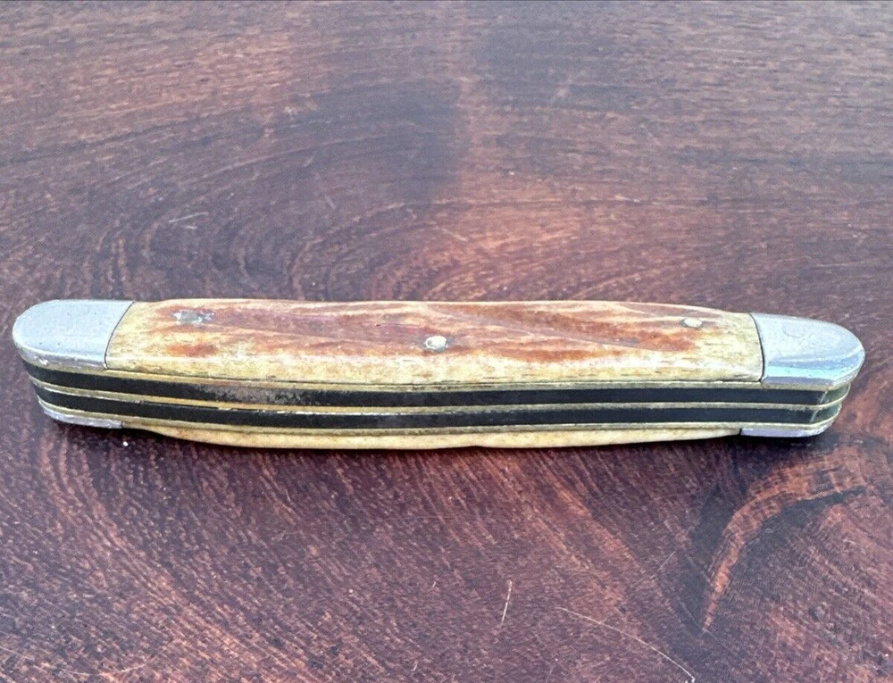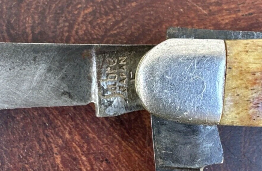 This vintage Sabre Japan 5 folding pocket knife is a rare find for collectors and enthusiasts alike. The knife features two stainless steel blades with a clip point blade type and a plain edge blade range of under 2.75 inches. The manual opening mechanism and slipjoint lock type make it easy to use with both hands, and the ambidextrous dexterity ensures a comfortable fit for all. The knife's brown color and vintage design add to its appeal. This original, factory-manufactured knife is a must-have for any knife, sword, or blade collector. Don't miss out on the chance to add this unique piece to your collection. Pre-owned condition. See photos.