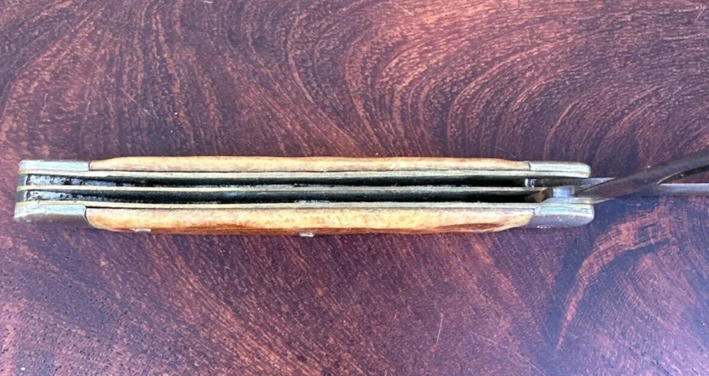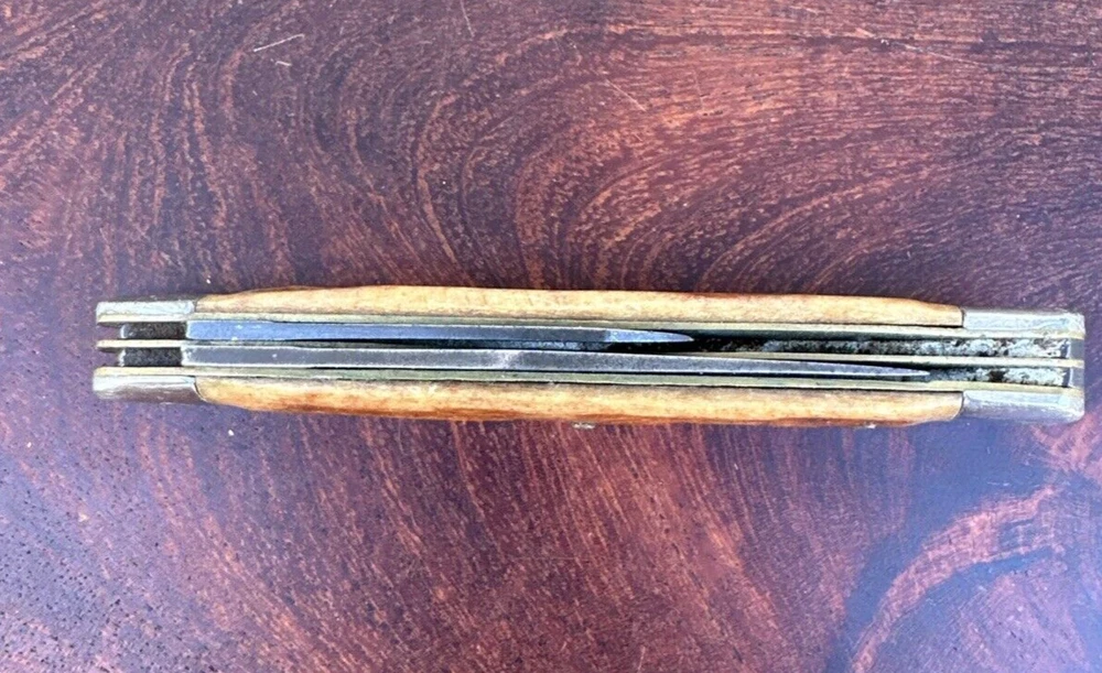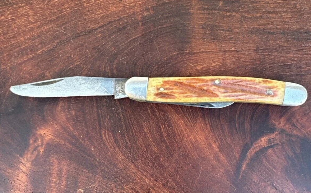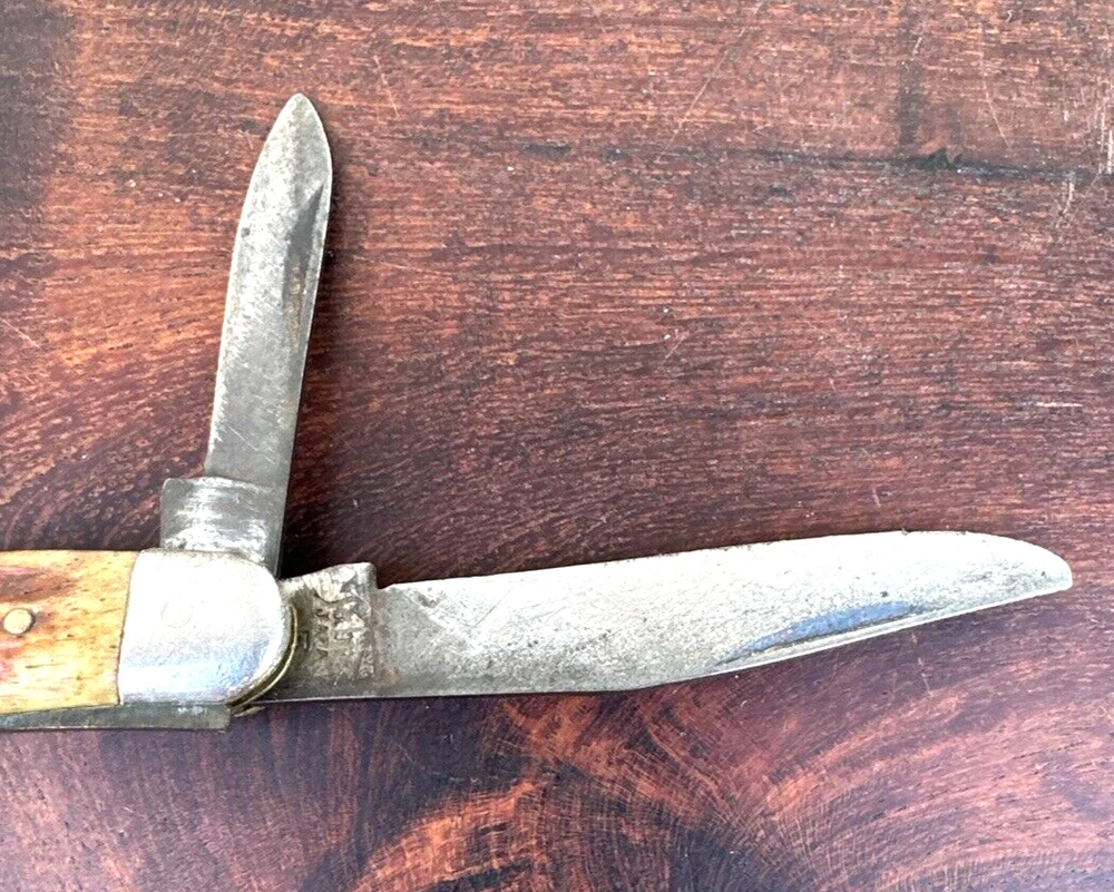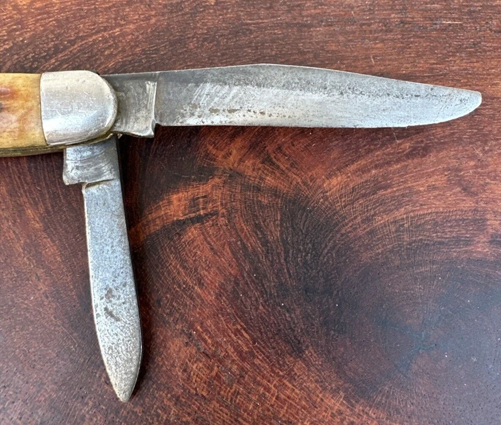 This vintage Sabre Japan 5 folding pocket knife is a rare find for collectors and enthusiasts alike. The knife features two stainless steel blades with a clip point blade type and a plain edge blade range of under 2.75 inches. The manual opening mechanism and slipjoint lock type make it easy to use with both hands, and the ambidextrous dexterity ensures a comfortable fit for all. The knife's brown color and vintage design add to its appeal. This original, factory-manufactured knife is a must-have for any knife, sword, or blade collector. Don't miss out on the chance to add this unique piece to your collection. Pre-owned condition. See photos.