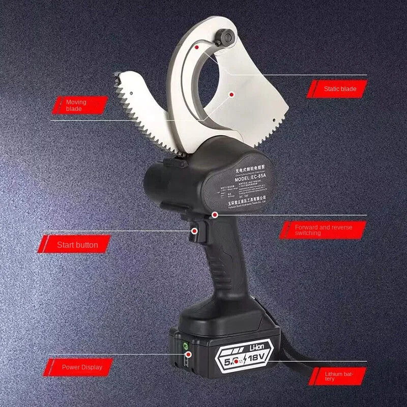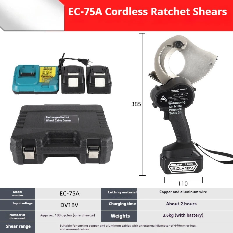 18V El ectric Ratcheting Cable Cutter Light Fast Cutting of 50Mm/85Mm Cable Gear Scissors Armored Cables Steel Core Aluminum Model EC-55A Cordless Ratchet Cutter Cut material copper aluminum wire Voltage DV18V Charging time is about 2 hours Approximately 100 times of use (1 charge) Weight 3.6kg (with battery) The cutting range is suitable for cutting copper and aluminum cables with an outer diameter of less than φ50 and armored cables. Model EC-G-55A Cordless Ratchet Cutter Cut material steel strand Voltage DV18V Charging time is about 2 hours Approximately 100 times of use (-- one charge) Weight 3.6kg (with battery) The cutting range is suitable for cutting steel core aluminum stranded wires below 1000mm, steel core cables below φ50mm and steel strands below 100mm. Model EC-75A Cordless Ratchet Cutter Cut material copper aluminum wire Voltage DV18V Charging time is about 2 hours Approximately 100 times of use (1 charge) Weight 3.6kg (with battery) The cutting range is suitable for cutting copper-aluminum cables and armored cables with an outer diameter of less than φ70mm. Model EC-85A Cordless Ratchet Cutter Cut material copper aluminum wire Voltage DV18V Charging time is about 2 hours Approximately 100 times of use (1 charge) Weight 4.0kg (with battery) The cutting range is suitable for cutting copper-aluminum cables with an outer diameter of φ85mm or less, and armored cables with an outer diameter of φ70mm or less.