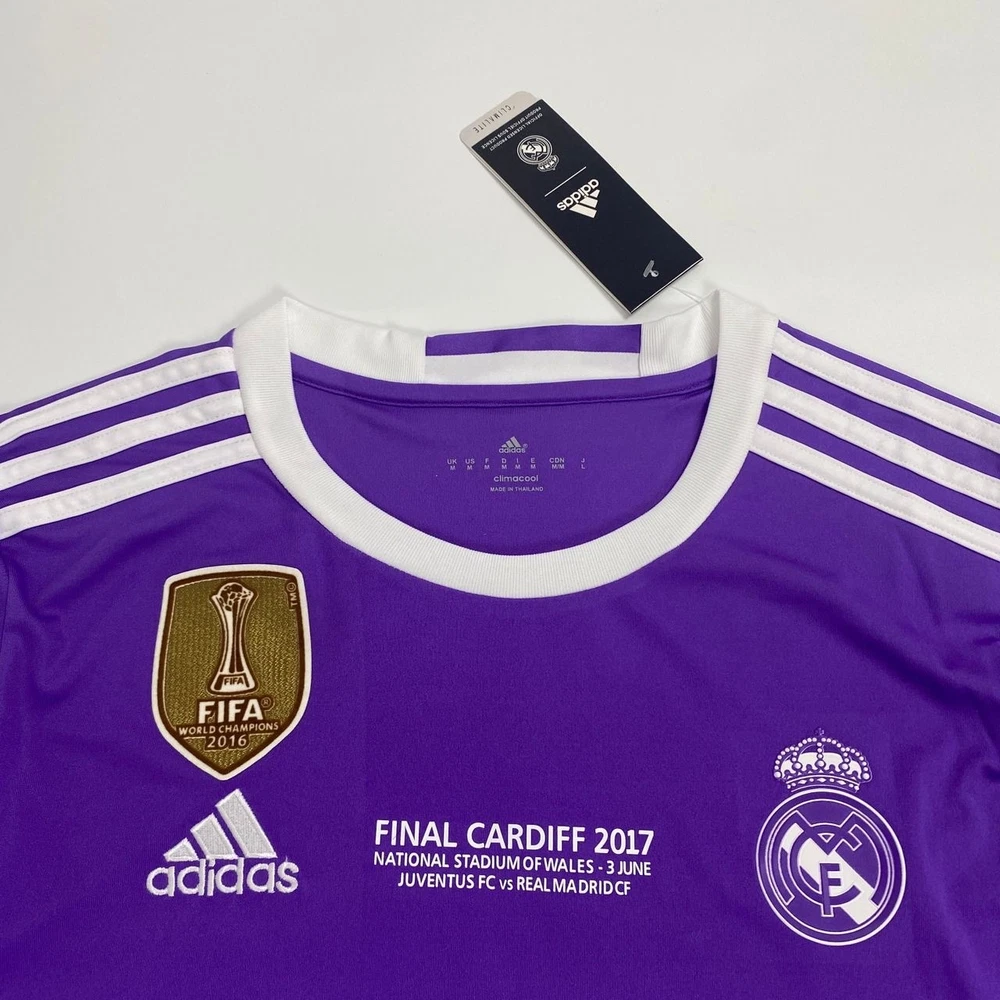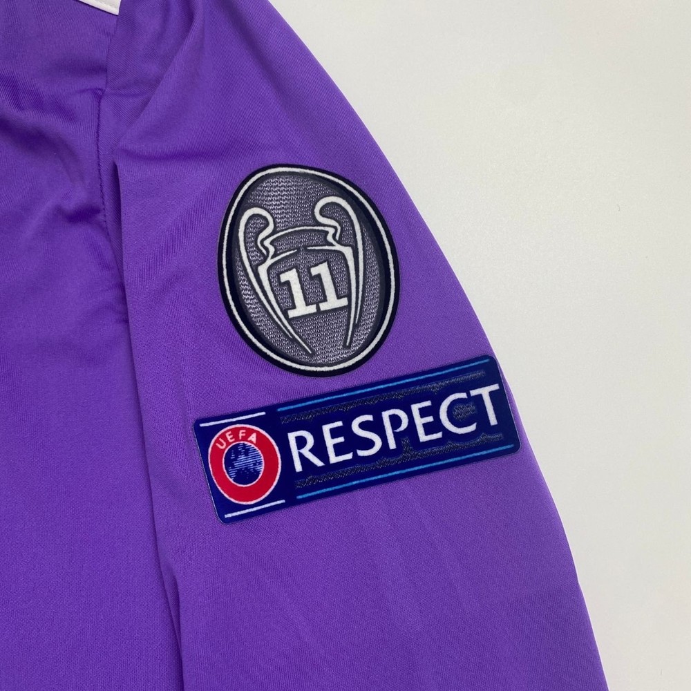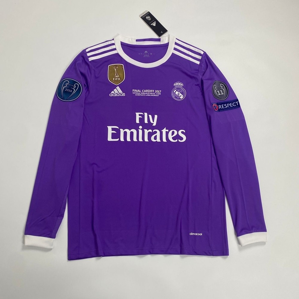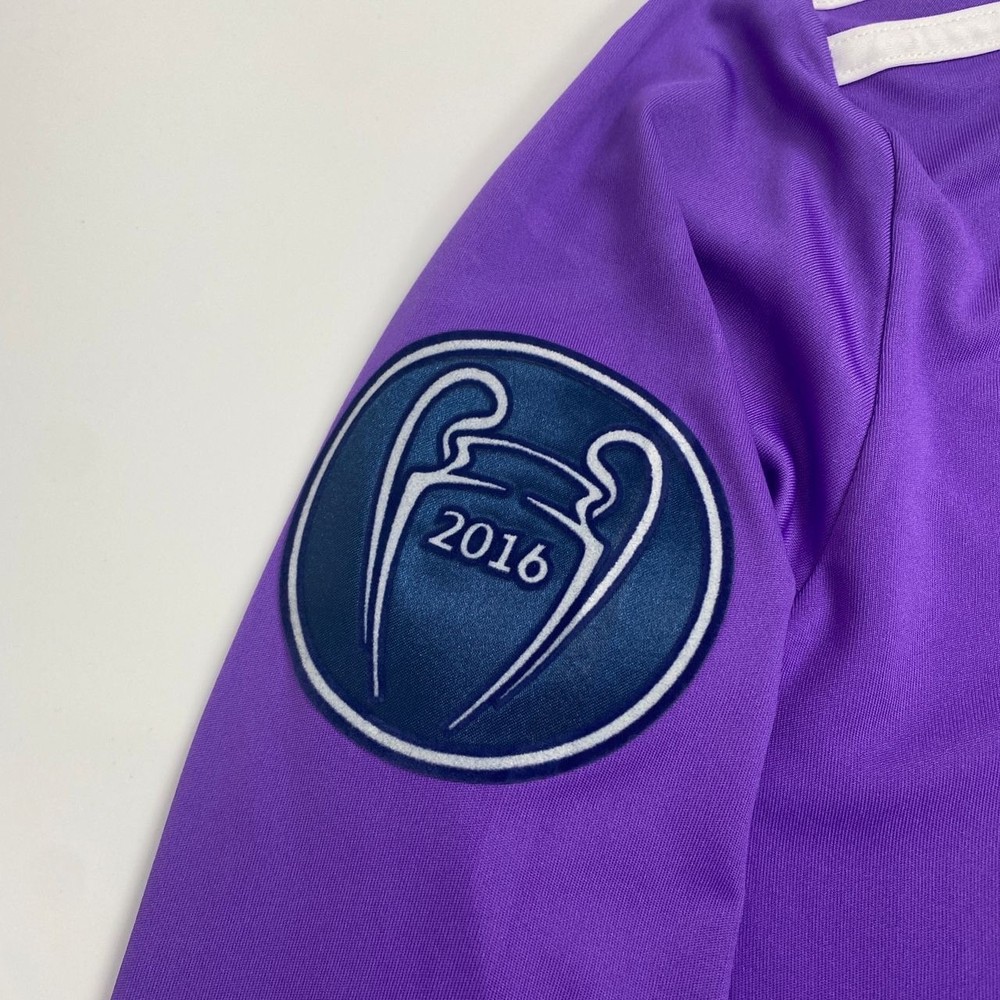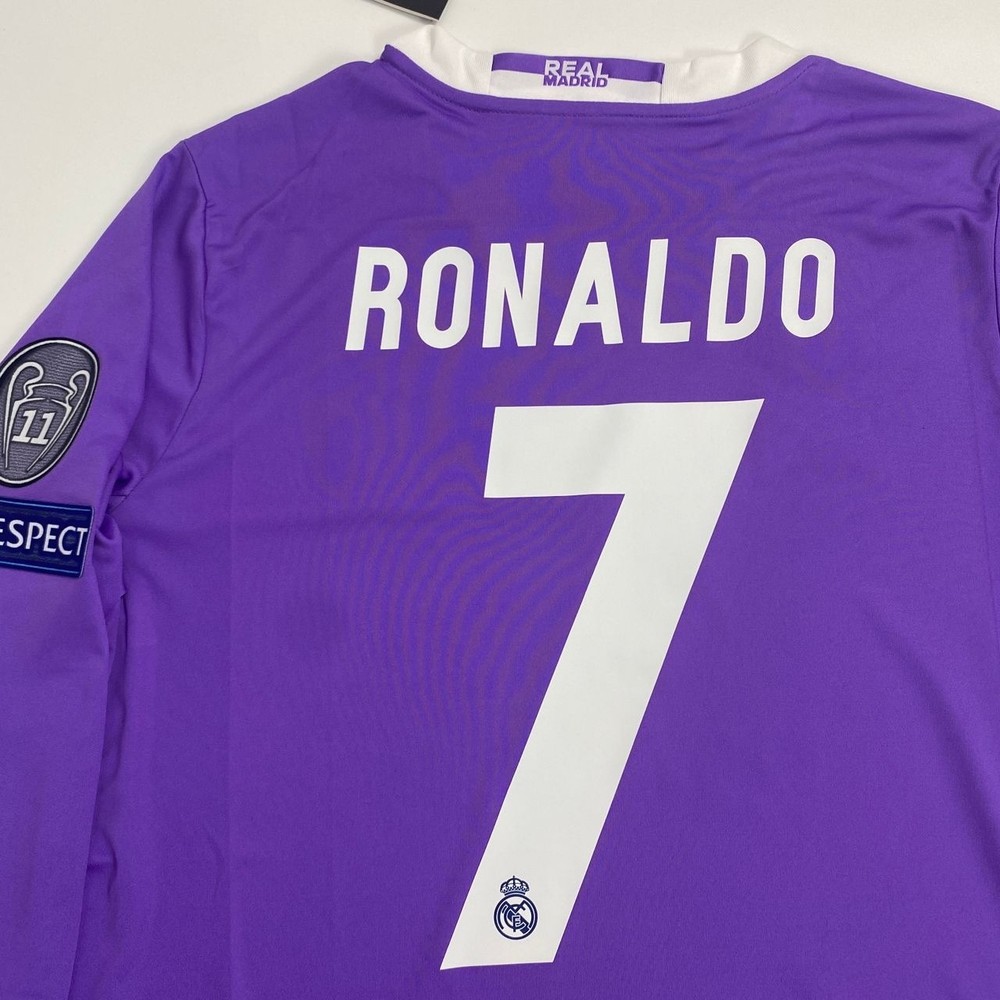 The product is a Real Madrid 16/17 long sleeve away jersey featuring Ronaldo #7, in sizes S-XL. This purple jersey is fan apparel for soccer enthusiasts who support Real Madrid. It is ideal for fans looking to show their allegiance to the team and player in style. Perfect for watching games or playing a match, this jersey is a must-have for any Real Madrid fan.