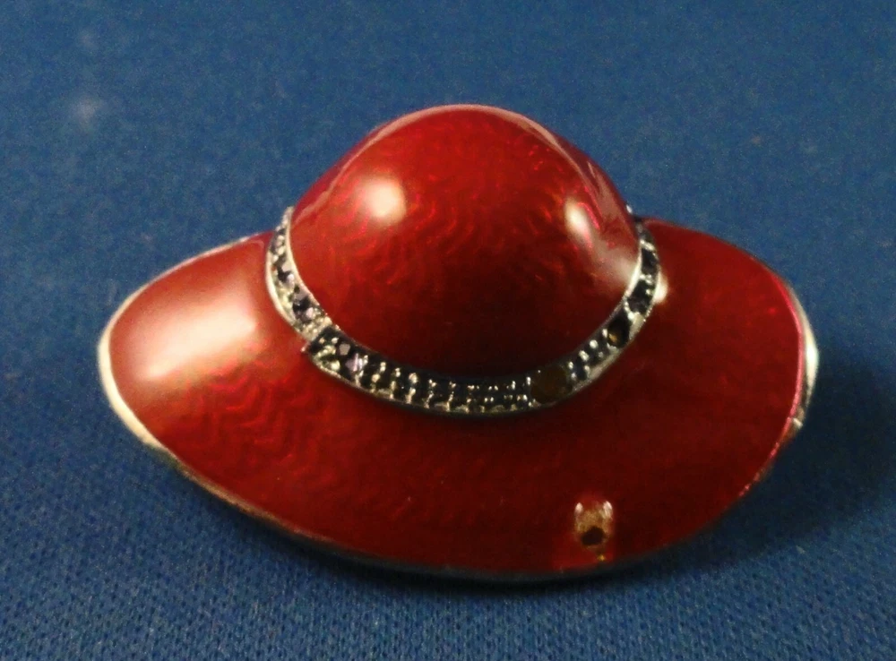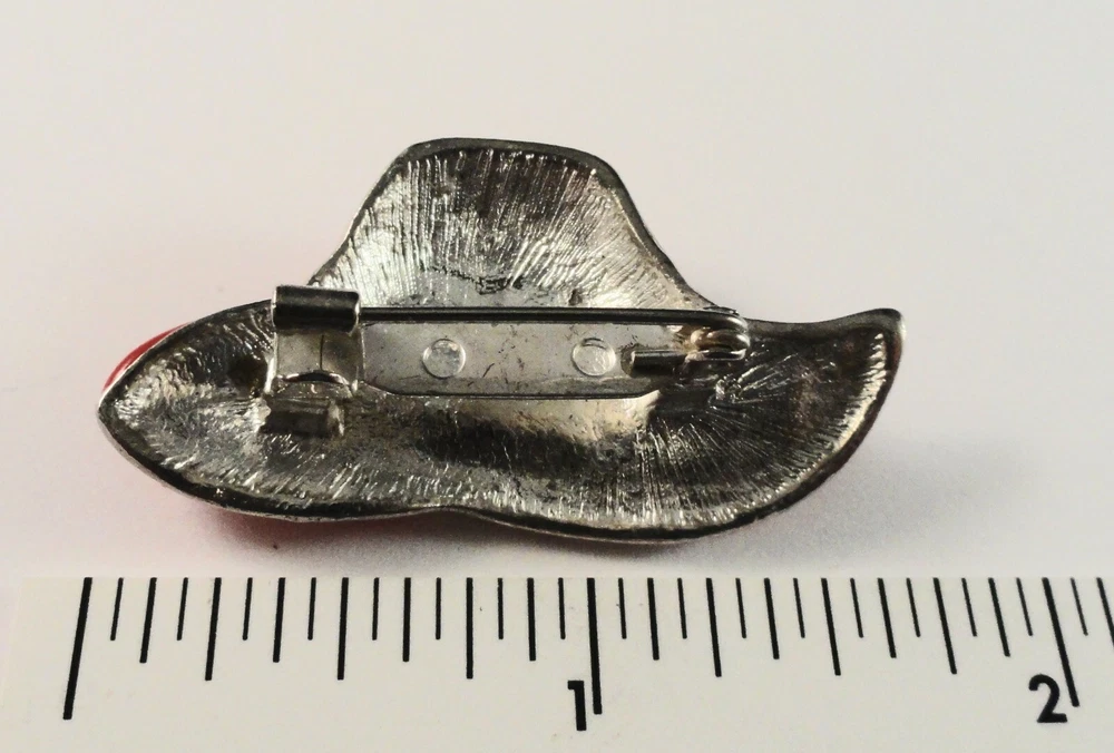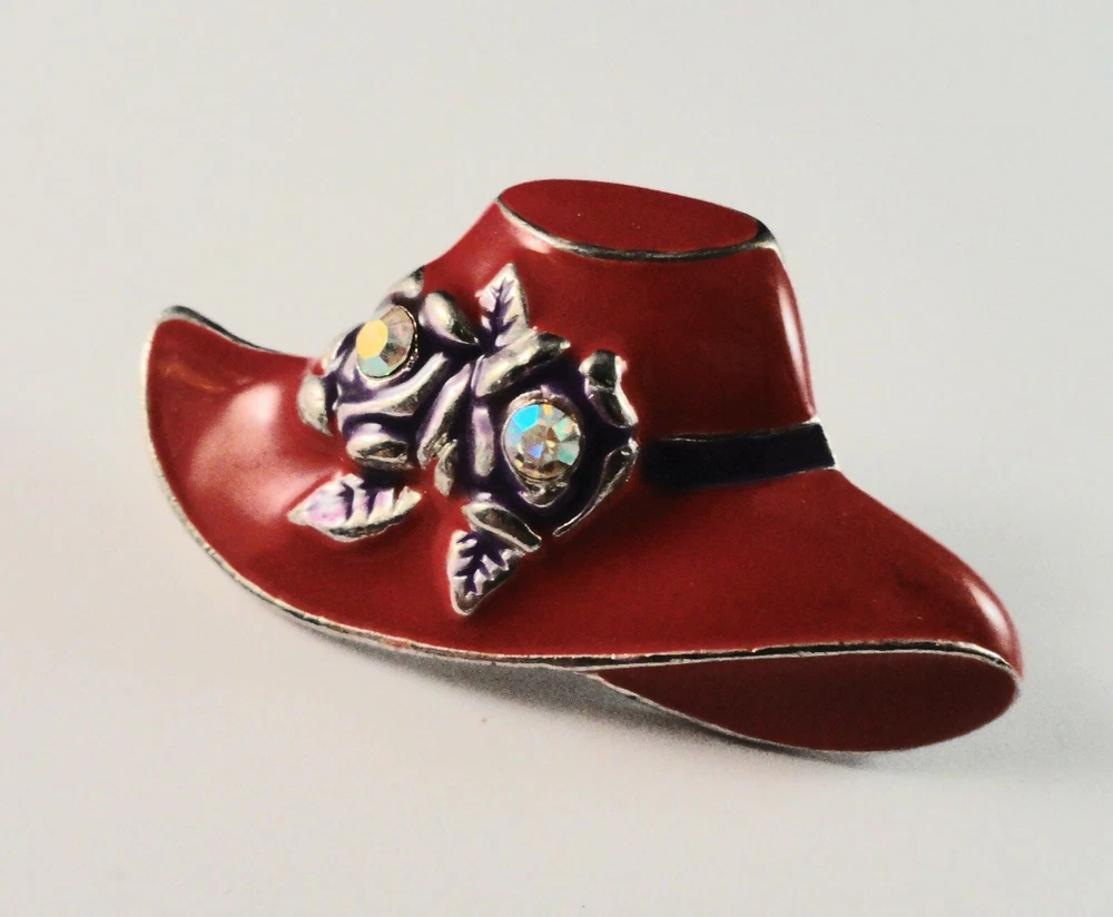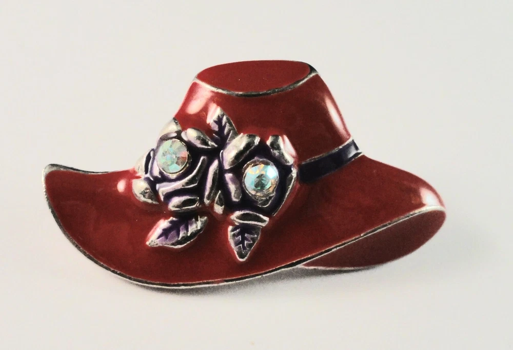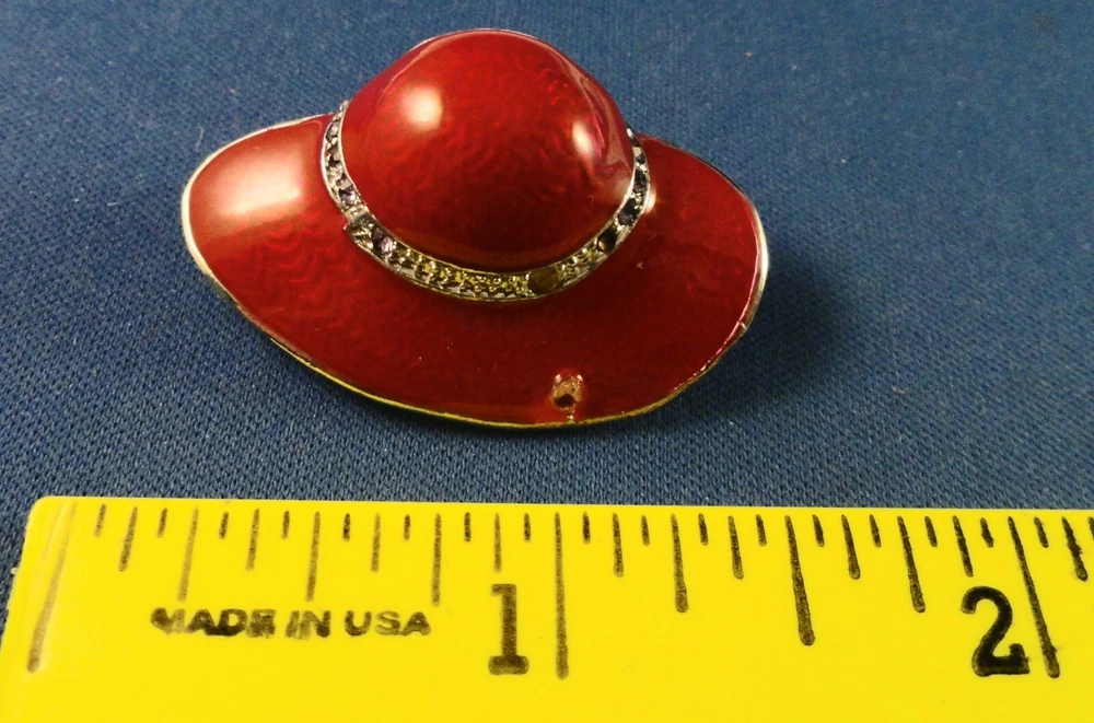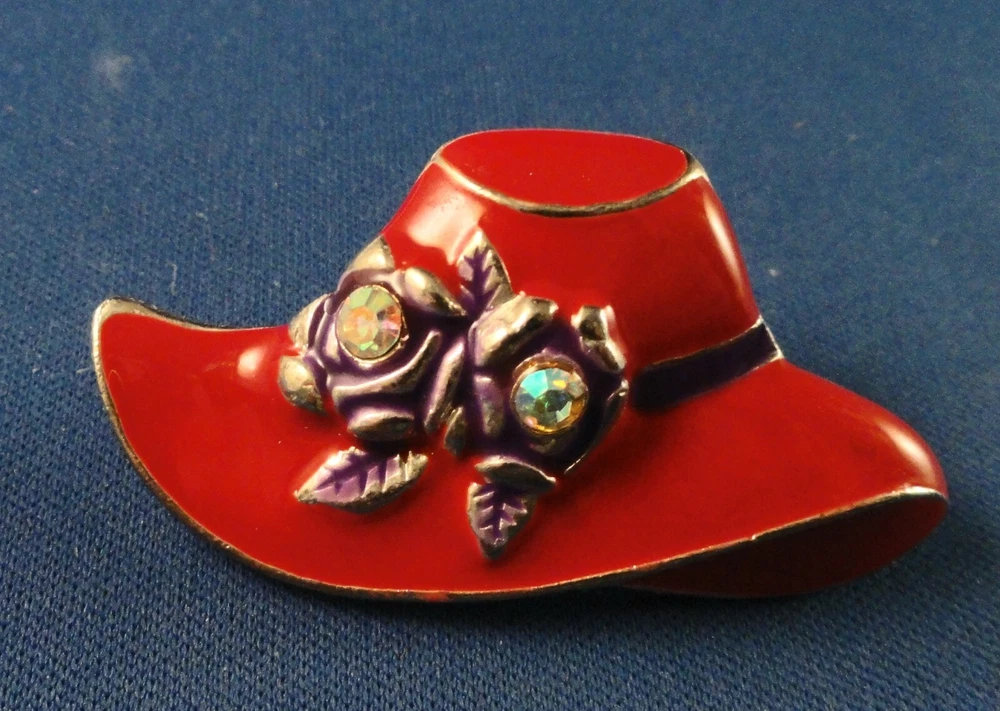 Inventory Control # ( 5613 ) PIN / Hatpin(s)Total #:: 2 - Lettering: none:: Pin A:: Red Hat with Purple Ribbon and 2 Flowers with Rhinestones Back: Safety Catch Pin B:: Bonus Pin: Red Hat with Rhinestone Band (missing 2 tiny rhinestones) Back: Safety Catch Condition: Pre-Owned S&H US is Free (4X4X4" box to protect items) Outside US by ebay global shipping only