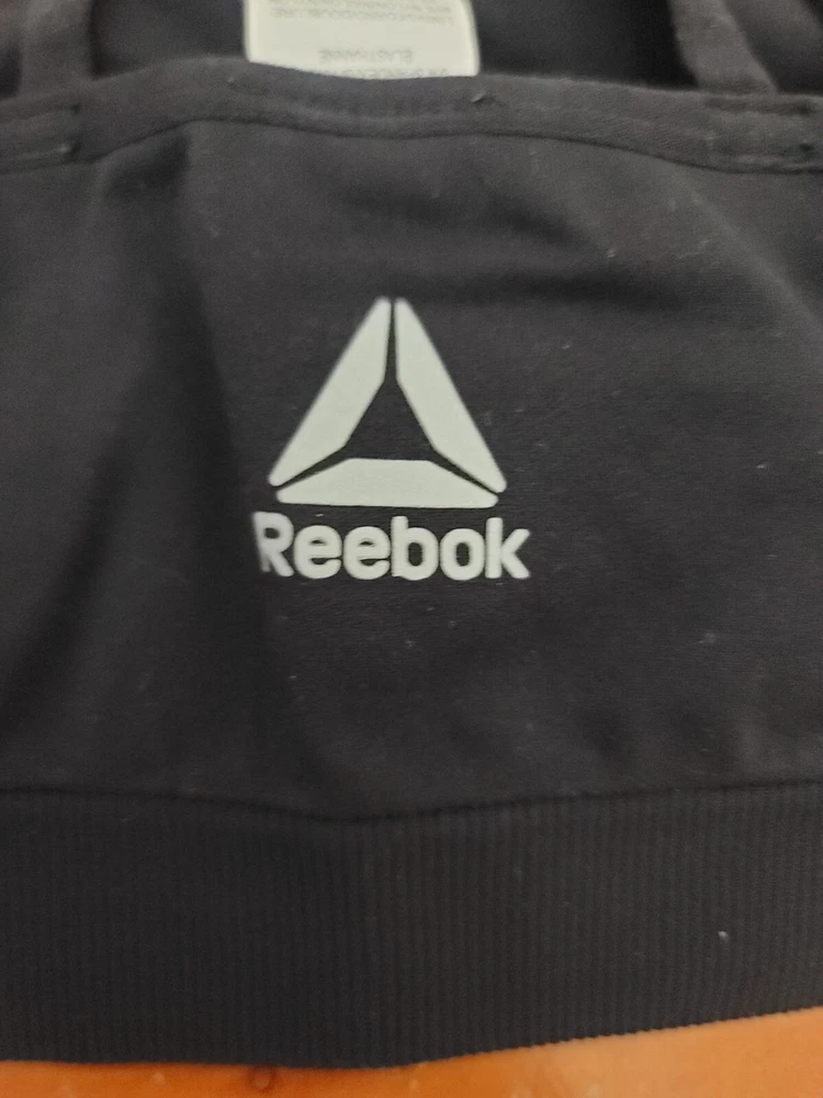 This Reebok sports bra, crafted from a nylon-spandex blend, offers support and style with crisscross straps and a sleek black design. • Strappy design • 95% Nylon, 5% Spandex • Reebok logo • Black color • Small size Underarm to underarm = 13 inches. No visible flaws detected. CONDITIONS use, good conditions. see photos for more details.