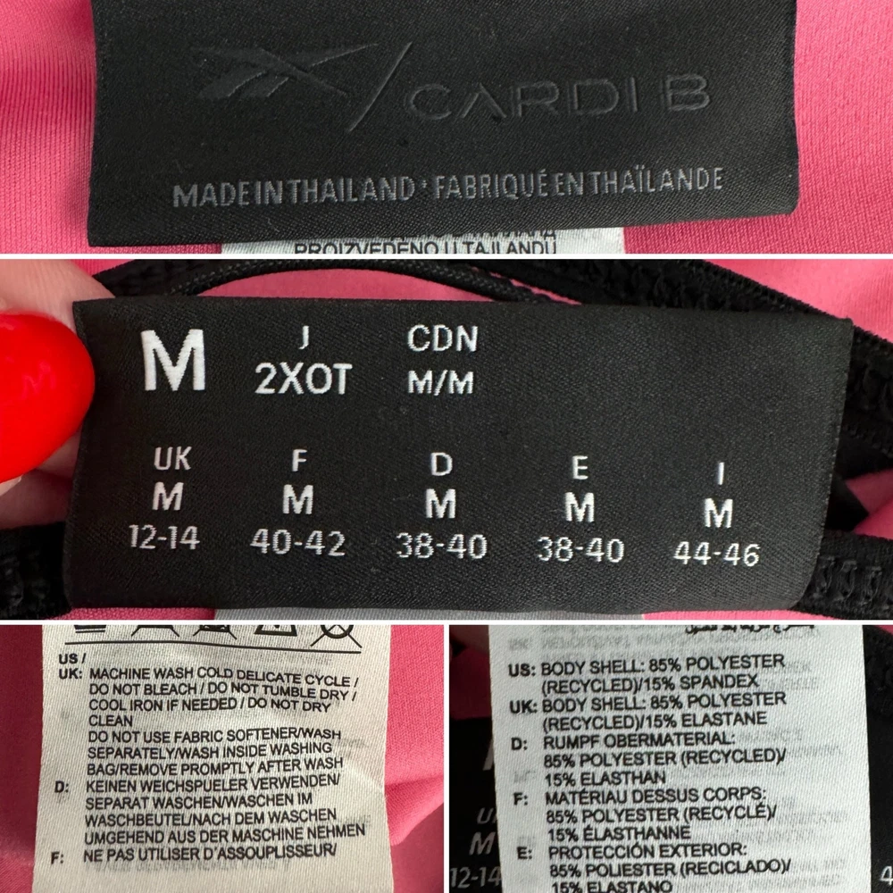 Great Reebok X Cardi B hot pink & black strappy sports bra! Measures flat unstretched Chest ~14.5" Lower band 12.5 Bodice length 5.5 Size: M •Condition: Excellent preowned •Color: hot pink & black Bundle for combined shipping! Pictures are part of the description. Measurements are approximate and for guidance. Color may vary by screen. Sizes vary between designers. ALL preowned items can be expected to show normal signs of wear. Smoke free, DOG FRIENDLY home. 10% of net sales go directly to charity at my local food bank.
