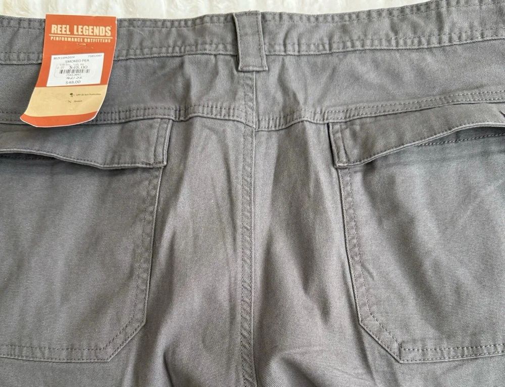 These Reel Legends cotton pants are perfect for any occasion, whether it's for travel, workwear, or casual wear. They come in a stylish gray-smoked pea color and a regular fit, with a straight leg style and a 5-pocket design. The pants have a flat front and a zip and button closure, making them comfortable and easy to wear. These pants are made from high-quality cotton material and are machine washable for easy care. They have a waist size of 42 inches and an inseam of 32 inches, making them suitable for men of all sizes. These khaki pants are perfect for any season, whether it's winter, summer, fall, or spring, and are a great addition to any wardrobe. See photos for new condition.