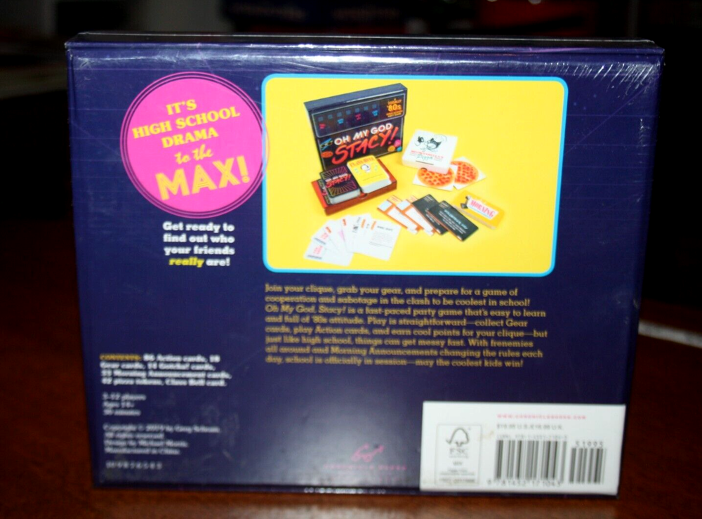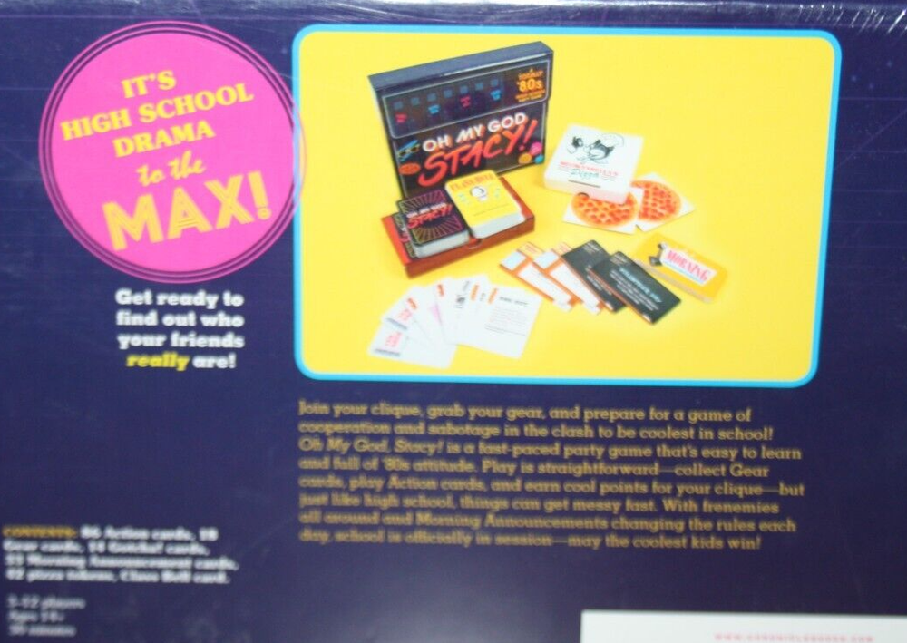 This game is new unopened in original Shrink Wrap. 100% Complete! Oh My God Stacy! A Totally 80’s High School Party Game It’s High School Drama to the Max! Get ready to find out who your friends really are! Join your clique, grab your gear, and prepare for a game of cooperation and sabotage in the clash to be the coolest in school! Oh my God Stacy! is a fast-paced party game that's easy to learn and full of 80s attitude. Play this straightforward, collect gear cards, play action cards, and earn cool points for your clique, but just like high school, things can get messy fast. With frenemies all around and morning announcements changing the rules each day, school is officially in session, may the coolest kids win! Contents: 86 Action Cards 18 Gear Cards 14 Gotcha Cards 33 Morning Announcement Cards 42 Pizza Tokens Class Bell Card Players: 3-12 Ages: 14+ Playing Time: 30 Minutes We love games! Buy with confidence!! We guarantee that all the games we offer have been inspected cleaned and contain all the pieces (100% Complete!). If games are not collectibles, we may tape up box edges for durability. We are a Smoke Free, Pet Free environment. We make sure that all games include rules. It will be noted if we had to print the rules off the internet. Any small flaws with the game that do not affect game play will be noted in the item description as well. Please check our listings; we are trying to list new games every week! If there is a game you have been hunting for, please send me a message, we have hundreds of games and parts, so I may already have it but just not listed it yet. IF YOU LOVE GAMES, SAVE US AS ONE OF YOUR FAVORITE SELLERS! We accept many forms of payment offered through eBay. If there is a problem with any item you receive, we will happily make it right, just contact us immediately for a solution before leaving feedback. Shipping We try to keep our shipping as low as possible, so we ship USPS Ground Advantage Mail which takes on average 2-4 days. We do offer expedited Priority Mail shipping at the buyers added expense. Please double check your shipping address on file with eBay, if it is different, please change before purchasing. We Use Recycled Shipping Material Whenever Possible. Thank you for reading this!! Happy Shopping!!