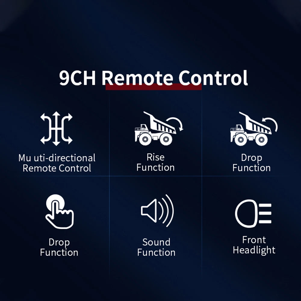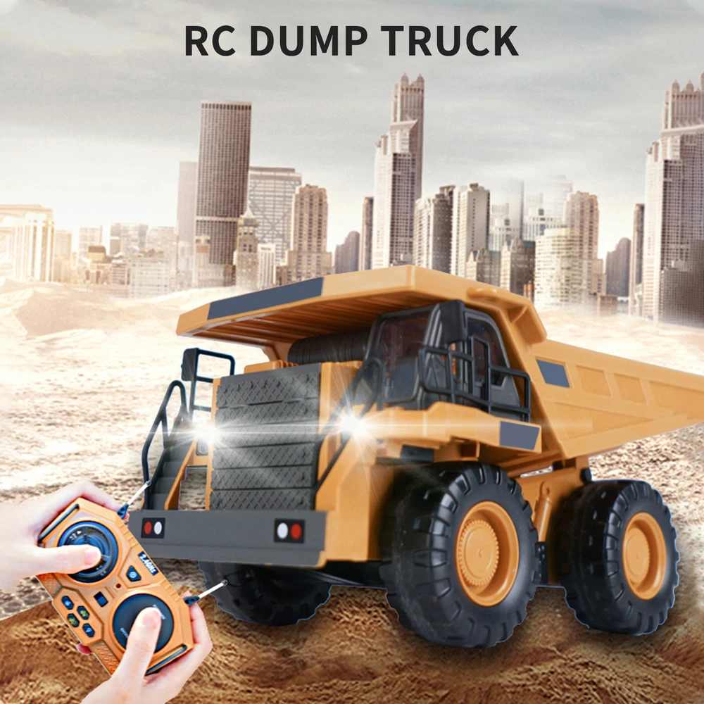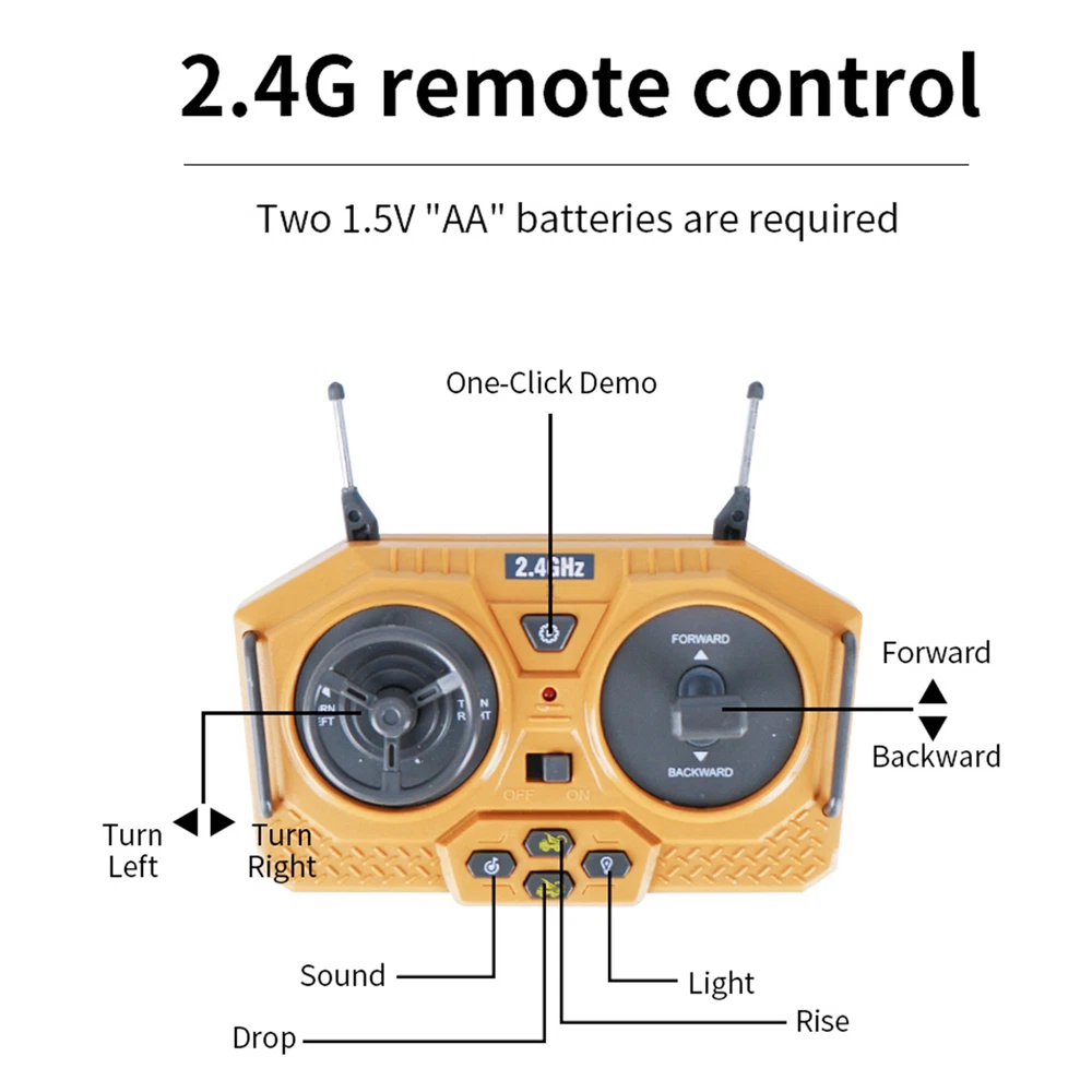 This is a cool RC engineering car, fun for kids and adults. It is the most realistic replica of a construction truck. The scale of RC construction truck is 1/24, and with powerful motor. The construction vehicle is made of high-quality material, and with realistic lights and sounds, it makes it even more fun and vivid. Best choice as a gift! Features: Function: Forward, backward, turn right, left, rise/drop, one-click demo, and with music and light. 2.4G Remote Radio: 2.4G anti-interference high-frequency remote control allows several RC cars can be used at the same time and without interfering with each other. High Quality Material: 1/24 scale 9CH, can be as collection, decoration. Good interactive between parent and kids. Made of high-quality material, unique design, exquisite workmanship and outstanding appearance. Lights and Sound: Highly bright light and realistic operation sound restore the real sense of the working site, giving you a feeling of immersive. Become the brightest presence on the street. Best Education Gift For Children: Promoting children's intellectual development, and good for children's interest cultivation and various ability development. Specification: Item Name: RC Dump Truck Scale: 1/24 Main Color: Yellow, Black Frequency: 2.4GHz Channel: 9CH Control Distance: About 30m Battery: 3.7V 500mAh Rechargeable Battery (Included) Battery for Transmitter: 2 * 1.5V AA Batteries (not Included) Running Time: 120mins Charging Time: 40mins Material: ABS, Electronic Component Application: Collection, Decoration, Entertainment, Gift Load Weight: 2.5KG Size: 21*12.5*10.6cm Note: There could be some deviations due to manual measurement or slight color difference as the result of shooting scene. Thank you for your kindness. This product contains electronic components, should not be used in water or in a humid environment, using a dry rag to wipe the dirty spot. Battery can only be charged under adult supervision. Package Information: Package Size: 27.5*15*11cm Package Weight: 640g Gift Box Package Packing List: 1 * RC Dump Truck 1 * Transmitter 1 * Battery 1 * Charging Cable 1 * Screwdriver 1 * User Manual Choose us, a good life begins!