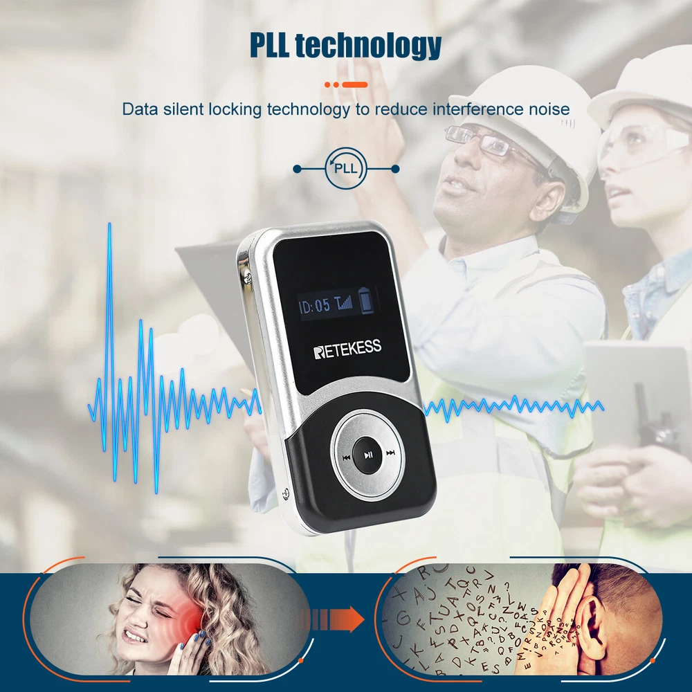 Shipping Service:Priority DHL Express Service when items ship from China.(2-7 business days) Retekess T131S Wireless Tour Guide Audio System Receiver for T130S Meeting Tour NOTE: This is wireless receiver only, it has to match our transmitter (T130S 195-216MHz,not be included in package) to build a wireless tour guide system, please feel free to contact us. Receiver Features: Portable design, the smallest and lightest PLL synthesized design, with high frequency stability 49 channel: allows 49 groups to operate simultaneously at the same place Built-in rechargeable lithium battery, make sure can use all day long LCD display, volume adjustable, battery consumption display, easy to operate Applications: Tour guide, Wireless meeting, Wireless teaching, Simultaneous interpreting, Corporate hospitality, Factory tour, Church sermon, etc.. Receiver Specification: Frequency range 195-216MHz Channel 49 channels Operating voltage DC 3.7V Audio frequency input 3.5mm line Frequency response range 50-18000Hz SNR 80dB(Typical) Image rejection ratio ≥90dB Degree of distortion <0.3% Effective working area 100m (empty) Capacity of battery 900mAh Working hours About 20 hours Size 73x 42 x 12mm / 2.8 x 1.6 x 0.5 in Weight 45g / 0.1lb Package Includes: 6 x Wireless receiver 6 x Single earphone 7 x Lanyard 1 x English manual Long working distance Signal transmission distance up to 100m/328ft, is ideal for keeping social distancing, such as tour guides, translators; factory visits; training meetings and other scenarios. The frequency range is 195-216MHz, helping tour groups overcome background noise and distance from the guide. One key to mute When the tour guide has to answer the phone during the explanation, he can turn on the mute function with one button on the transmitter instead of turning off the transmitter. PLL technology for signal stabilization PLL digital locking frequency synthesis design, more stable frequency, data mute locking technology, no interference noise. Ensures the clear and smooth audio transmission in a tour trip or in a conference. Ultra-long standby rechargeable battery Built-in 4200mAh lithium rechargeable battery in the transmitter can be used for 20 hours. Built-in 900mAh lithium battery in the receiver can be used for 20 hours. Long working time ensures your guests won’t miss any of your message,readily for a whole-day conference or journey. Wireless ID Setting Manual ID Setting We have 2 ways to set ID: Wireless ID setting and manual ID setting. Wireless ID setting works better for the occasion that if have to set the ID for many receivers, like a big conference; Manual ID setting works better for the occasion that if have to set the ID for few receivers, like a small class, a small group of tourists; Support 49 channels In the same tourist attraction, there will be multiple sets of equipment for explanations at the same time, and 49 optional channels will keep your team free from interference from other equipment. AUX and MIC dual-channel audio input The tour guide can play background music through the AUX function when explaining. Allow visitors to immerse themselves in the attractions. The clear and high-quality sound offers enjoyable listening experiences.. D-shaped earphones Compatible with left and right ears, it can reduce the burden on listeners who wear headphones for a long time compared to wearing headphones on one side. It is convenient to wear and solves the difficulty of using some hearing-impaired people, increasing the wearing options of users. Intuitive user interface LCD display for battery power, channel, volume, it is very easy to operate. The lit display design allows users to see information intuitively even in dark environments. Mini-sized The transmitter and receivers are mini-sized and light. Easily hang on your neck and it doesn’t cause neck pain even for a long-time wearing. Wireless tour guide system for a factory tour. Presenters don’t have to shout to compete with ambient noise. Tour group can adjust their own volume to a comfortable level. Make sure every visitor hear the introduction when the machines are working. About Us