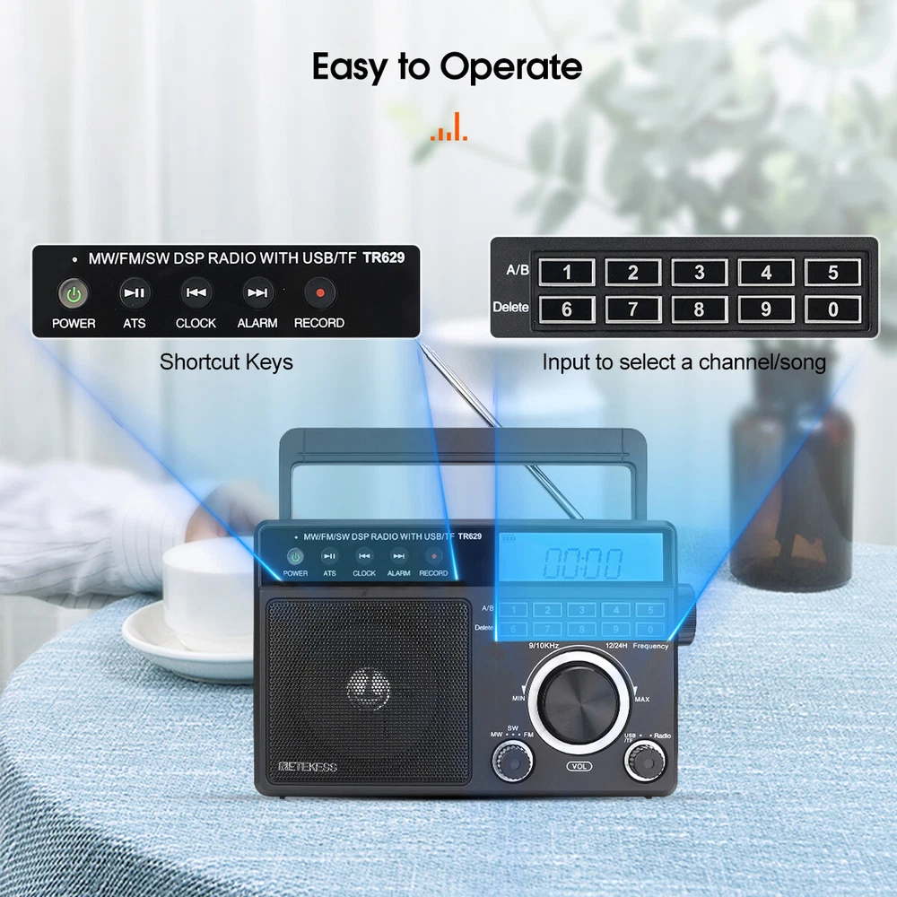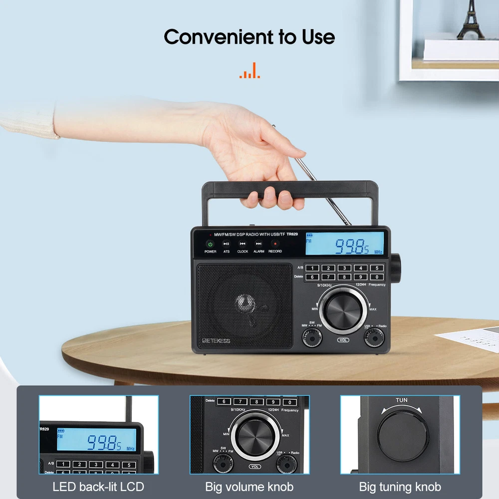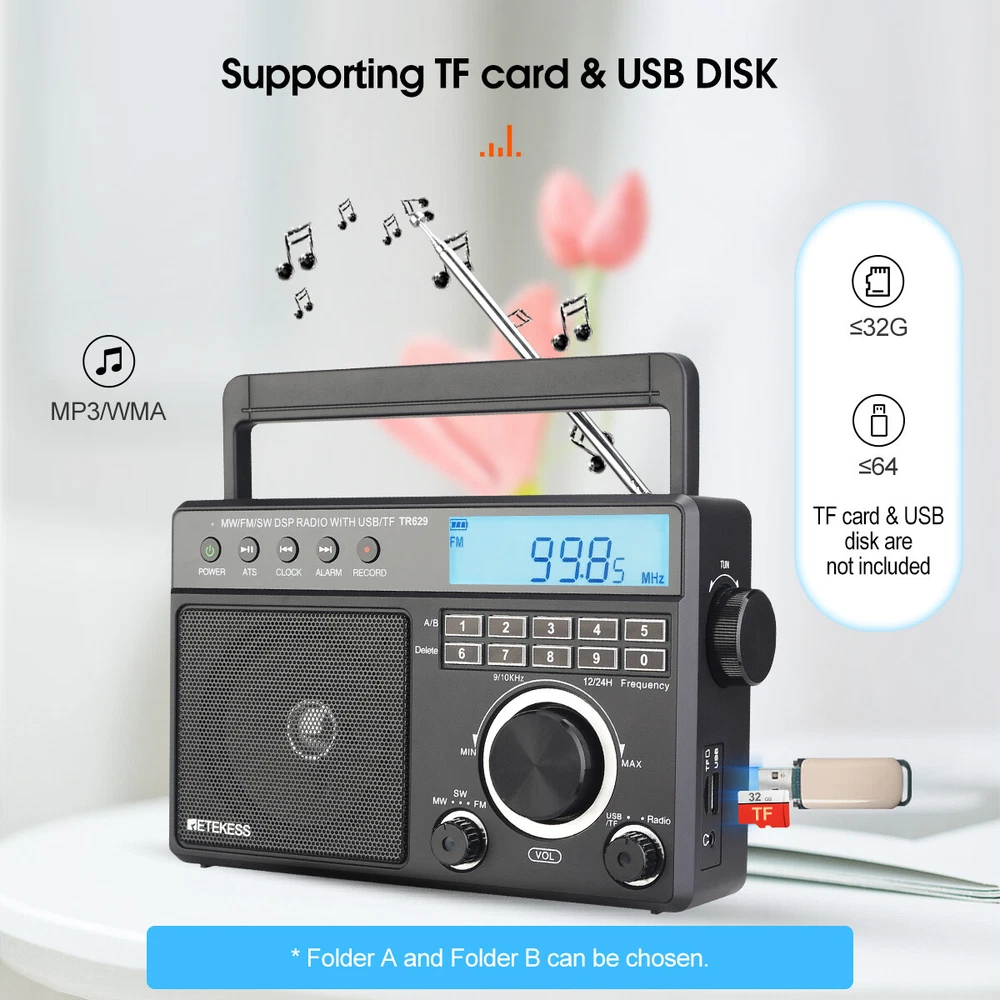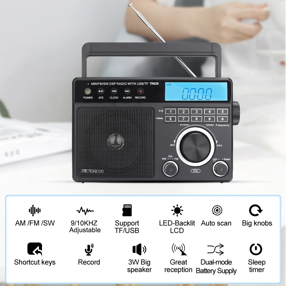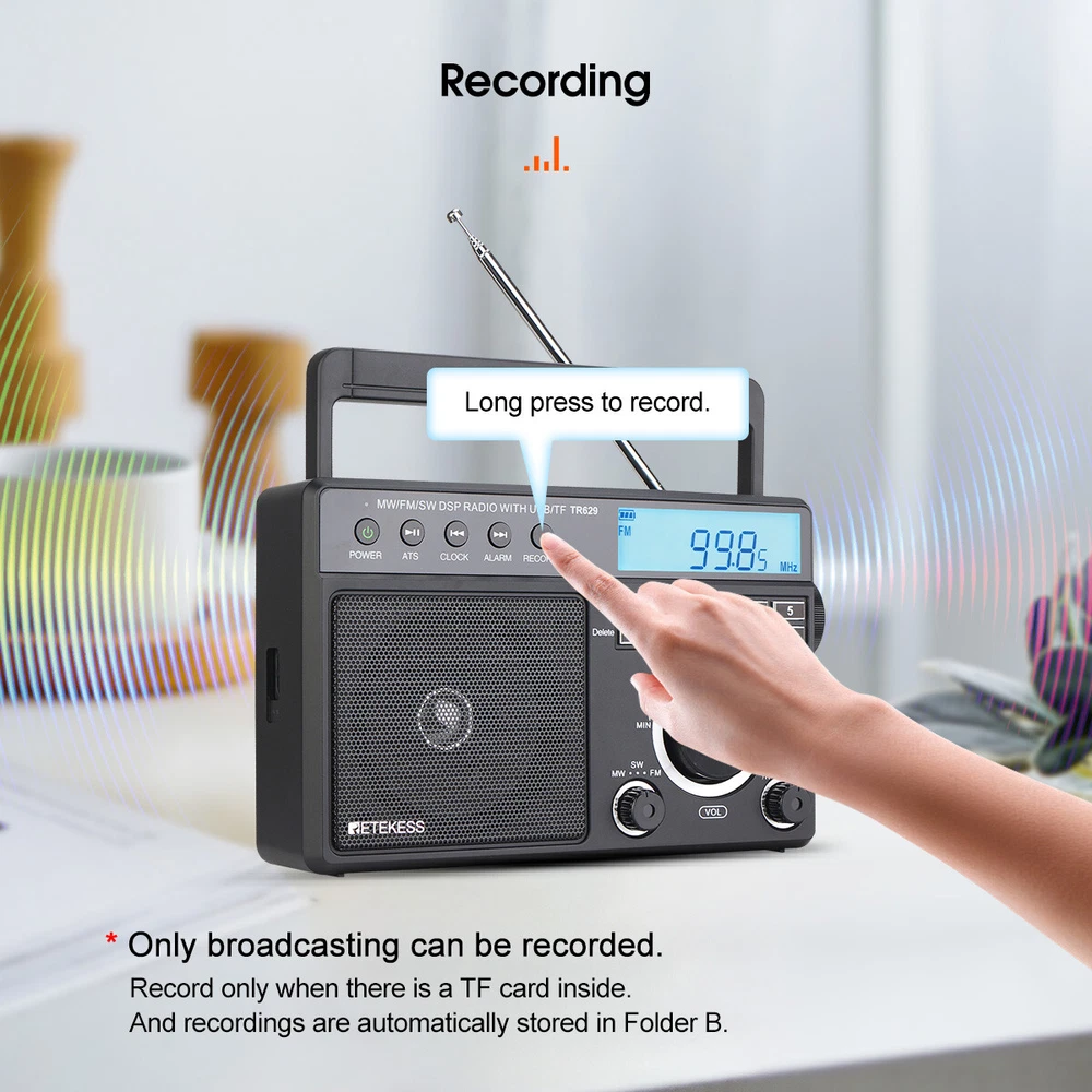 AM/FM/SW 3 band radio; FM(76-108MHz); AM(522-1620KHz); SW(2.3-21.19MHz); multiple bands enhance reception capabilities; lets you choose from more radio stations LCD screen improves the visibility; desktop radio displays power; temperature; frequency; 12/24 hour time; alarm clock and volume level; backlight design allows the elderly to operate the radio easily in the dark Playing external music; support U disk(128G) /Micro SD card(128G) play; digital radio can play your favorite MP3/WMA format music; Micro SD card or USB flash drive is not in the package One-click recording; insert the U disk/Micro SD card (not included) in radio mode; long press the record button to activate the function; recording the radio resources you like Optional power supply methods; AC charging cable (included) kee FM: 76-108MHz / AM: 522-1620 kHz /SW: 2.3-21.19MHZ Full band radio, 9 khz/ 10khz adjustable, widely used around the world. Both 60mm external antenna and the built-in antenna ensue the great reception at any band. If the station is not clear enough, the 360 degree adjustable antenna helps to get a clear reception. Adjust sound level in range: level 0-32. 3W speaker offers loud and high-quality sound. Greatly fills the room with your favorite music. Loud enough for the elder and people with hearing impairment. 3.5mm Earphone jack: plug earphones to enjoy your personal time. Feel peace in a noisy place in your private listening space. Only broadcasting can be recorded. Record only when there is a TF card inside. Recordings are automatically stored in Folder B Format: MP3, WMA; TF≤32G, USB≤64G (TF card & USB disk are not included); Folder A and Folder B can be chosen. Used as an MP3 player, company yourself with your favorite songs. Long press the play/pause button to auto scan. Press the previous or next button to another available station. Rotate the tuning knob to scan. Input numbers to the ideal station fast. Two ways to supply makes sure the radio can be used indoors and outdoors. Indoors, charge the radio through the AC port and listen to the radio for a whole day. Outdoors, supply the battery with 3*D batteries, get real-time listening. (batteries are not included) Easy to identify the current time, and you can switch 12h and 24h format. Alarm will wake you up or remind you of doing what you’re going to do. Three kinds of alarm rings are available to be chosen: alarm tone, the last song you listened to from TF card or USB disk, the last station you listened to. Setting a sleep timer when about to sleep, don’t have to worry about a whole-night playing. Reach stations or songs accurately. Remember and input the number, quickly reaching the station or song. Shortcut key: On/Off, auto scan, alarm, record and so on, one click to control, easy to operate. Big knobs are easy to operate and suited for the elder. Knobs are of good touch-feeling and accurate adjustment. The built-in handle makes the radio easier to carry outdoors. Won’t Miss Any Station: In FM/SW band, 0.05MHZ is adjusted on each rotating. In AM band, 1KHZ is adjusted on each rotating. There shows the battery status, mode and other functions on the screen. The LED-Backlit LCD is thoughtful for elders to us e especially in low-light conditions. Retekess TR629 Portable FM/AM/SW Radio Digital Big Speaker Recorder Clock Elder Feature AM/FM/SW 3 band radio; FM(76-108MHz); AM(522-1620KHz); SW(2.3-21.19MHz); multiple bands enhance reception capabilities; lets you choose from more radio stations LCD screen improves the visibility; desktop radio displays power; temperature; frequency; 12/24 hour time; alarm clock and volume level; backlight design allows the elderly to operate the radio easily in the dark Playing external music; support U disk(128G) /Micro SD card(128G) play; digital radio can play your favorite MP3/WMA format music; Micro SD card or USB flash drive is not in the package One-click recording; insert the U disk/Micro SD card (not included) in radio mode; long press the record button to activate the function; recording the radio resources you like Optional power supply methods; AC charging cable (included) keeps you listening to radio indoors; 3 D batteries (not included) keep this shortwave radio away from power outage How to tune? 1. Through the knob on the right, you can manually tune in steps. 2. The radio frequency can be input through the numeric keyboard. 3. In radio mode, long press the "CLOCK" or "ALARM" button on the left to automatically jump to nearby available radio stations. 4. In radio mode, long press the "ATS" button on the left to automatically search for radio stations. How to store and read radio stations? 1. In the radio mode, short press the "RECORD" button on the left to manually store the current station to the preset number you want. 2. During manual preset, the "MEM" at the top right of the screen will flash. At this time, you can switch the number you want to store with the knob on the right side of the radio. 3. In the radio mode, you can read the preset by pressing and holding the "0" button. When the "MEM" is flashing at the top right of the screen, select the preset you want to read by using the knob. 4. In the radio mode, if you want to delete a preset, just switch to the corresponding station and long press the "6" button to delete the current preset. Specification: Power input: AC 110V/ DC:4.5V (3 X D) Speaker: 3.5 inch\6 Ω\3W Size: 8.1x2.4x5.1 inches Weight: 29.17oz(not battery) Notice: The unit of temperature is displayed in degrees Celsius. AM band auto tuning step is 9KHz, manual tuning is recommended. It will be improved later. Package Includes: 1* TR629 Radio 1* AC Power Cable 1* User Manual About Us