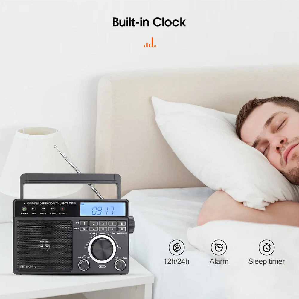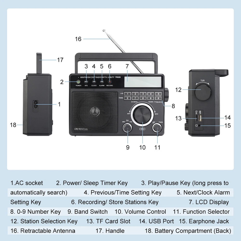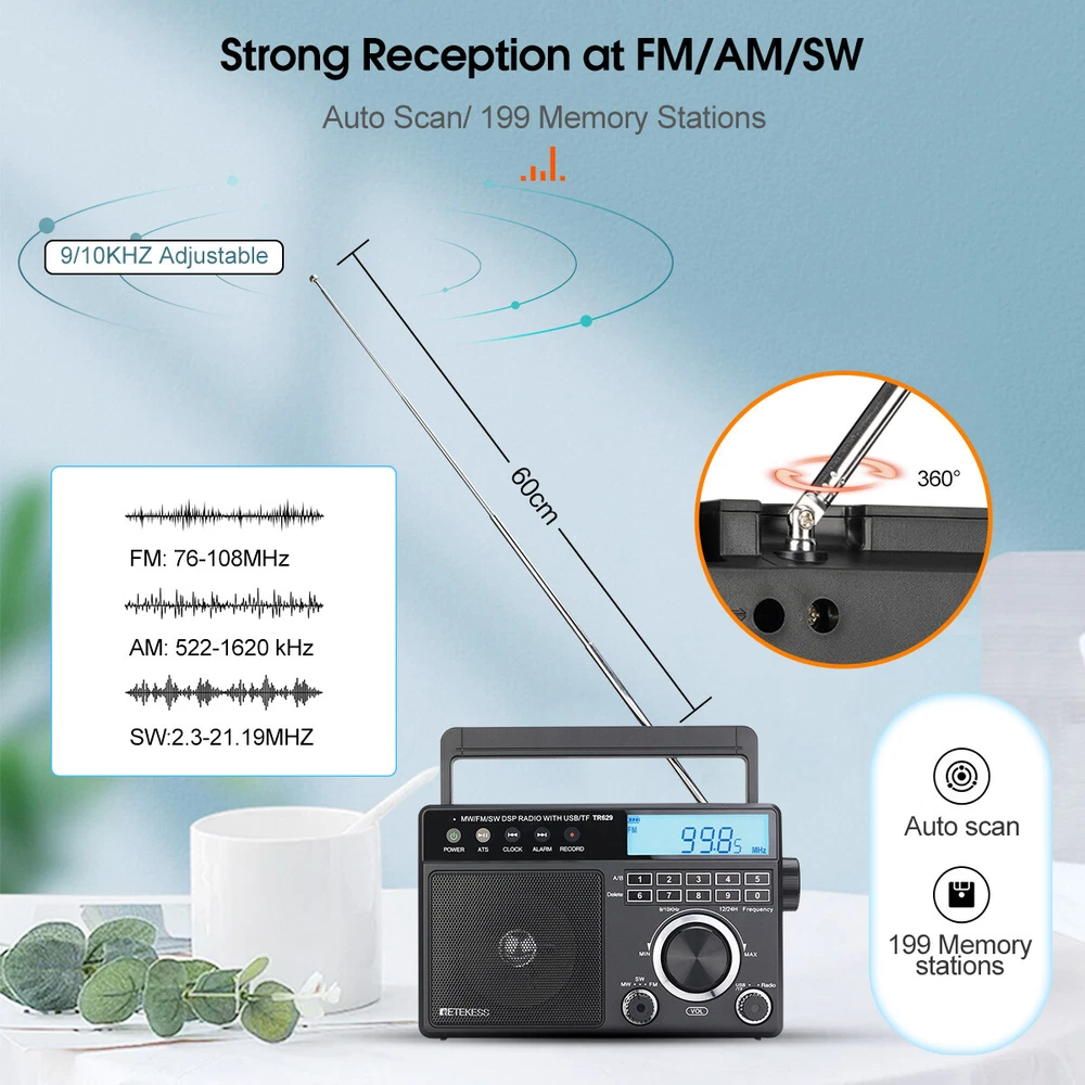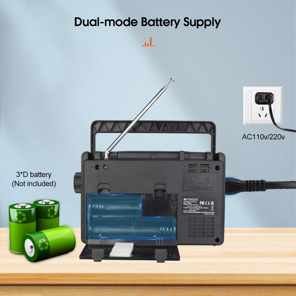 AM/FM/SW 3 band radio; FM(76-108MHz); AM(522-1620KHz); SW(2.3-21.19MHz); multiple bands enhance reception capabilities; lets you choose from more radio stations LCD screen improves the visibility; desktop radio displays power; temperature; frequency; 12/24 hour time; alarm clock and volume level; backlight design allows the elderly to operate the radio easily in the dark Playing external music; support U disk(128G) /Micro SD card(128G) play; digital radio can play your favorite MP3/WMA format music; Micro SD card or USB flash drive is not in the package One-click recording; insert the U disk/Micro SD card (not included) in radio mode; long press the record button to activate the function; recording the radio resources you like Optional power supply methods; AC charging cable (included) kee FM: 76-108MHz / AM: 522-1620 kHz /SW: 2.3-21.19MHZ Full band radio, 9 khz/ 10khz adjustable, widely used around the world. Both 60mm external antenna and the built-in antenna ensue the great reception at any band. If the station is not clear enough, the 360 degree adjustable antenna helps to get a clear reception. Adjust sound level in range: level 0-32. 3W speaker offers loud and high-quality sound. Greatly fills the room with your favorite music. Loud enough for the elder and people with hearing impairment. 3.5mm Earphone jack: plug earphones to enjoy your personal time. Feel peace in a noisy place in your private listening space. Only broadcasting can be recorded. Record only when there is a TF card inside. Recordings are automatically stored in Folder B Format: MP3, WMA; TF≤32G, USB≤64G (TF card & USB disk are not included); Folder A and Folder B can be chosen. Used as an MP3 player, company yourself with your favorite songs. Long press the play/pause button to auto scan. Press the previous or next button to another available station. Rotate the tuning knob to scan. Input numbers to the ideal station fast. Two ways to supply makes sure the radio can be used indoors and outdoors. Indoors, charge the radio through the AC port and listen to the radio for a whole day. Outdoors, supply the battery with 3*D batteries, get real-time listening. (batteries are not included) Easy to identify the current time, and you can switch 12h and 24h format. Alarm will wake you up or remind you of doing what you’re going to do. Three kinds of alarm rings are available to be chosen: alarm tone, the last song you listened to from TF card or USB disk, the last station you listened to. Setting a sleep timer when about to sleep, don’t have to worry about a whole-night playing. Reach stations or songs accurately. Remember and input the number, quickly reaching the station or song. Shortcut key: On/Off, auto scan, alarm, record and so on, one click to control, easy to operate. Big knobs are easy to operate and suited for the elder. Knobs are of good touch-feeling and accurate adjustment. The built-in handle makes the radio easier to carry outdoors. Won’t Miss Any Station: In FM/SW band, 0.05MHZ is adjusted on each rotating. In AM band, 1KHZ is adjusted on each rotating. There shows the battery status, mode and other functions on the screen. The LED-Backlit LCD is thoughtful for elders to us e especially in low-light conditions. Retekess TR629 Portable FM/AM/SW Radio Digital Big Speaker Recorder Clock Elder Feature AM/FM/SW 3 band radio; FM(76-108MHz); AM(522-1620KHz); SW(2.3-21.19MHz); multiple bands enhance reception capabilities; lets you choose from more radio stations LCD screen improves the visibility; desktop radio displays power; temperature; frequency; 12/24 hour time; alarm clock and volume level; backlight design allows the elderly to operate the radio easily in the dark Playing external music; support U disk(128G) /Micro SD card(128G) play; digital radio can play your favorite MP3/WMA format music; Micro SD card or USB flash drive is not in the package One-click recording; insert the U disk/Micro SD card (not included) in radio mode; long press the record button to activate the function; recording the radio resources you like Optional power supply methods; AC charging cable (included) keeps you listening to radio indoors; 3 D batteries (not included) keep this shortwave radio away from power outage How to tune? 1. Through the knob on the right, you can manually tune in steps. 2. The radio frequency can be input through the numeric keyboard. 3. In radio mode, long press the "CLOCK" or "ALARM" button on the left to automatically jump to nearby available radio stations. 4. In radio mode, long press the "ATS" button on the left to automatically search for radio stations. How to store and read radio stations? 1. In the radio mode, short press the "RECORD" button on the left to manually store the current station to the preset number you want. 2. During manual preset, the "MEM" at the top right of the screen will flash. At this time, you can switch the number you want to store with the knob on the right side of the radio. 3. In the radio mode, you can read the preset by pressing and holding the "0" button. When the "MEM" is flashing at the top right of the screen, select the preset you want to read by using the knob. 4. In the radio mode, if you want to delete a preset, just switch to the corresponding station and long press the "6" button to delete the current preset. Specification: Power input: AC 110V/ DC:4.5V (3 X D) Speaker: 3.5 inch\6 Ω\3W Size: 8.1x2.4x5.1 inches Weight: 29.17oz(not battery) Notice: The unit of temperature is displayed in degrees Celsius. AM band auto tuning step is 9KHz, manual tuning is recommended. It will be improved later. Package Includes: 1* TR629 Radio 1* AC Power Cable 1* User Manual About Us