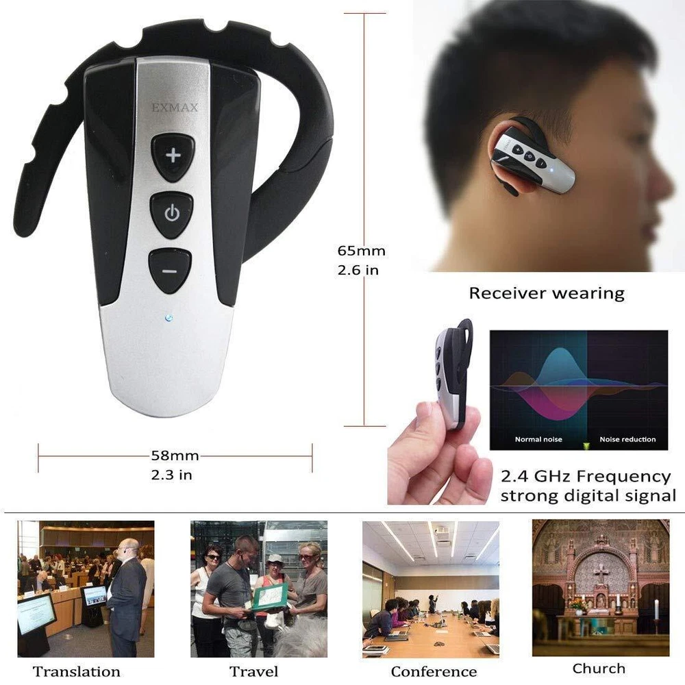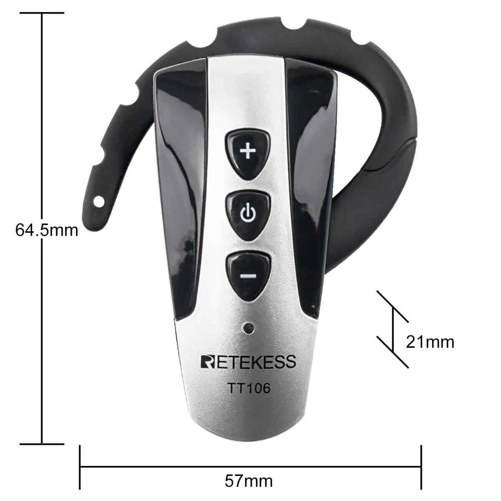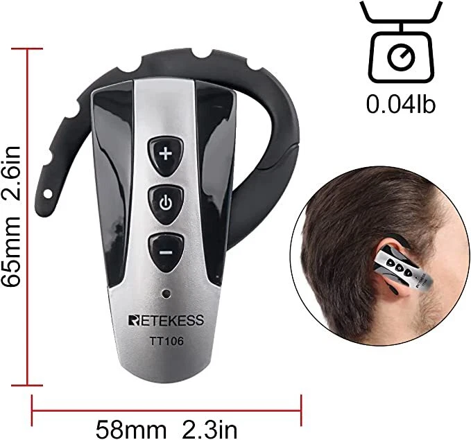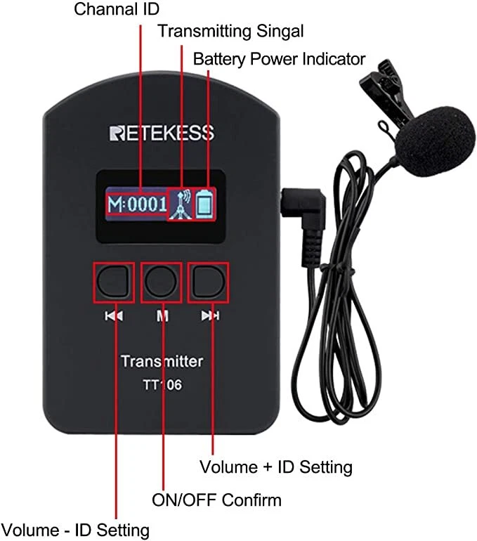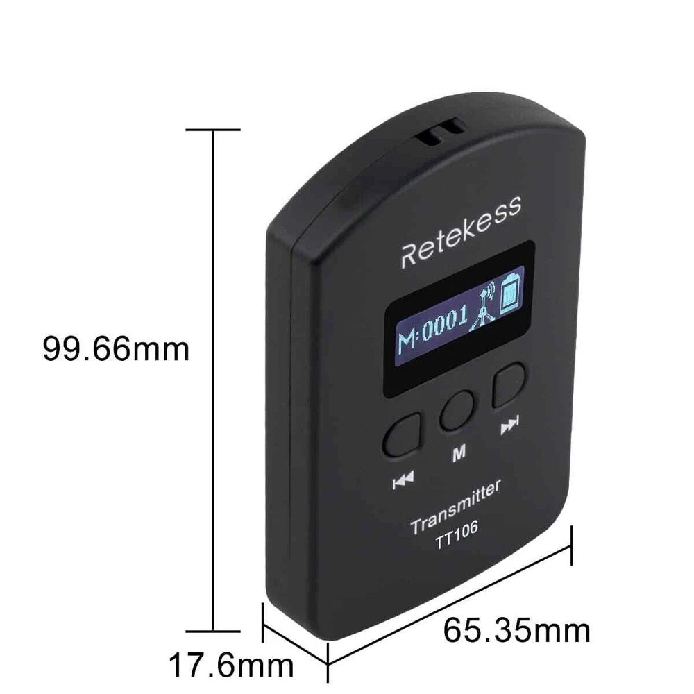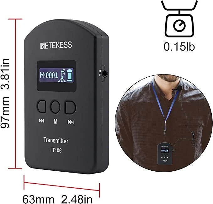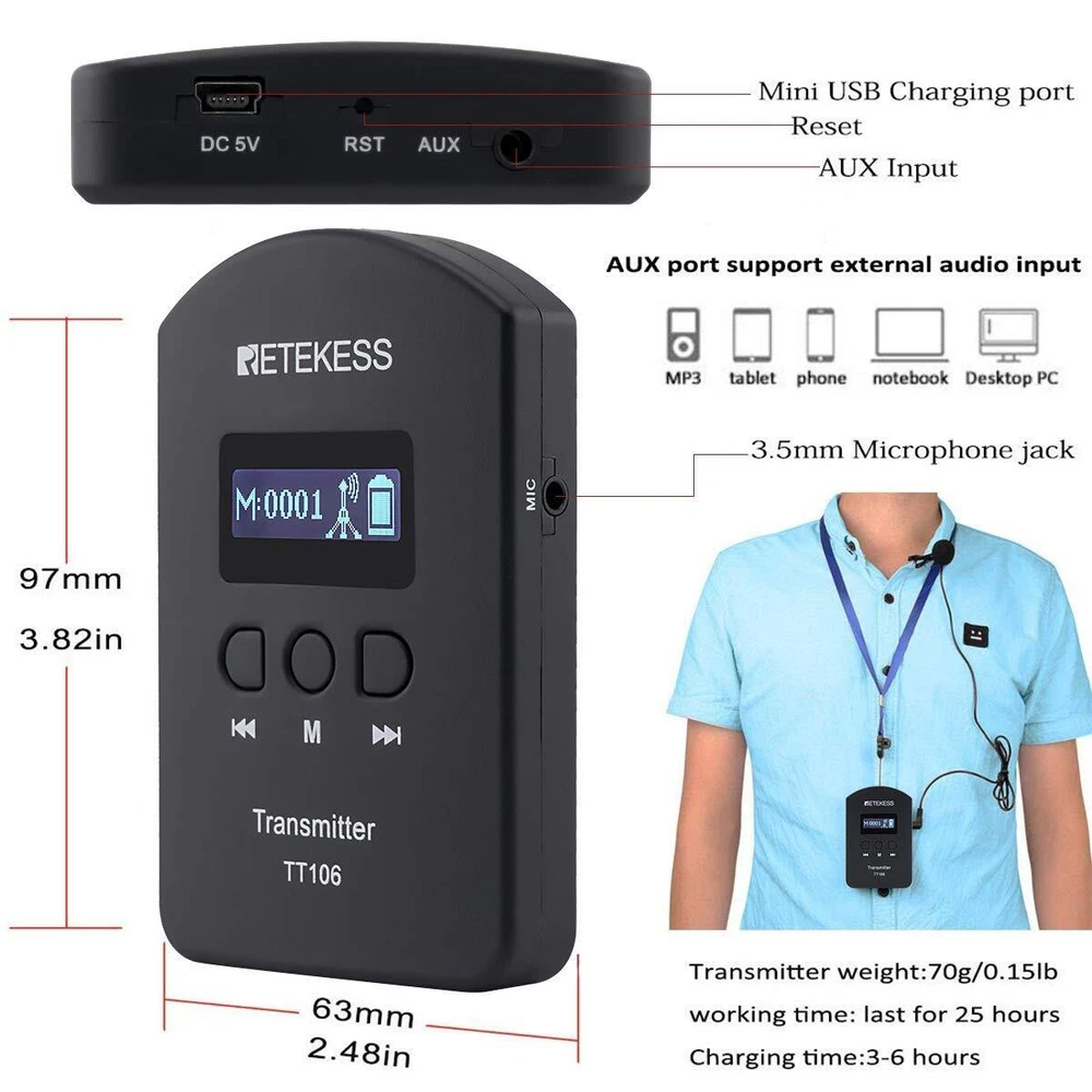 If you want to buy at more favorable price, or want to freely match the receiver, please contact customer service Shipping Service:Priority DHL Express from China to deliver item(2-7 business days) Retekess TT106 Tour Guide Audio Assisted System Transmitter 20 Receiver Training Features TT106 guide system with digital signal transmission; longer distance; higher confidentiality; strong anti-interference ability; clear audio quality; widely used in churches; simultaneous interpretation; seminars; exhibitions; art galleries and other learning activities ; special vocational training. Professional wireless audio guide system; adopt used globally signal transmission, with 9999 selectable channels; 9999 IDs allow up to 9999 tour groups to operate simultaneously in the same vicinity. One-click to set the channels of all receivers; one-click to turn off all connected receivers; one-click to mute all receivers; if the interpreter sometimes does not want the listener to hear him; he can press the mute button and the listener cannot hear his speech. Communication range up to 150 m / 492 ft; built-in 1300mAh rechargeable lithium battery in the transmitter can be used for 25 hours; and built-in 380mAh rechargeable lithium battery in the receiver can be used for 23 hours. Easy to carry; each small device comes with its own charger; small size; transmitter weighs 0.15 pounds and each receiver weighs 0.04 pounds; easy for listeners to use; the transmitter has a MIC input for the microphone; and supports mono external AUX audio input; such as smartphones; laptops; church audio systems. Specification TT106 Wireless Transmitter TT106 Wireless Receiver Frequency Range 2400~2483MHz Frequency Range 2400~2483MHz ID Number 9999 ID Number 9999 Supply Voltage DC3.7V Supply Voltage DC3.7V Transmitting power ≦50mW TIS -90dBm Frequency stability ±0.001﹪ Frequency stability ±0.001﹪ SNR 80dB SNR 80dB Size 97*63*18mm Size 65*58*11mm Weight 70g Weight 18g Charge time 3H Charge time 2H Working time 25H Working time 23H Battery specification 3.7V/1300mA Battery Specification 3.7V/380mA Charge Jack MINI USB Charge Jack MINI USB Modulation frequency deviation ±320KHz Modulation frequency deviation ±320KHz Working current 62mA Working current 15mA Communication range 150m (open air) Standby current 1mA Charging voltage DC5V Charging current 320mA Communication range 150m (open air) Charging voltage DC5V Package Includes 1 x TT106 Wireless Transmitter 20 x TT106 Wireless Receiver 1 x Lavalier Mic 21 x USB Cable 21 x Lanyard 1 x English User Manual Long Service Time 1300mAh rechargeable lithium battery for transmitter; 3H get full charged, 25H continuous use; 380mAh for receivers; 2H get full charged, 23H continuous use. AUX Input Jack Transmitter support 3.5mm AUX input which enables to connect a MP3, PC, phone, etc. to plug as sound sources; You can play background music or pre-recorded voice files by this function. One Key Mute Tour guide transmitter has mute function; If the interpreter sometimes does not want the audience to hear his speech, he can press the mute button and the audience will not hear his speech. 2.4GHz Global Public Use Signal Stable transmission; High security and confidentiality. Support 2 Transmitters Work Simultaneously Receivers could hear voice messages from two transmitters on the same channel; Note:If need more transmitters or receiveds,please contact our customer service. Translation System One click turn off all paired receivers; 9999 IDs allows 9999 tour groups to operate simultaneously in the same area; Unlimited number of receivers can be paired to a tour guide transmitter. Ear-hook Design for Tour Guide System Receivers Light weight, 18g for each receiver, 70g for each transmitter; Comfortable, no need to plug the receiver headset into ear; One click to make all receiver mute. USB Charging Tour Guide System Receivers USB chraging slots for each receiver; USB charging cable for each receivers are included; One click to turn off all connected receivers. Translation System for Churches You can adjust volume to a comfortable level without disturbing others; Set channels for all receiver simultaneously . About Us