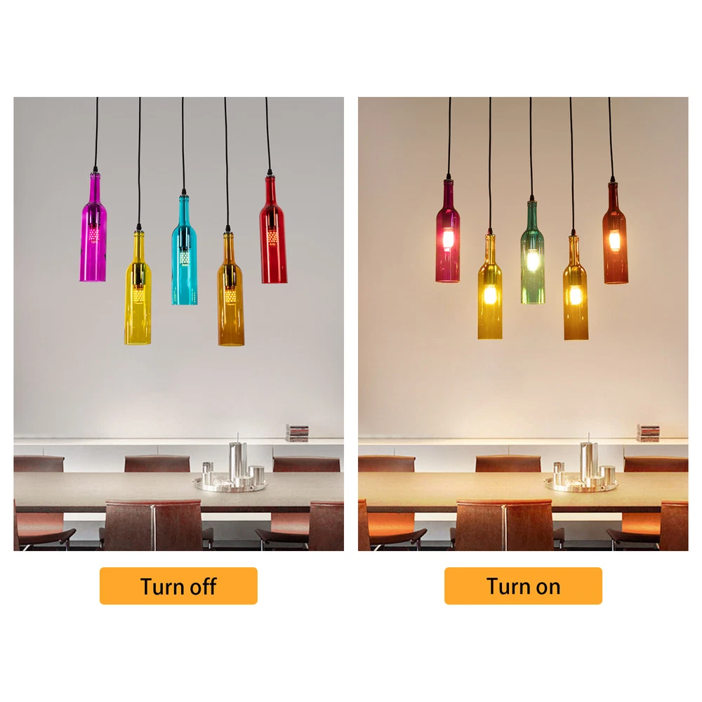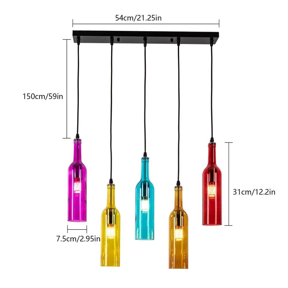 Power Source: Corded Department: All MPN: Does not apply Number of Lights: 5 Installation Area: Indoor Type: Pendant Country/Region of Manufacture: Unknown Lighting Technology: E27 Shade Shape: Bottle Control Style: Switch Control Features: Height-Adjustable gtin13: Does not apply Item Diameter: 7.5 cm Material: glass + metal Irradiation area: 10-15㎡ Base: 5*1 E27 bulb(Note: bulb not included) Feature 1: Compact Design, Unique Appearance Item Height: 31 cm Style: Vintage / Industrial Vintage Bulb Type: E27 Bulb Theme: 5-Bottle Light Brand: Unbranded Color: Bronze Five heads long size: 7.5 * 31 * D54cm Screen material: glass Wattage: Max 60W each UPC: Does not apply Voltage: AC 110V Assembly Required: Yes Sensor Type: Light Room: Bar, Bedroom, Dining Room, Hallway, Home Office/Study, Living Room EAN: Does not apply