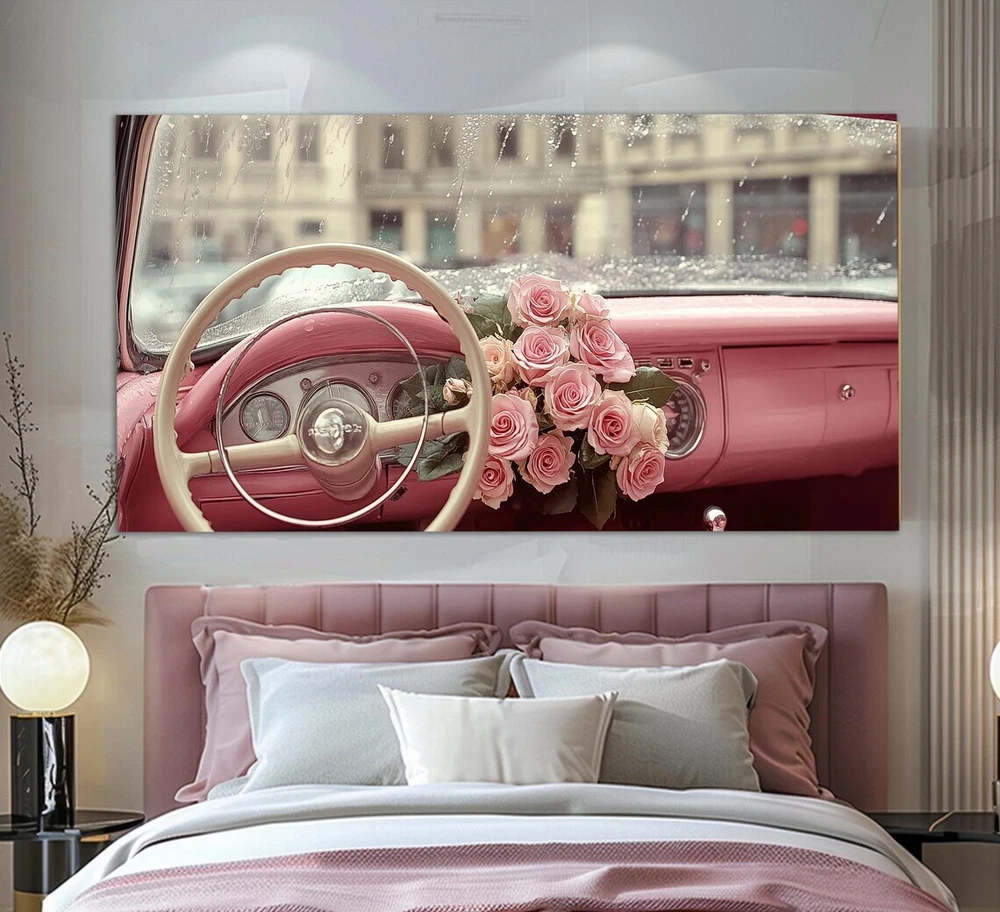 Retro Ladies Car Vintage Pink Roses Unframed Canvas Print Australian Wall Art