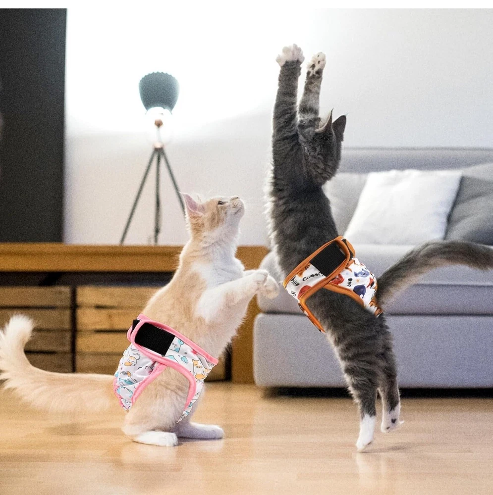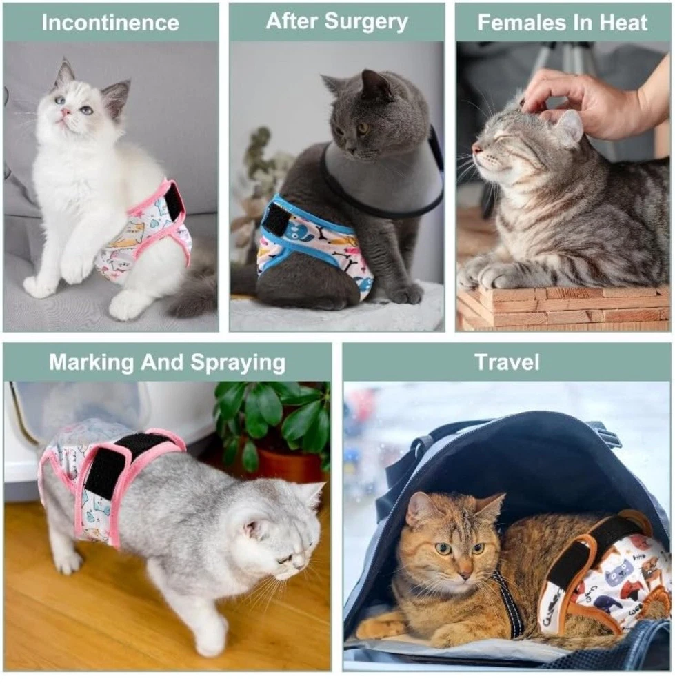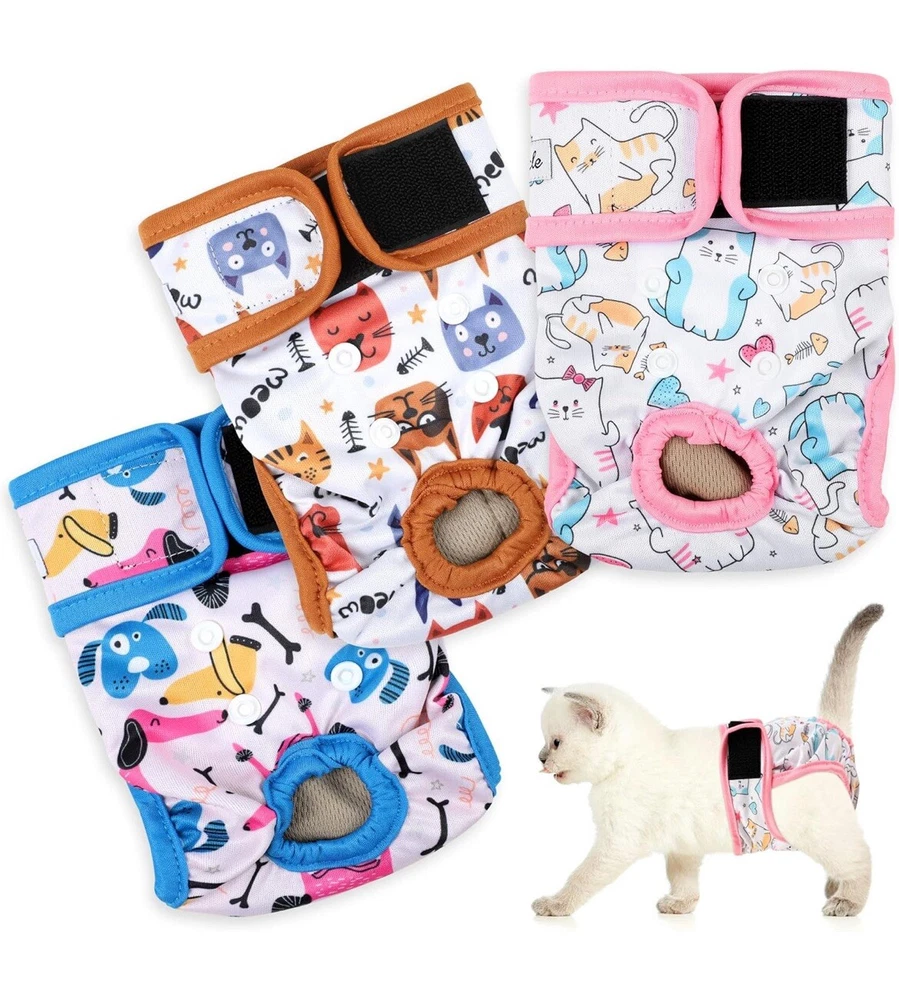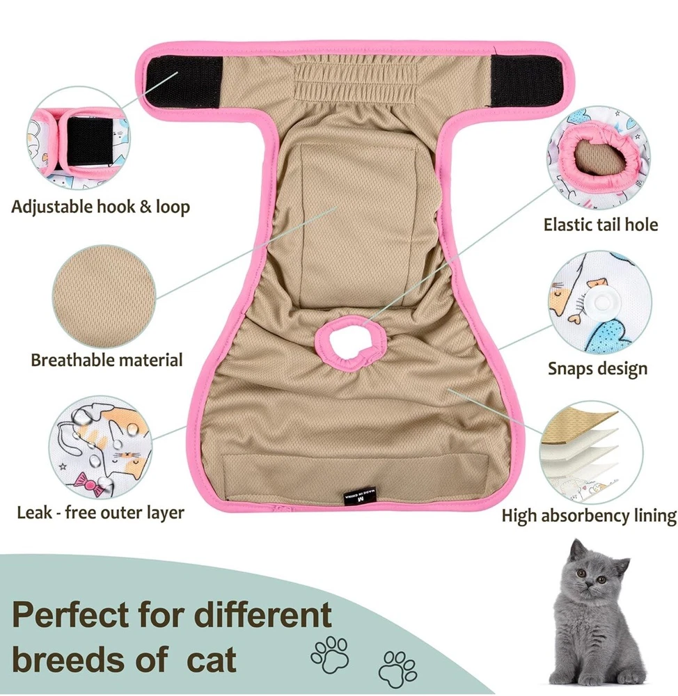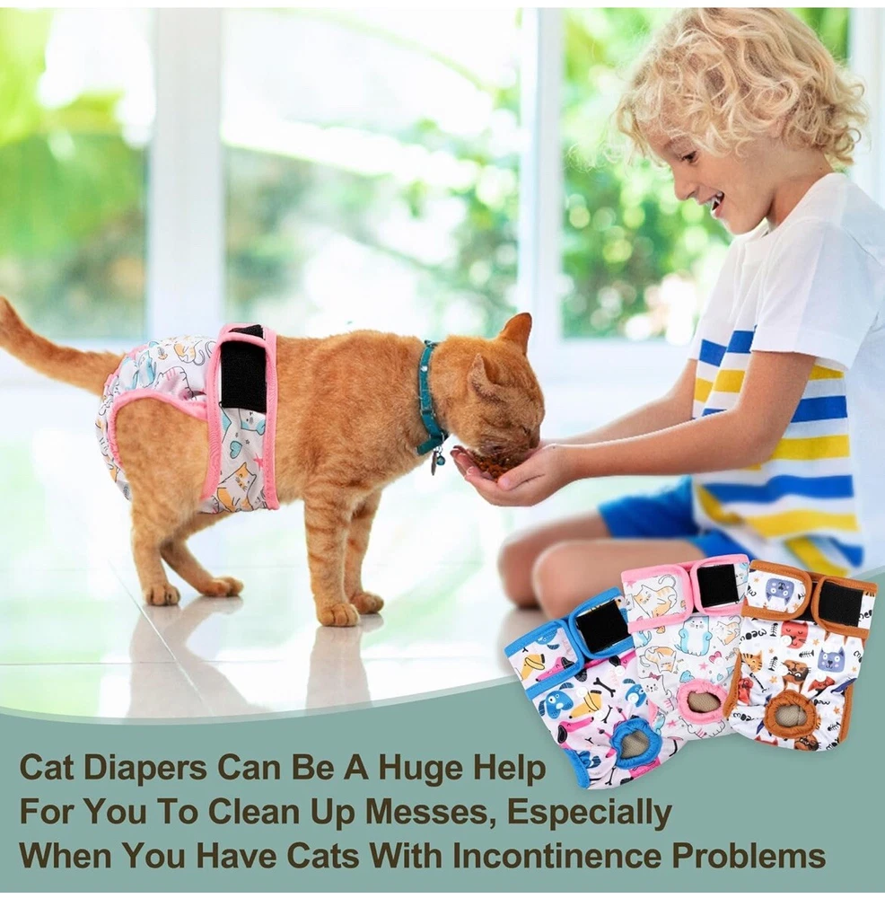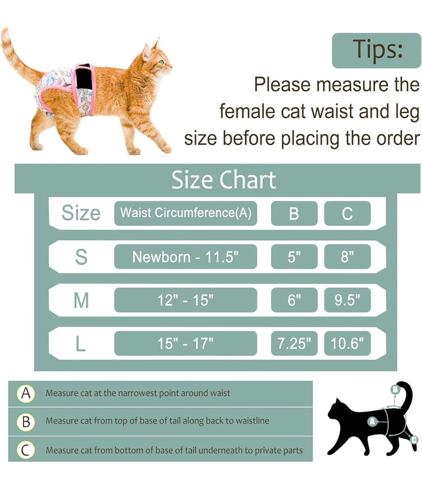 We bought these for my senior cat, but he has become too skinny so they are out of the package but have not been used Cat Incontinence Diapers - Large cat diaper waist about 15" to 17" great for extra large cats or female tiny dogs, 4-8 lbs. Please measure kitten waist data in front of the back legs to make a better fit and leave some space to ensure comfortable. We have different sizes of diapers for cats of all growth stages. Adjustable & Comfortable - There are adjustable hole on female cat diaper that convenient for you to adjust the hole according the size of your pets tail,the cat diapers can catch and hold the poop or diarrhea without leaking. We extra added an adjustable hook & loop ensures that cat diapers for female cats won't slip off, and the elastic bands on the thigh and tail sides ensure that the cat is comfortable to wear. Premium Material - Made from premium materials, these cat diapers are soft and skin-friendly, with multiple layers of padding to ensure adequate absorbency. The highly absorbent liner is paired with a waterproof fabric to prevent leaks and damage to carpets, upholstered chairs and sofas, doubly ensuring no leaks to drive you crazy. Our cat diapers are a great solution to discomfort without the rubbing, itching or irritating texture of disposable diapers. Reusable and Adorable - There are 3 cat diapers in a pack, so you can be sure your cat always has clean diapers to wear. And these kitty diapers are reusable, just wash and dry them and use them again, now you can save a lot of money on those disposable diapers. These three diapers come in three different patterns, your cat will love these and your mood will change when you see your cute cat in these adorable cat diapers for female cats! Ideal for Daily or Travel - Grecle cat diapers is your great choice whenever daily use or travel, convenient use disposable pet diapers to prevent some unwanted urination. Suit for newborn kitten or puppy, untrained dogs, incontinence urination, have health issues pets etc.