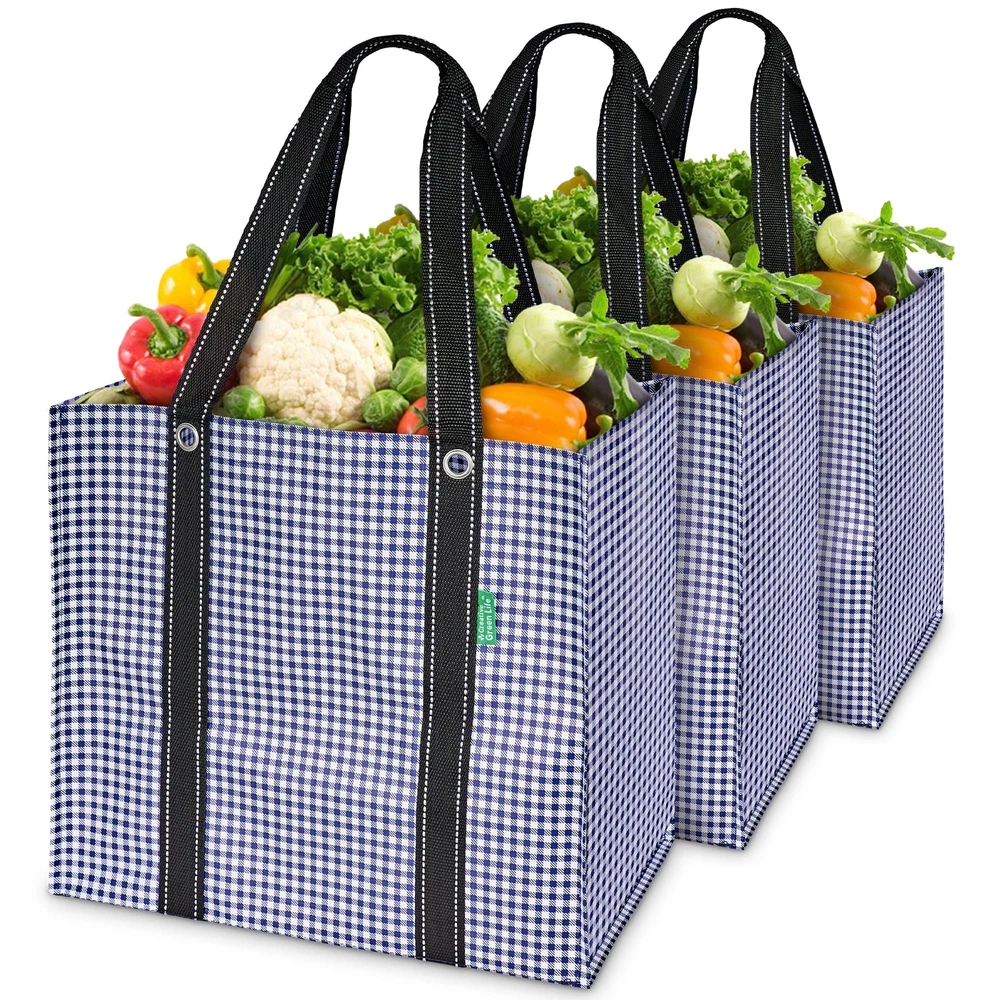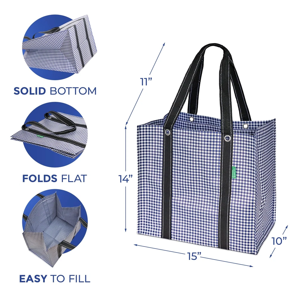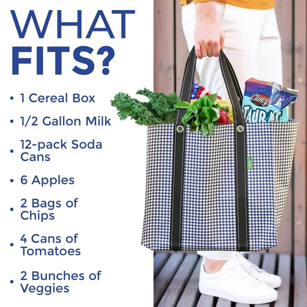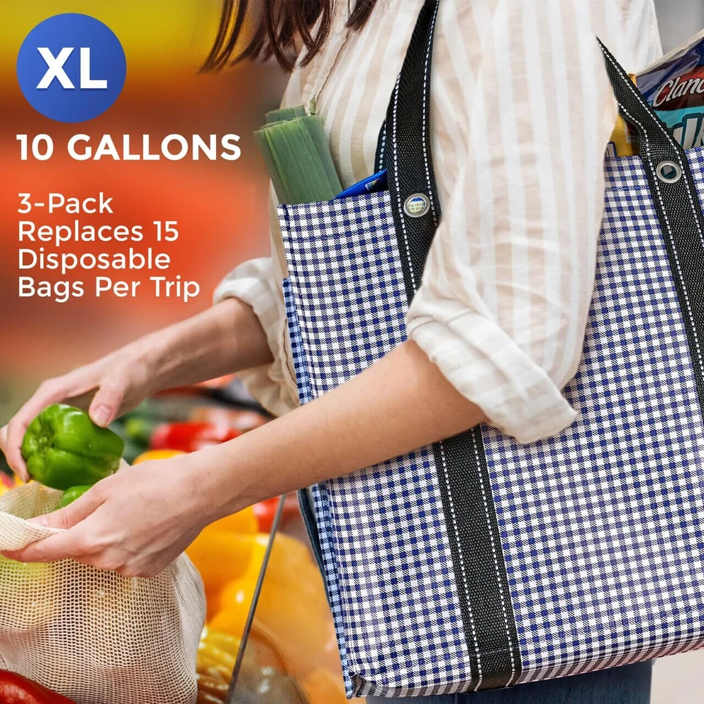 Introducing the Large Heavy Duty Grocery Tote Bag for Groceries, an essential companion for any grocery shopper. These durable washable grocery bags have a hard, flat PE board bottom that ensures stability, allowing them to stand upright in your trunk and at the checkout counter. Crafted from all-weather woven polypropylene, these grocery reusable bags combine lightweight and water resistance, making them easy to carry and ideal for any weather condition. The fabric of these washable and reusable grocery bags retains its shape even when wet, dries quickly, and is made to last. With dimensions of 14 inches high, 15 inches wide, and 10 inches deep, these large grocery bags for men and women offer ample room for all your groceries. These heavy-duty tote bags eliminate wasted single-use bags, and they fold effortlessly for convenient storage in your pantry or trunk. Discover the convenience and reliability of this large reusable bag from and enhance your shopping experience every time. Makes Your Shopping So Much Easier! These large reusable bags with handles feature a flat rigid bottom and thick fabric sides allowing your bag to stand up & stay open in the checkout line. Additionally, each reusable tote bag is super stable so it won’t tip over in your trunk Extra Large 10-Gallon Size: With a 3-pack of our reusable shopping bags for groceries, you can carry the same as 15 single-use grocery bags! Ideal for large family shopping trips, carrying bulky items, and organizing produce, meats, and grocery items while you Stylish, Sturdy & Made to Last: Heavy duty grocery bags are water-resistant and crafted using lightweight yet super strong all-weather fabric with cute bag patterns & webbing belt handles. The bottom is reinforced with waterproof PE board, so rain, snow and spills won’t ruin your durable tote bag Easy to Clean: Simply use a damp cloth or sanitizer wipe to clean your reusable shopping bag – Once cleaned, allow to air dry, ensuring each washable tote bag for groceries remains fresh, hygienic, and ready for future use Fold Flat Design: This large reusable tote bag with handles is collapsible and allows for easy storage in your pantry or trunk. These heavy-duty grocery bags with handles are always ready for your next shopping trip without taking up much space