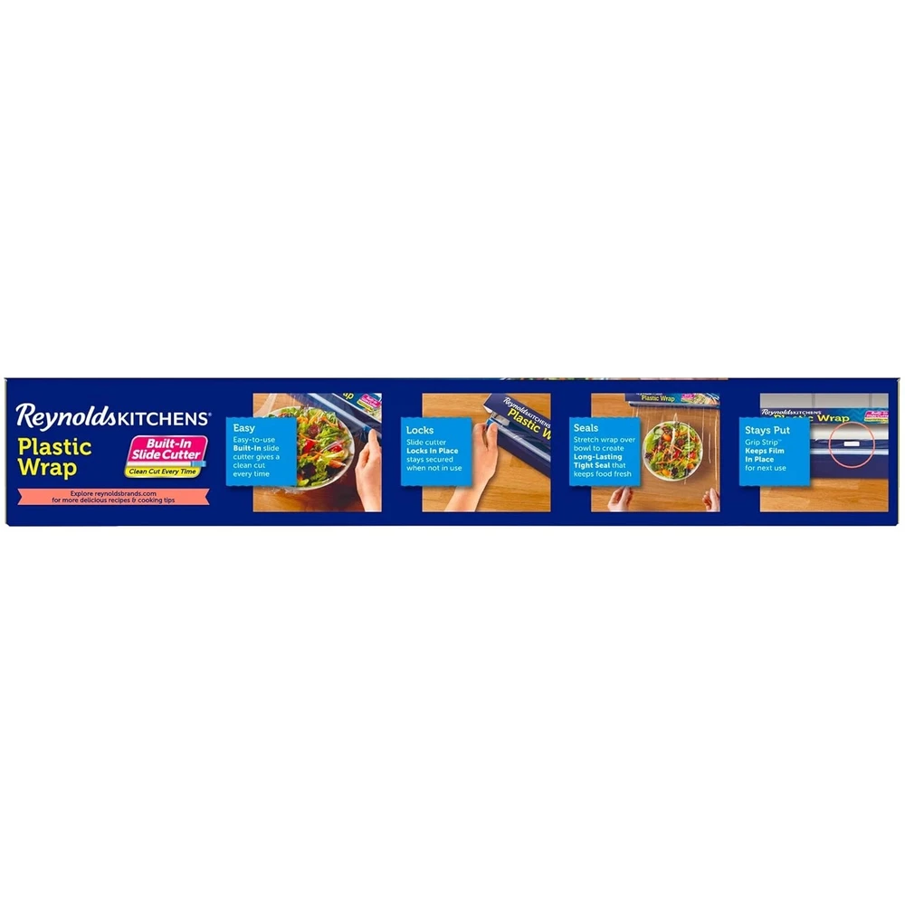 About this item CLING WRAP WITH SLIDE CUTTER —Contains one roll of Reynolds Quick Cut Plastic Wrap with slide cutter, measuring 225 feet long by 12 inches wide (225 square feet) CLEAN CUT EVERY TIME —Built-in slide cutter delivers a perfectly-sized, clean cut of cling wrap every time HANDY STARTER EDGE TAB —Blue Reynolds tab on every roll eliminates the frustration of finding the starting edge of the plastic food wrap AUTOMATIC END TABS —Automatic end tabs hold roll securely in box for more control during dispensing GRIP STRIP—Clingy Grip Strip edge helps hold plastic food wrap in “ready position” until your next use
