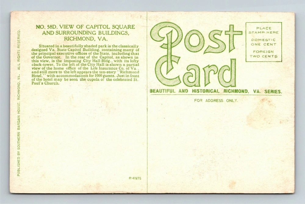 City: See Detailed Scan Region: See Detailed Scan City/Region: Richmond Country: See Detailed Scan Theme: Cities & Towns Postage Condition: Unposted Type: Printed (Lithograph) State: Virginia Subject: See Detailed Scan Era: See Detailed Scan Country/Region of Manufacture: Unknown Unit of Sale: Single Unit Original/Licensed Reprint: Original Circulated: Yes
