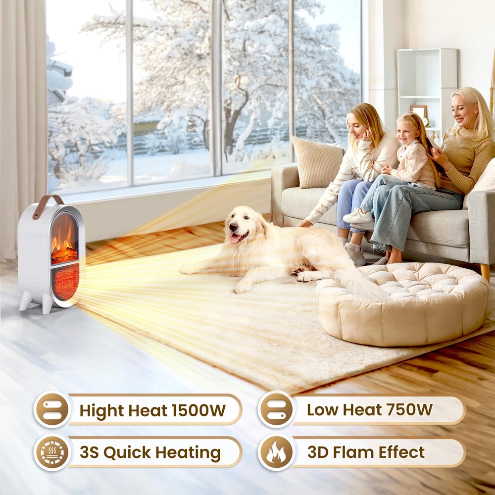 2-IN-1 SPACE HEATER FAN: This small space heater utilizes ceramic heating technology and offers two heating levels, 1500W or 750W and a cool air fan that you can use in both winter and summer ADJUSTABLE THERMOSTAT: Adjust the thermostat to MIN, the heater will keep blowing cold air, adjust the thermostat to MAX, the heater will keep blowing hot air, with the thermostat in the middle, the heater will blow air to dissipate once the heater reaches the preset temperature, and then blow hot air again when the temperature falls below the thermostat setting REALISTIC 3D FLAME: This portable electric heater uses resin simulated charcoal to create a realistic 3D dynamic flame without smoke or noise, creating the ambiance of a real fireplace, adding warmth and comfort to your home TIP-OVER & OVERHEAT PROTECTION: This small fireplace heater is made of flame retardant material which effectively reduces any fire hazard. The overheat protection automatically shuts off the heater when it reaches a critical temperature. The tip-over protection system also shuts off the heater when it is accidentally knocked over, and after righting the heater, the heating function needs to be turned on again for added safety, perfect for families with children and pets PORTABLE AND POWERFUL: Our mini heater comes with a carrying strap, allowing you to easily move it to the space you want. Whether it's for your bedroom, living room, study, office or other space, its light weight and convenient design make it the best partner in winter