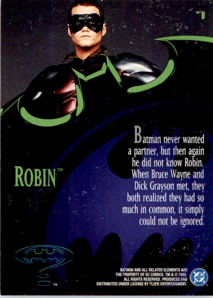 Card Number: 7 Season: 1995 Player/Athlete: Robin Year Manufactured: 1995 Set: 1995 Ultra Batman Forever Autographed: No Franchise: NON_SPORT Type: Non-Sport Trading Card Graded: No