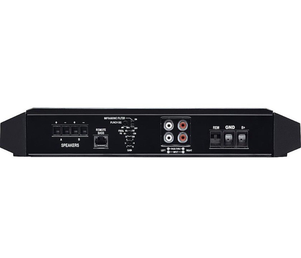 mono subwoofer amplifier 700 watts RMS x 1 at 4 ohms (1,000 watts RMS x 1 at 2 ohms) 1,000 watts RMS x 1 at 1 ohm CEA-2006 compliant Dynamic Thermal Management cooling system variable low-pass filter (35-250 Hz, 24 dB/octave) selectable subsonic filter (28 Hz, 12 dB/octave) variable bass boost (0-18 dB at 45 Hz) optional wired remote bass boost Class-BD amplifier design MOSFET power and output stages preamp-level inputs preamp outputs 4-gauge power and ground leads and an 150-amp fuse recommended — wiring and hardware not included with amplifier no onboard fuses — when installing multiple amps in a system, an additional 150-amp in-line fuse between the distribution block and the amplifier is recommended 13-11/16"W x 2-1/4"H x 8-15/16"D warranty: 1 year