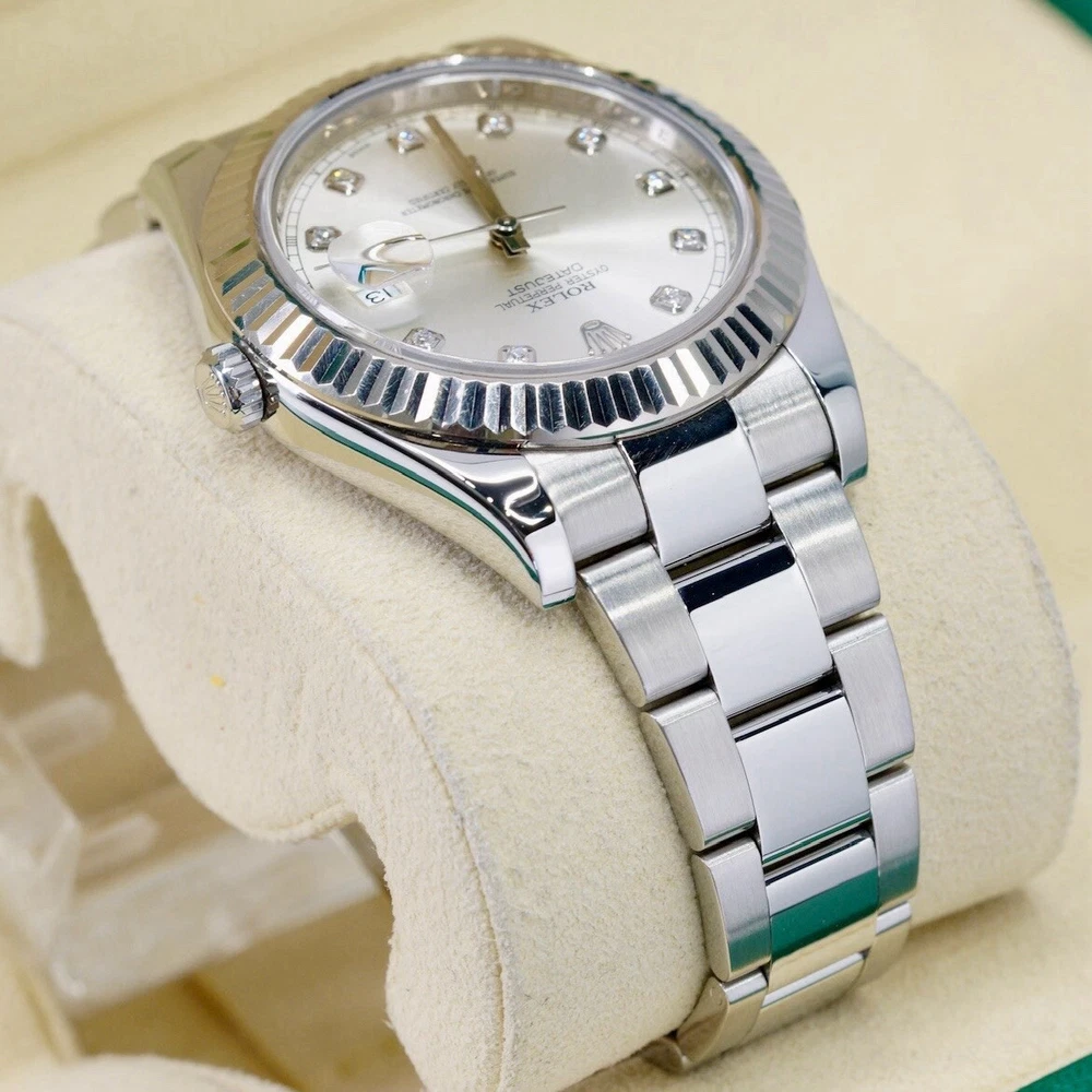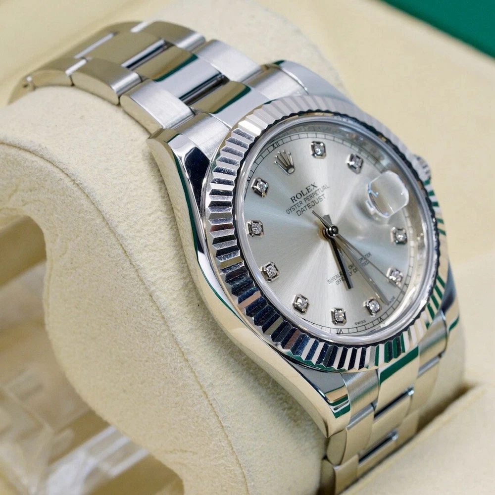 Description GENERAL DESCRIPTION The 116334 is an expression of timeless prestige. It features a silver Diamond dial that add a touch of classic sophistication. Its 41 mm stainless steel case, complemented by a white gold bezel, perfectly fuses durability and luxury. Equipped with a high-precision automatic movement, it guarantees exceptional performance and reliability. WATCH DETAILS The watch is in excellent condition. Clea crystal and bezel. If you have any additional questions regarding the condition of the watch please do not hesitate to contact us. ABOUT US We are a company dedicated to buy and sell luxury watches. We have the highest quality standards and the most detailed selection processes. Each of our pieces is previously checked by our watchmaker to authenticate the quality of the piece. DISCLAIMER 1 - We use a macro lens for professional photography, it is possible that dust or particles may be perceived in the picture. The description of the watch is given in the description 2 - When packed, the watch is handled carefully and meticulously, however, due to transportation and delivery, slight handling marks may occur. COMES WITH Box : Yes Papers : Yes
