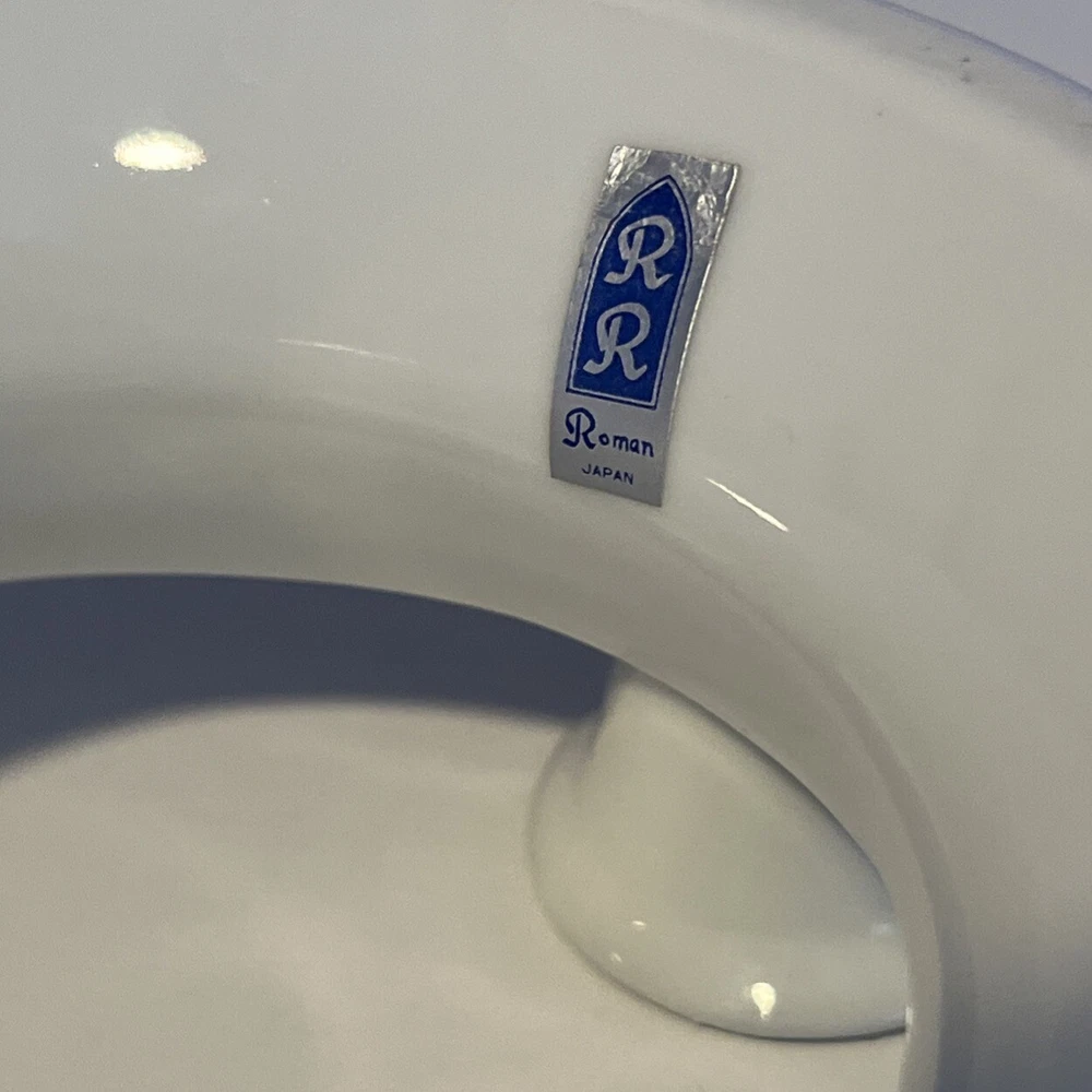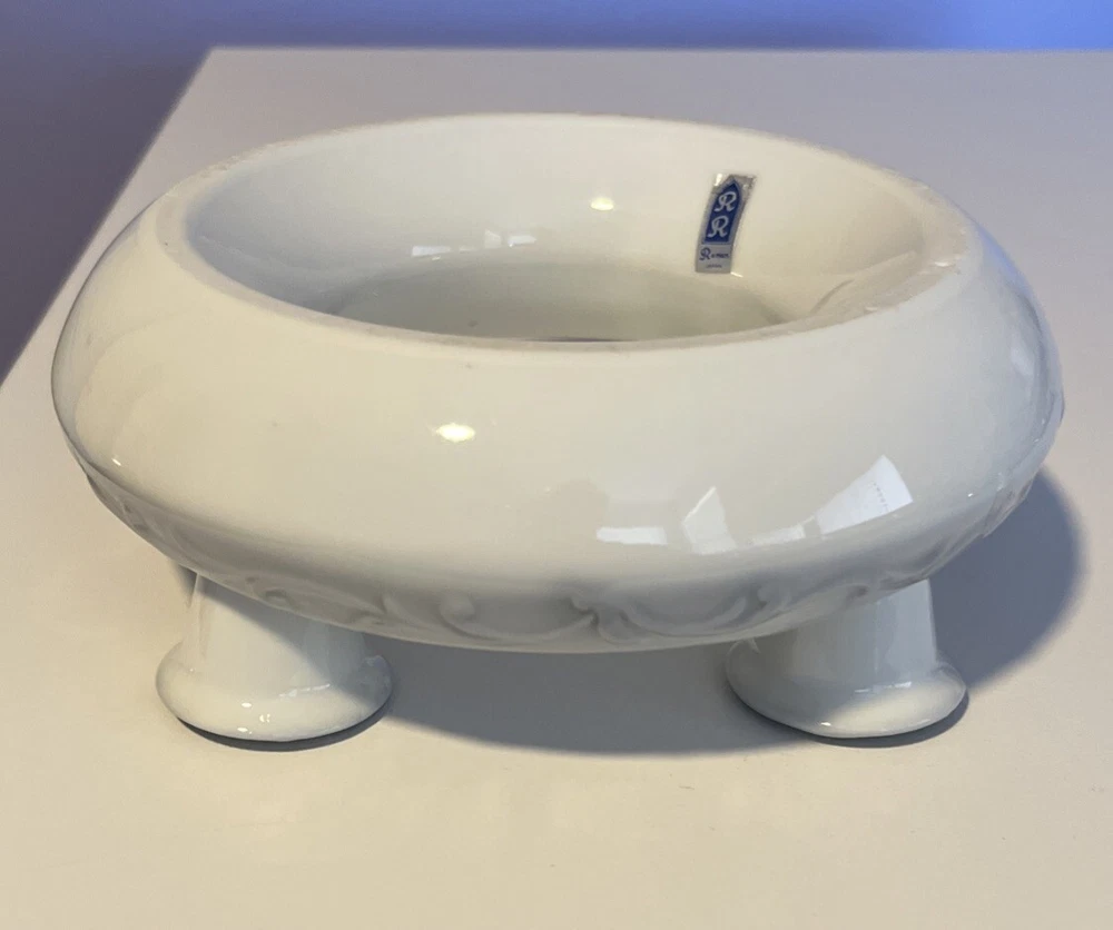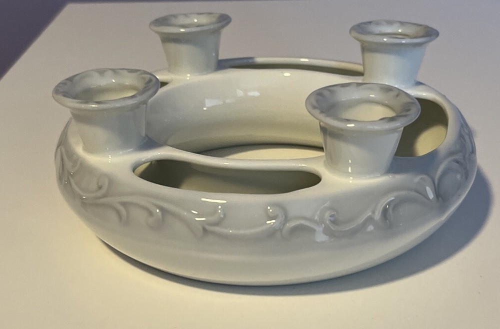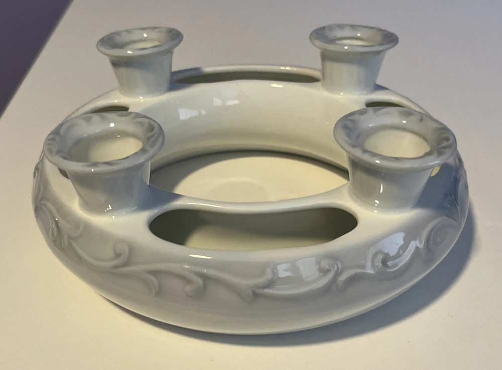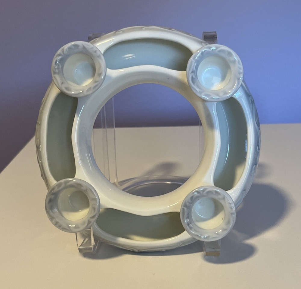 R.R. Roman Blue & White Porcelain Candle Holder Ring 4 Tapers w/Flower Trough - 6" Diameter Please review all pictures carefully as they are part of the description. Questions are welcome.