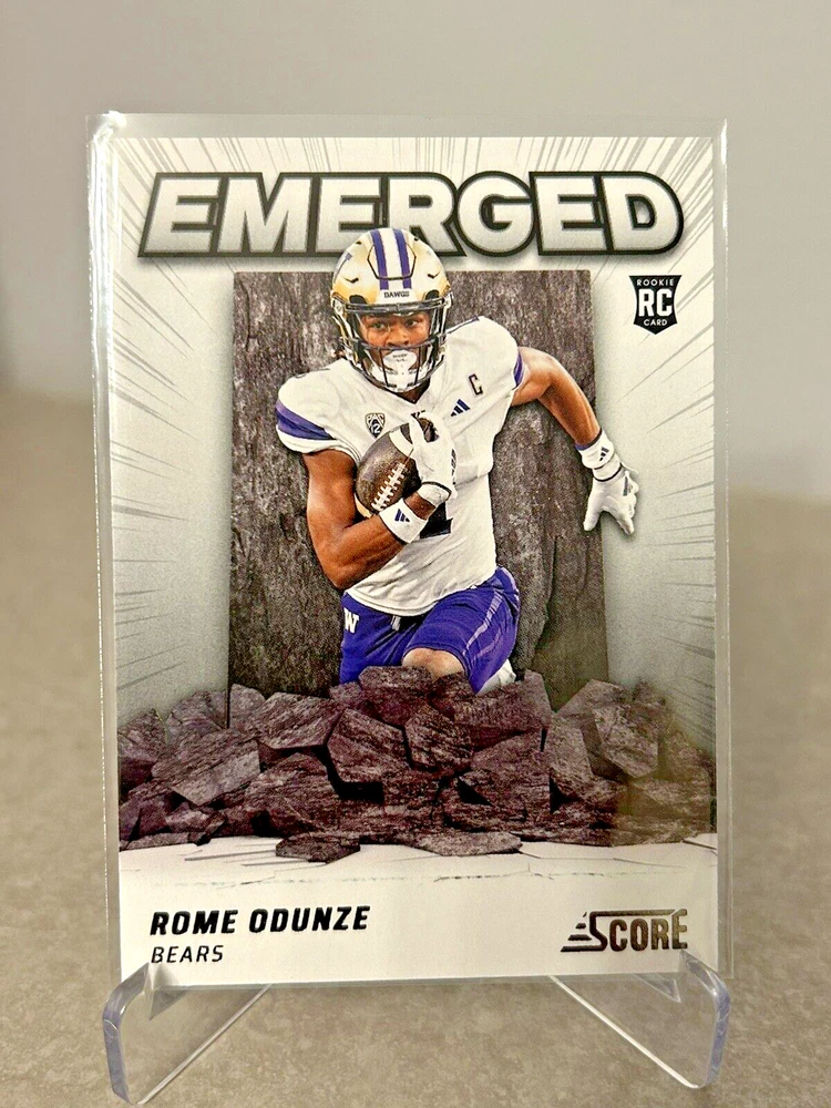 This Panini Score (3) Rookie Cards Hot Rookies & Emerged Inserts features Rome Odunze, a rising star in the National Football League (NFL) playing for the Chicago Bears. The cards are a must-have for any football fan or sports trading card collector, showcasing Odunze's talent and potential. The cards are manufactured in the United States and are in English language. They include features such as Rookie and Insert, making them a unique addition to any collection. With a standard card size, these sports trading cards are perfect for display or storage. Get your hands on this exclusive set of cards and add them to your collection today!
