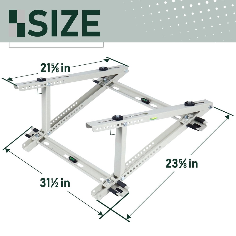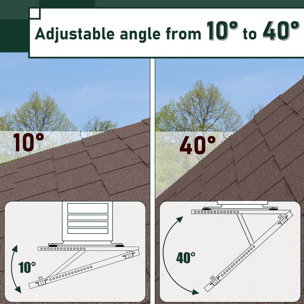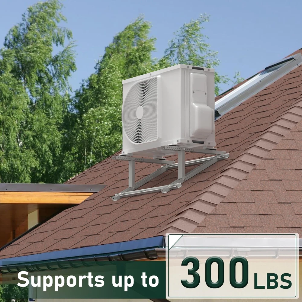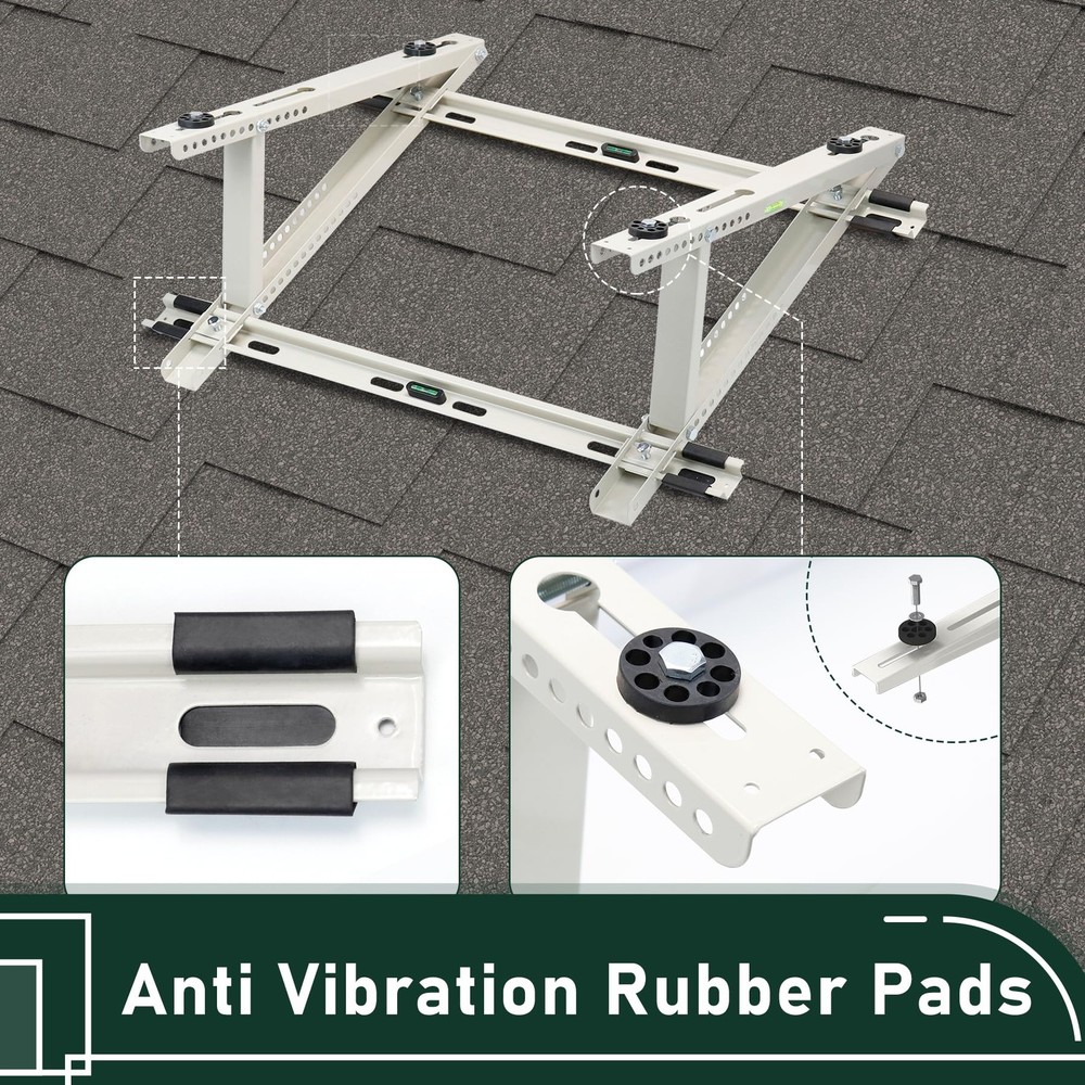 Air Conditioner Rooftop Mount Bracket for Mini Split Air Conditioners Heat Pump System, Adjustable Mounting Bracket for Rooftop, Heavy Duty Roof Bracket for 9,000-24,000 BTU HEAVY DUTY ROOFTOP BRACKET - The roof bracket is made of durable heavy galvanized steel with powder coating, sturdy and weather-proof for outdoor use, support up to 300 lbs SPECIFICALLY DESIGNED FOR ROOF - The adjustable roof bracket can be installed on roofs with a tilt angle from 10° -40°, designed to raise the height of the mini split unit horizontally on pitch roof so that the unit will be stable and run properly ADJUSTABLE DESIGN - The width of the rooftop mount bracket can be adjusted up to from 25-1/2'', compatible with most mini split air conditioner units on the market. Please kindly check your ac unit's size for the best compatibility GREAT AIR CONDITIONER ACCESSORIESS - Equipped with anti-vibration rubber pads on the roof bracket, help to avoid unnecessary movement and reduce vibration noise, prevent the heat pump unit from falling. The bubble level helps to correct mounting position EASY TO USE & INSTALL - The air conditioner rooftop mount bracket can be fast installed on the roof, installation instruction and necessary screws are provided