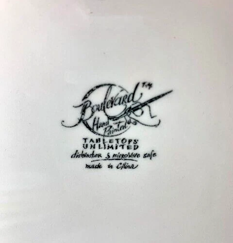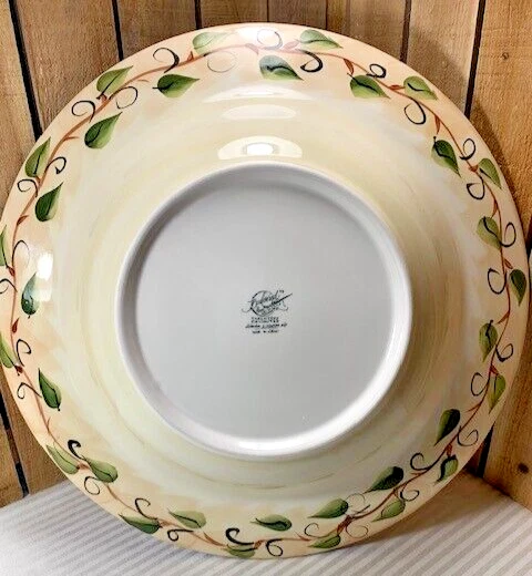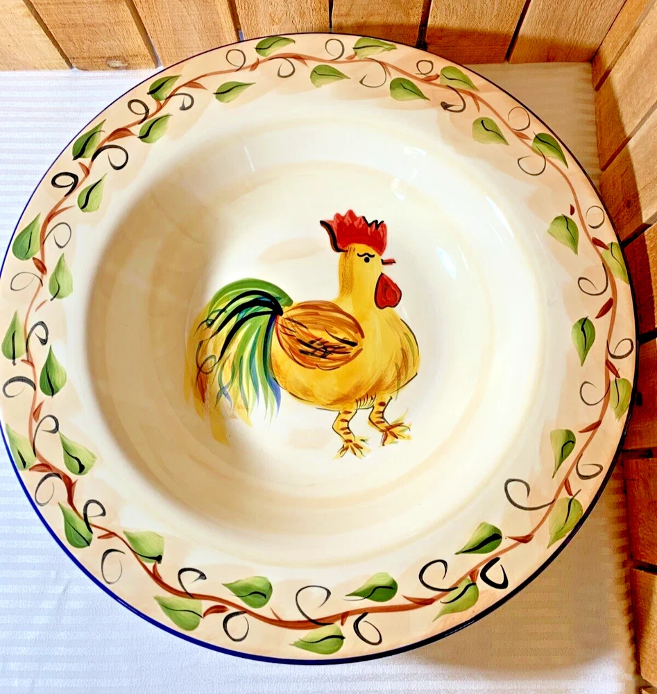 Tabletops Unlimited Boulevard Hand Painted Rooster Serving Bowl. Approximately 14 1/2" diameter, 2 3/4" tall and weighs 4 lb 1 oz. Very good used condition with normal wear from use. No visible cracks or chips. We try to find out as much information as possible on each item we have available. On occasion we may make a mistake and appreciate your feedback. Please see all photos as they are part of the description. We try to list as many details as possible, however some items are vintage and pre-owned so flaws are to be expected.