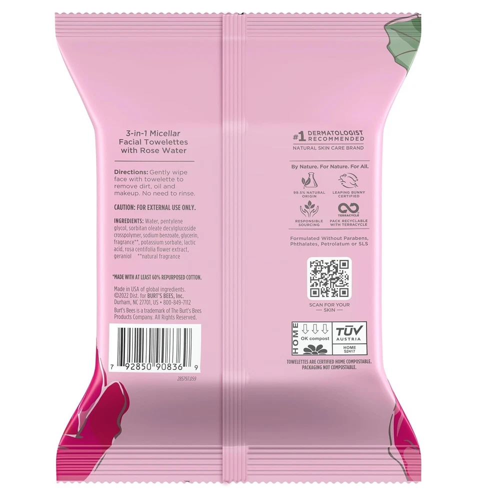 Rose Water Face Wipes, 30 Ct (3-Pack) - Hydrating Micellar Makeup Remover-US About this item FACE WIPES: Micellar Facial Cleansing Towelettes with Rose Water gently cleanse and hydrate your skin and are dermatologist and ophthalmologist tested; packaging may vary MADE FROM UPCYCLED COTTON**: We take cotton scraps left behind from making t-shirts and turn them into certified home compostable** towelettes, helping us all close the loop on waste MAKEUP REMOVER WIPES: These wipes are designed to gently cleanse and tone your skin while removing pore-clogging dirt oil and makeup, leaving only the soothing fragrance of rose water MOISTURES: These rinse-free, home compostable micellar wipes come in a pack with a convenient resealable closure to keep towelettes moist and fresh ONE STEP CLEANSER: These 3 in 1 cleansing towelettes cleanse, remove makeup, hydrate and nourish skin with a 99.5% natural origin formula in one easy step Product Description Gently remove makeup, cleanse and hydrate your skin using Micellar Facial Towelettes With Rose Water. Designed for all skin types, including sensitive skin, these 3-in-1 facial cleanser wipes help to hydrate your skin and remove pore-clogging dirt, oil and makeup in one simple step. The facial cleansing wipes leave skin feeling soft, refreshed and clean with no greasy or oily residue left behind. These 99.5% natural origin gentle face cleanser towelettes are formulated without parabens, phthalates, petrolatum or SLS, made with ingredients from nature and Leaping Bunny Certified (never tested on animals). Each plant-based, super-soft towelette is made with 60% upcycled cotton and is Certified Home Compostable to help close the loop on waste. Simply wipe your face with the makeup remover cloths to remove impurities; theres no need for scrubbing or rinsing. Pair the facial wipes with other Burts Bees facial skin care products, including facial cleansers, facial toners and facial creams. Important information Safety Information For external use only. If irritation occurs, stop use and consult a physician. Do not flush Indications Gently wipe face with towelette to remove dirt and makeup. No need to rinse. Ingredients INGREDIENTS: water, pentylene glycol, rosa centifolia flower extract, sorbitan oleate decylglucoside crosspolymer, glycerin, lactic acid, sodium benzoate, potassium sorbate, fragrance, geraniol natural fragrance Directions Gently wipe face with towelette to remove dirt and makeup. No need to rinse.