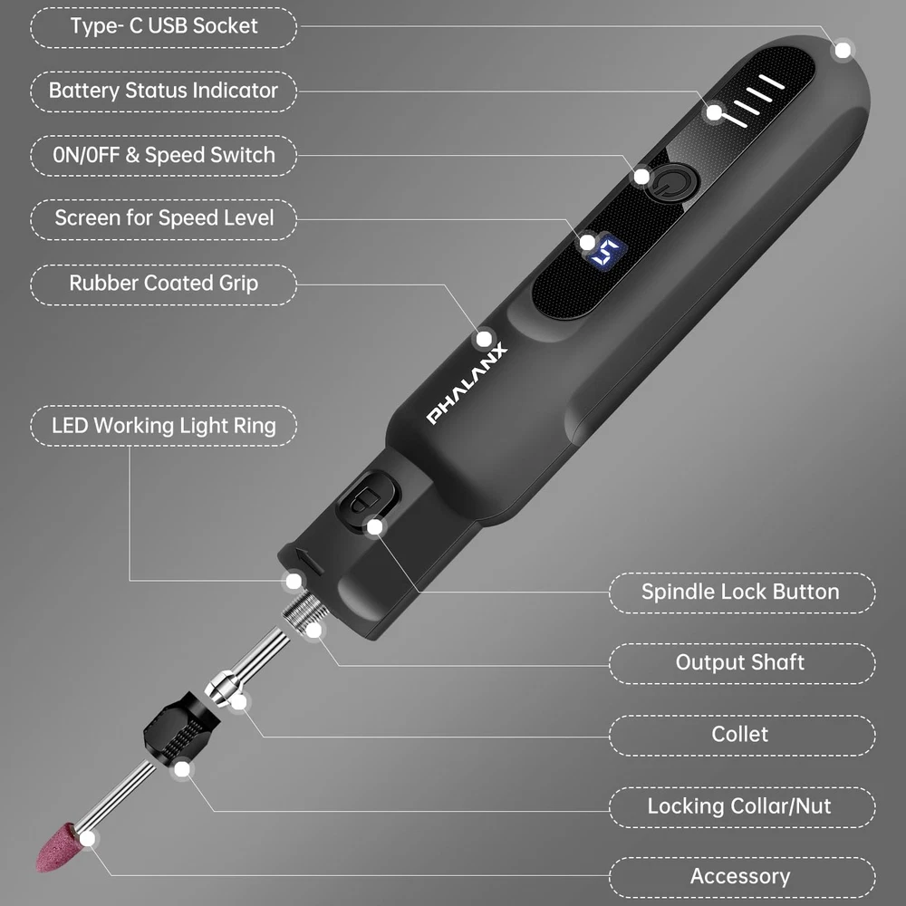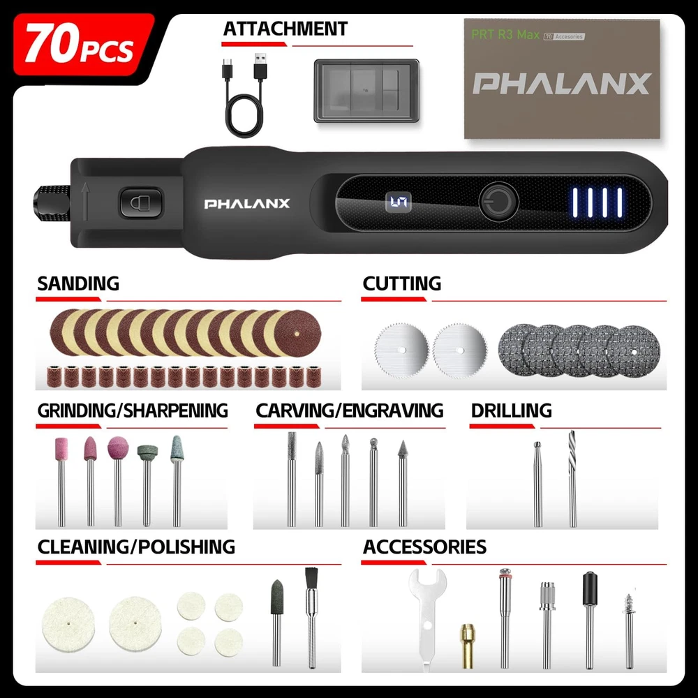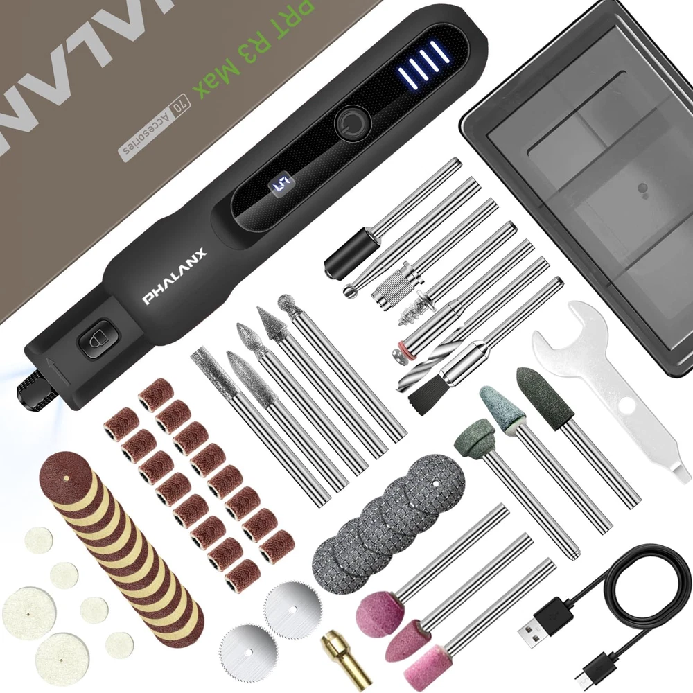 Store New Arrivals Add to Favorite View Feedback Contact Rotary Tool - 3.7V Cordless Rotary Tool Kit LED Ring Work Light, 2.0Ah Li-Ion Battery 5 Speed 70 Accessories Power Rotary Tools 20000Rpm,Mini Rotary Tool Cordless for Light DIY Projects/Precision Work Description Item model number PRT R3 Black Style Modern/Practical/User-friendly Power Source Battery Powered Color Black-3.7v Brand PHALANX Recommended Uses For Product ldeal for light DlY projects and precision work Country of Origin China Battery Cell Type Lithium Ion Package Dimensions 8.19 x 5.16 x 1.65 inches Item Weight 5.3 ounces Batteries 1 Lithium Ion batteries required. (included) Batteries Included? Yes Voltage 3.7 Volts Maximum Rotational Speed 20000 RPM Batteries Required? Yes Minimum Speed 5000 RPM Special Features 1>2000mAh large-capacity battery/Type-C charging interface 2>5-speed transmission setting/LED power and gear display panel 3> 4 LED work lights/70 multi-purpose accessories 4>Cordless design, easy to carry/compact and comfortable to use Size 3.7V Special Feature 1>2000mAh large-capacity battery/Type-C charging interface 2>5-speed transmission setting/LED power and gear display panel 3> 4 LED work lights/70 multi-purpose accessories 4>Cordless design, easy to carry/compact and comfortable to use Number of Batteries 1 Lithium Ion batteries required. (included) Manufacturer PHALANX ๐๐จ๐ฐ๐๐ซ๐๐ฎ๐ฅ ๐๐จ๐ญ๐จ๐ซ & ๐๐จ๐ฐ ๐๐จ๐ฐ๐๐ซ ๐๐จ๐ง๐ฌ๐ฎ๐ฆ๐ฉ๐ญ๐ข๐จ๐ง: PHALANX rotary tool uses an enhanced strong motor, the output is more powerful than the traditional motor, with maximum speed as high as 20000RPM. While effectively controlling vibration and noise to provide stable output. The engraving tool is ideal for polishing and sanding pet nails, Light DIY Projects, and Wood Sanding. (Please fully charge the rotary tool cordless before the first use) ๐-๐๐ฉ๐๐๐ ๐๐๐ญ๐ญ๐ข๐ง๐ ๐ฌ & ๐๐๐ ๐๐ข๐ง๐ ๐๐จ๐ซ๐ค ๐๐ข๐ ๐ก๐ญ: PHALANX mini rotary tool has 5-speed variable speed adjustment from 5,000 to 20,000 RPM, can meet the gears and speeds required for different light load projects. The power rotary tool is equipped with 4 high-brightness LED work lights around the rotating drill bit, illuminating the entire work area in low-light environments, reducing backlight shadows, ensuring work accuracy. For example, polishing pet nails or resin objects. ๐๐ง๐ญ๐๐ฅ๐ฅ๐ข๐ ๐๐ง๐ญ ๐๐๐ฆ๐จ๐ซ๐ฒ & ๐๐จ๐ฆ๐ฉ๐๐๐ญ ๐๐ข๐ ๐ก๐ญ๐ฐ๐๐ข๐ ๐ก๐ญ: PHALANX cordless rotary tool will intelligent memory function for the current set gear within 5 minutes of shutdown. After 5 minutes, it will return to the default 3rd speed, no need to frequently adjust the tool speed when shutting down the machine to check the work. The anti-slip rubber layer on the surface of the mini grinding tool makes it comfortable to hold and you will not feel tired when working for a long time. ๐๐๐ซ๐ ๐ ๐๐๐ฉ๐๐๐ข๐ญ๐ฒ ๐๐๐ญ๐ญ๐๐ซ๐ฒ & ๐๐ฒ๐ฉ๐-๐ ๐ ๐๐ฌ๐ญ ๐๐ก๐๐ซ๐ ๐ข๐ง๐ : PHALANX rotary tool cordless has built-in a 2000mAh battery, ensure that the polishing tool runs longer. Mini power tools have built-in integrated power and gear display panel display clearly, so there is no need to worry about the battery suddenly running out. Type-C charging interface and charging cable, compatible with various USB output device power sources and can be easily charged anytime and anywhere. ๐๐ข๐๐ก ๐๐๐๐๐ฌ๐ฌ๐จ๐ซ๐ข๐๐ฌ & ๐๐ข๐ซ๐๐ฅ๐๐ฌ๐ฌ ๐๐๐ฌ๐ข๐ ๐ง: PHALANX rotary tool kit comes with 70 different practical accessories, it has strong compatibility, ideal for a variety of grinding, polishing, sanding, engraving and more light projects. Wood engraving tool wireless design meets the needs of outdoor work, saying goodbye to the entanglement of sockets and wires. Cordless rotary tools are an amazing tool for handmade crafts and DIY enthusiasts! Product Description The video showcases the product in use. The video guides you through product setup. The video compares multiple products. The video shows the product being unpacked. 1 3.7V Rotary Tool Kit 2 Aluminum Alloy Collet 3 5 Levels Adjustable Speed 4 Led Working Light Ringe 5 2000mAh Battery PHALANX ROTARY TOOL COMPARISON Add to Cart Add to Cart Add to Cart Add to Cart Customer Reviews 4.2 out of 5 stars 478 4.6 out of 5 stars 216 4.8 out of 5 stars 71 4.4 out of 5 stars 19 4.8 out of 5 stars 71 Price $25.99 $ 25 . 99 $35.99 $ 35 . 99 $42.99 $ 42 . 99 $23.99 $ 23 . 99 โ Duty Level Light Light+ Medium Light High Application - General Yes Yes Yes Yes, for Pet Nail Grooming Yes Application - Heavy Not Recommended Not Recommended Yes, Medium Duty Not Recommended Yes Cordless / Corded Cordless / 3.7V DC Cordless / 4V Max DC Cordless / 8V Max DC Cordless / 3.7V DC โ Battery Information 2.0Ah Li-Ion Battery 4.0Ah Li-Ion Battery 3.0Ah Li-Ion Battery 2.0Ah Li-Ion Battery โ Charger Type Type C Charging / 5V 1A Max Type C Charging / 5V 2A Max Type C Charging / 5V 2A Max Type C Charging / 5V 1A Max โ Speed /Range (rpm) 5 Speeds /5,000-20,000 rpm 9 Speeds /6,000-28,000 rpm 5 Speeds /5,000-30,000 rpm 5 Speeds /5,000-20,000 rpm โ Speed / Battery Indicator Yes (Digital Display / 4LED) Yes (Digital Display / 5LED) Yes (5LED/4LED) Yes (Digital Display / 4LED) โ LED Working Light Yes No No Yes โ Soft Grip Yes๏ผFull Rubber Coated Yes๏ผClose Fit Design Yes Yes๏ผFull Rubber Coated โ Accessories Quantity 70 Pcs 80 Pcs 106 Pcs 40 Pcs 420 Pcs Storage Blister Case+ Color Box Compact Plastic Case Sturdy BMC Box Nylon Bag (EVA Lining) Sturdy Plastic Box ABOUT US We offer the best prices around on high 