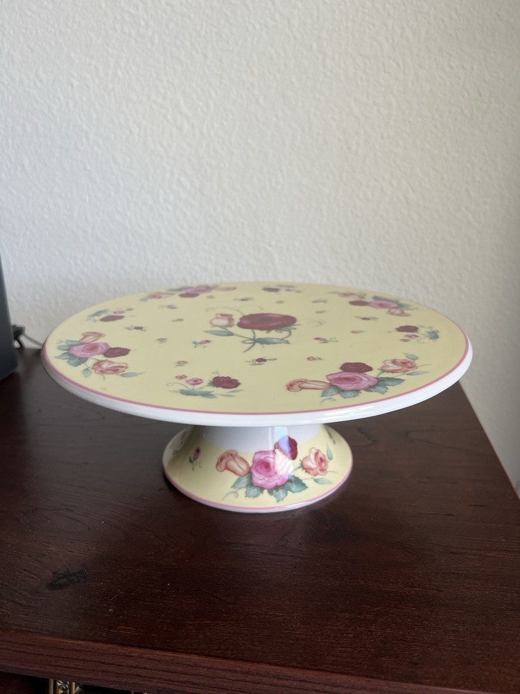 The Royal Limited Ceramic Roses Cake Plate Pedestal Stand in Yellow and Pink is a decorative and elegant piece perfect for all occasions. Made of porcelain with a glossy finish, this round pedestal stand features a beautiful floral pattern of roses, adding a touch of charm to any table setting. With a diameter of 11 inches and a height of 4 inches, this piece is a stylish addition to any home decor, especially for those who appreciate art pottery production style.